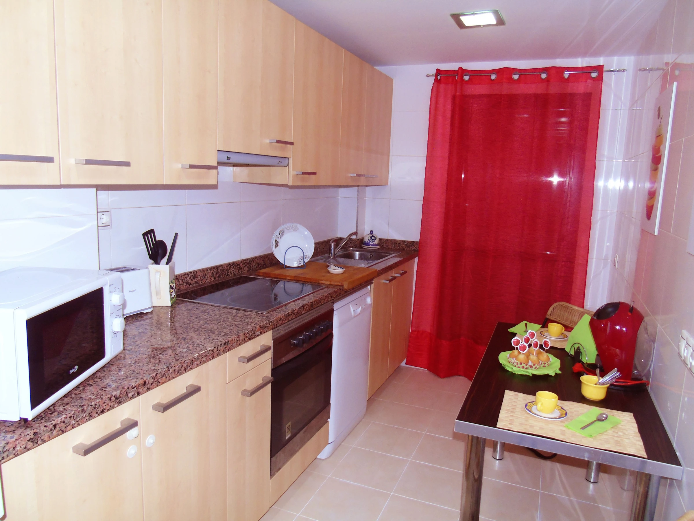 Dieses separate küche, mit ceranfeld, ist ausgestattet in kühlschrank, mikrowelle, backofen, gefrierschrank, geschirr/besteck, kochutensilien, kaffeemaschine, toaster und wasserkocher.