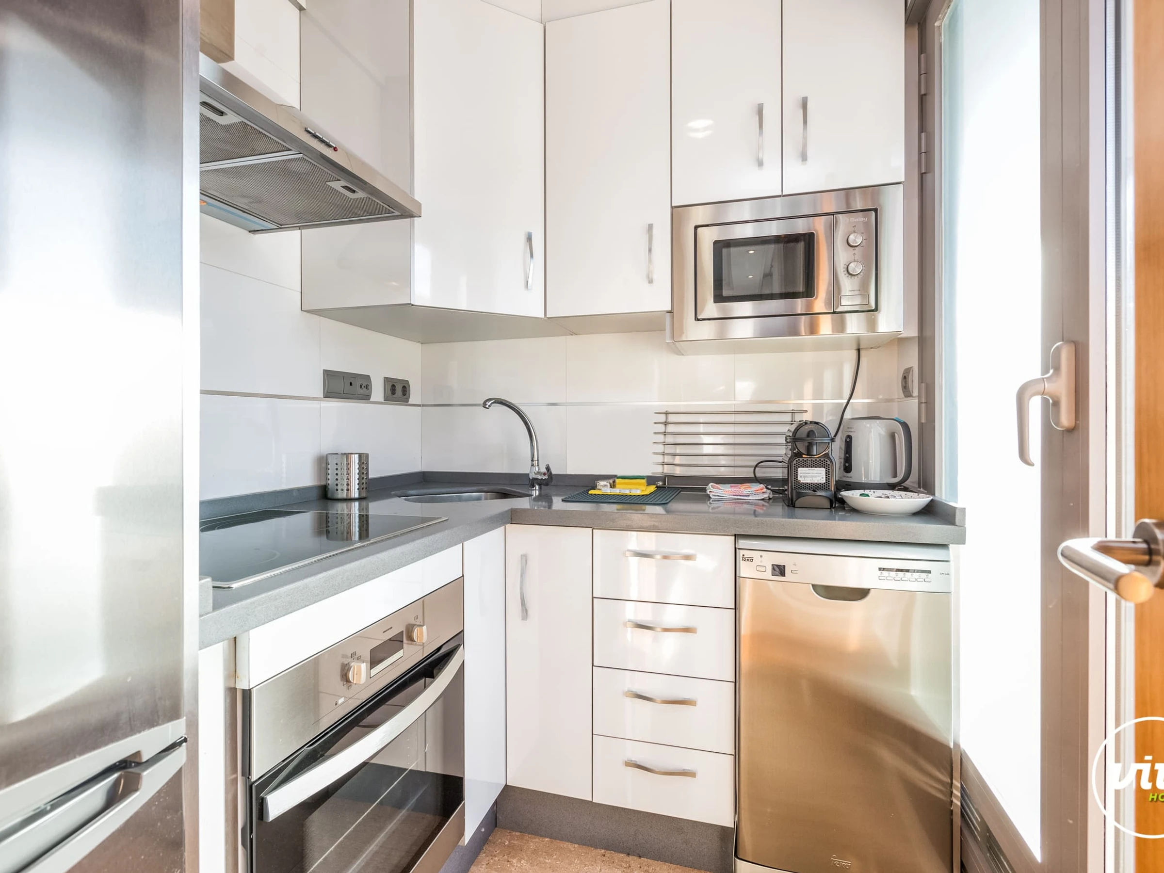 Dieses separate küche, mit induktions-kochfeld, ist ausgestattet in kühlschrank, mikrowelle, backofen, gefrierschrank, spülmaschine, geschirr/besteck, kochutensilien, kaffeemaschine und wasserkocher.