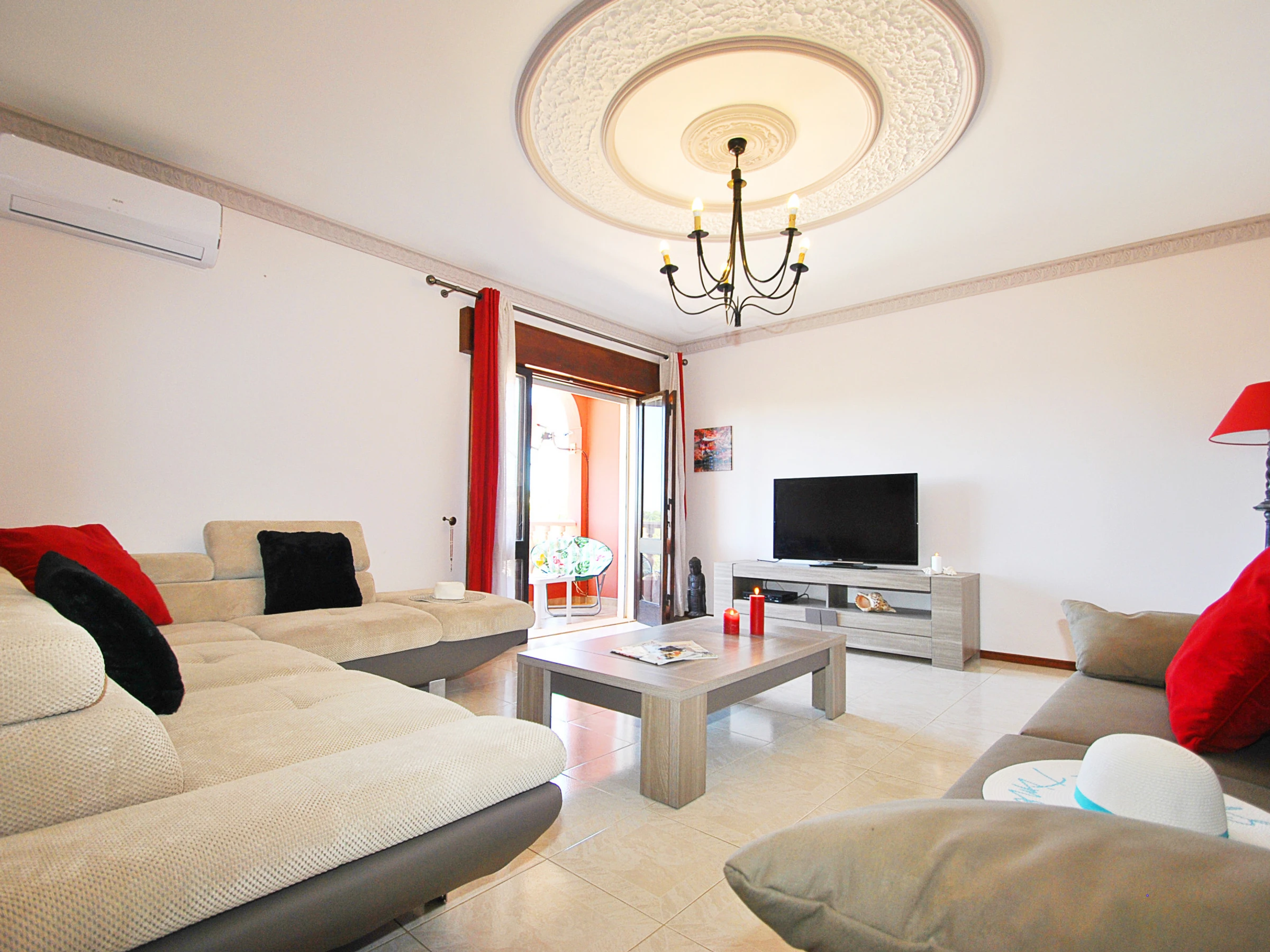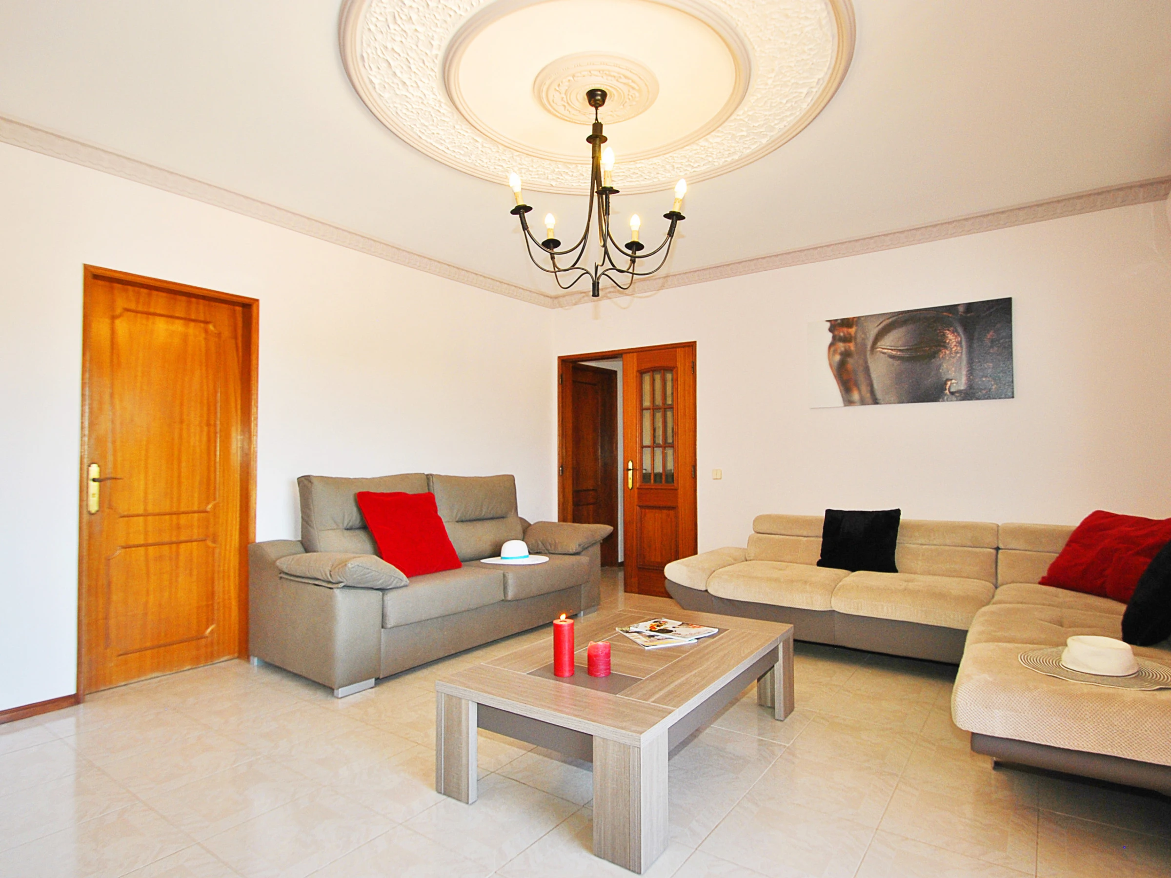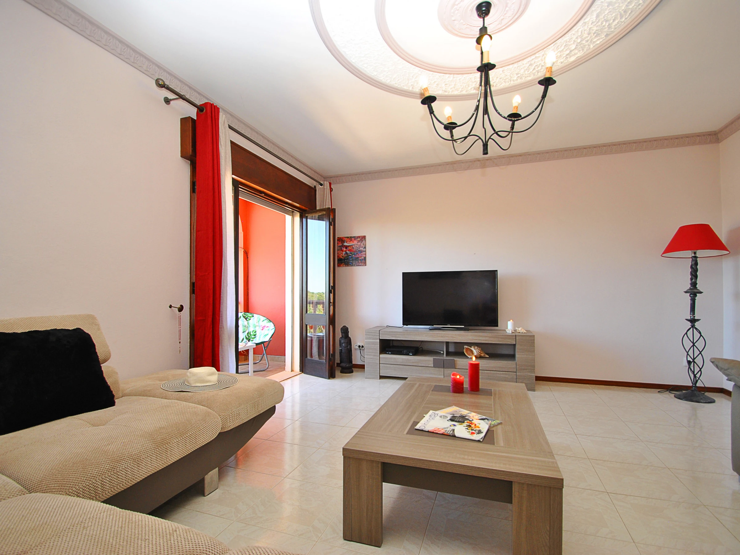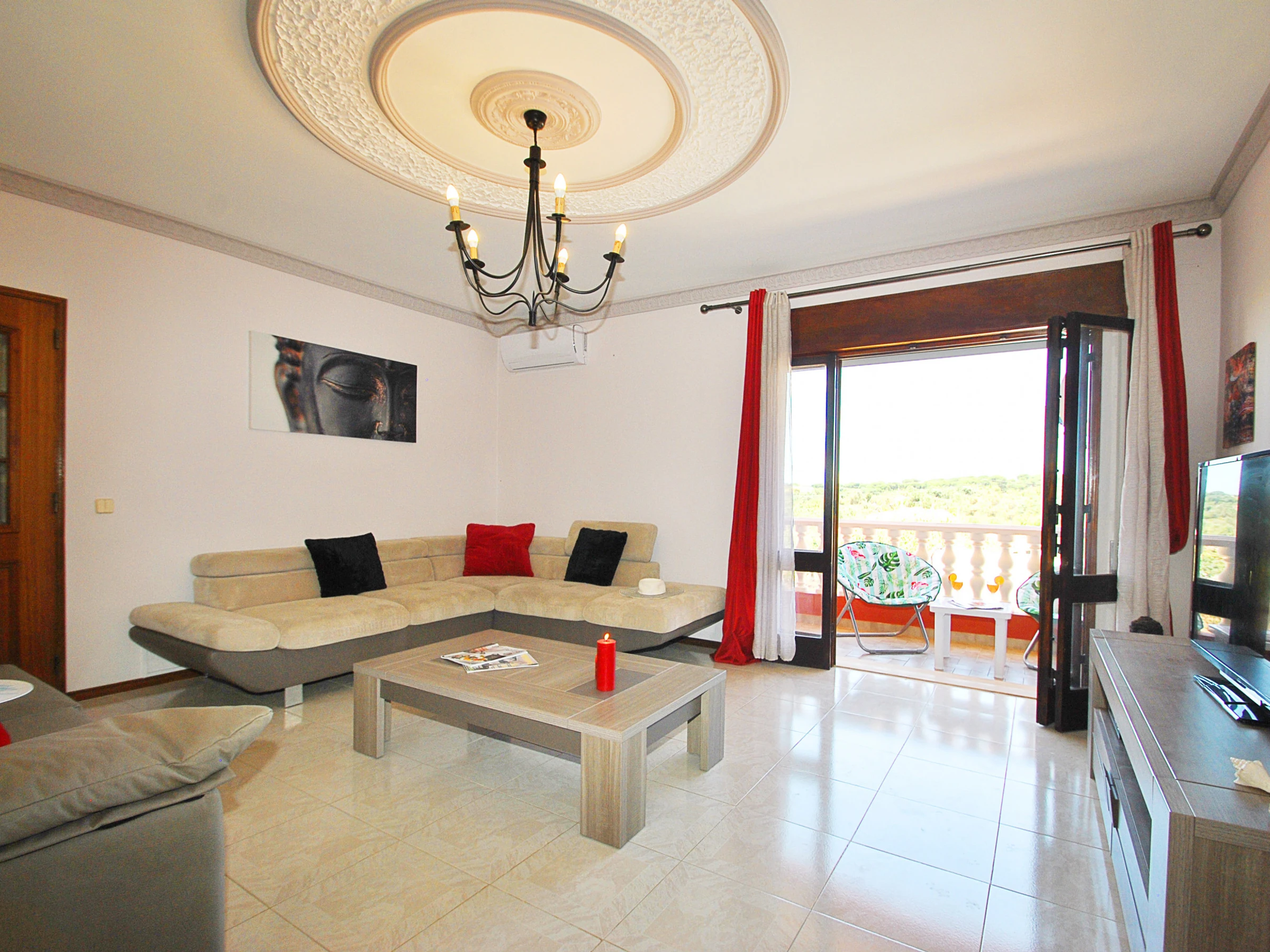Das Wohnzimmer ist geräumig und hell, mit direktem Zugang zu einem Balkon mit offenen Blicken über das Feld, was eine einladende Atmosphäre für Momente der Erholung und Gruppengemeinschaft schafft.