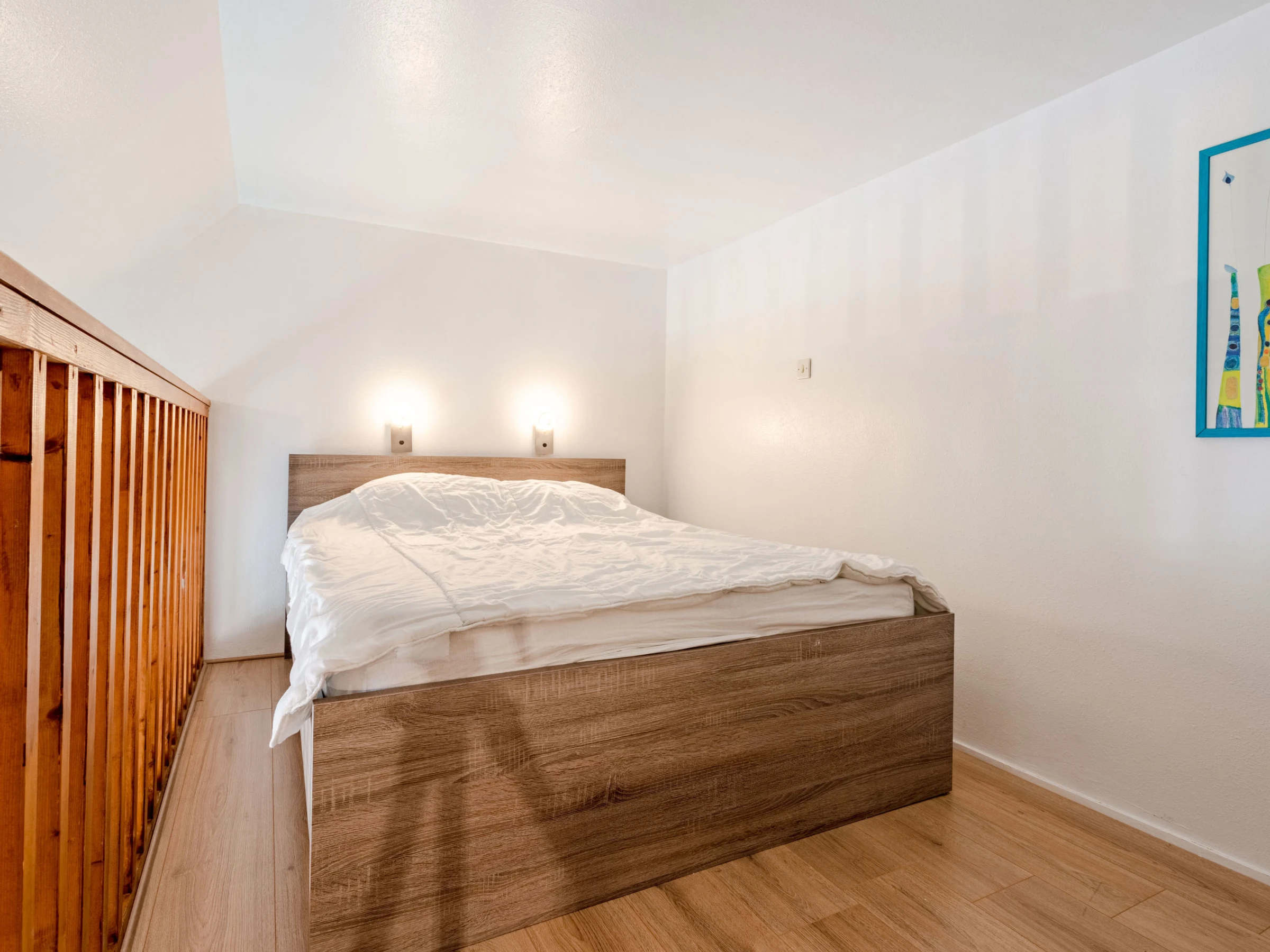 1-Zimmer-Studio 27 m2 auf 2 Stockwerken im 3. Stock, Ostlage. Wohn-/Esszimmer mit TV (Flachbildschirm). Ausgang zum Balkon. Kochnische (4 Kochplatten, Backofen, Toaster, Wasserkocher, Mikrowelle, elektrische Kaffeemaschine). Dusche/WC. E-Heizung. Obergeschoss: (steile Treppe) abgeschrägte Galerie mit 1 x 2 Etagenbetten (90 cm, Länge 190 cm), 1 franz. Bett (140 cm, Länge 190 cm). Balkon 5 m2. Zur Verfügung: Waschmaschine. Internet (Wireless LAN, extra). Bitte beachten: Rauchmelder, kein Fahrstuhl. Anstelle eines abgeschlossenen Schlafzimmers befinden sich manche Schlafplätze in einem offenen Bereich (Galerie, Nische etc.). Inserat einer Privatperson nach Artikel 155, IV, CGI.