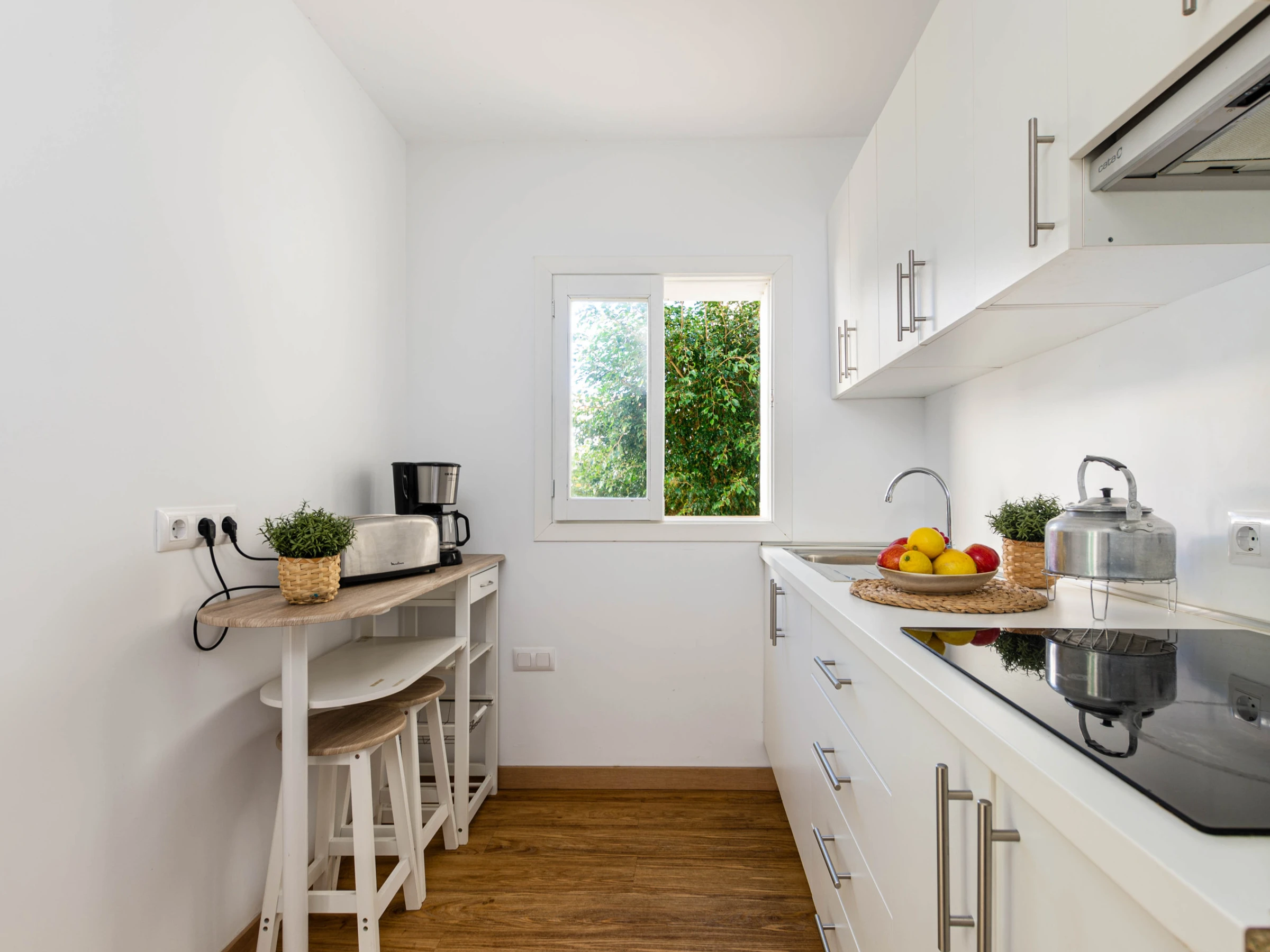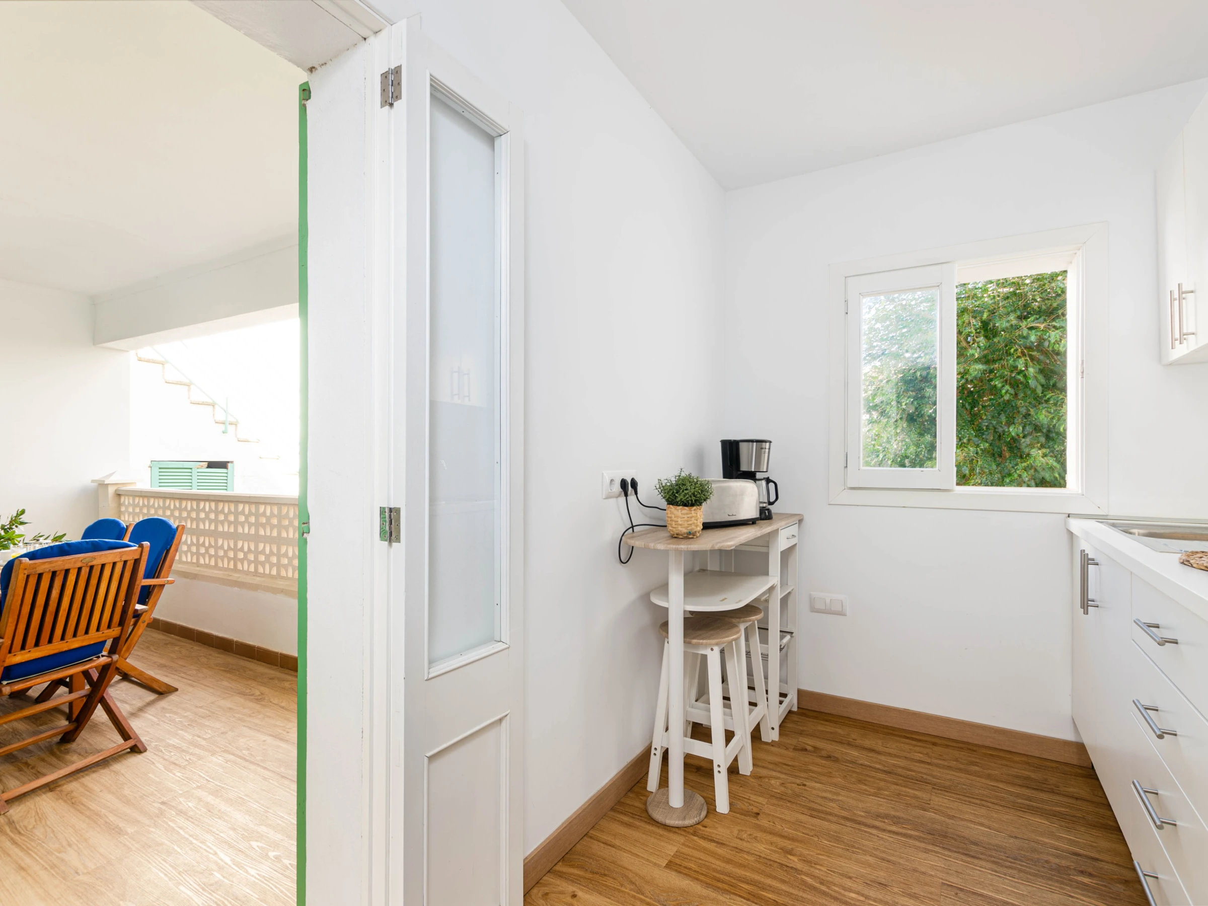 Die Villa verfügt über eine möblierte Terrasse mit Blick auf den Garten – ideal für Mahlzeiten im Freien oder entspannte Momente. Im Garten findet man eine Aussendusche sowie einen kleinen Grill. Im angrenzenden Raum befinden sich eine Waschmaschine, ein Trockner, Mülleimer, Reinigungsutensilien, ein Erste-Hilfe-Kasten, ein Bügeleisen und ein Bügelbrett. Die Terrasse bietet Zugang zum Wohn-Essbereich mit Sat-TV und Klimaanlage. Danach folgt die separate Küche, die mit einem Elektroherd, einem Toaster, einer Filterkaffeemaschine, einer Dolce-Gusto-Maschine und allen notwendigen Utensilien ausgestattet ist.