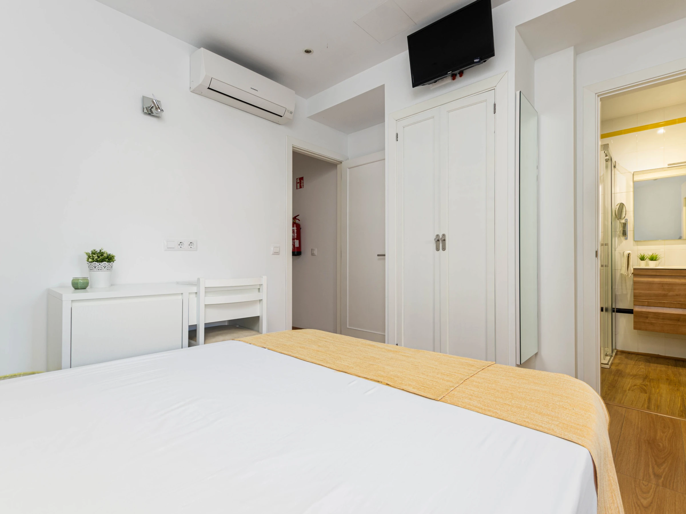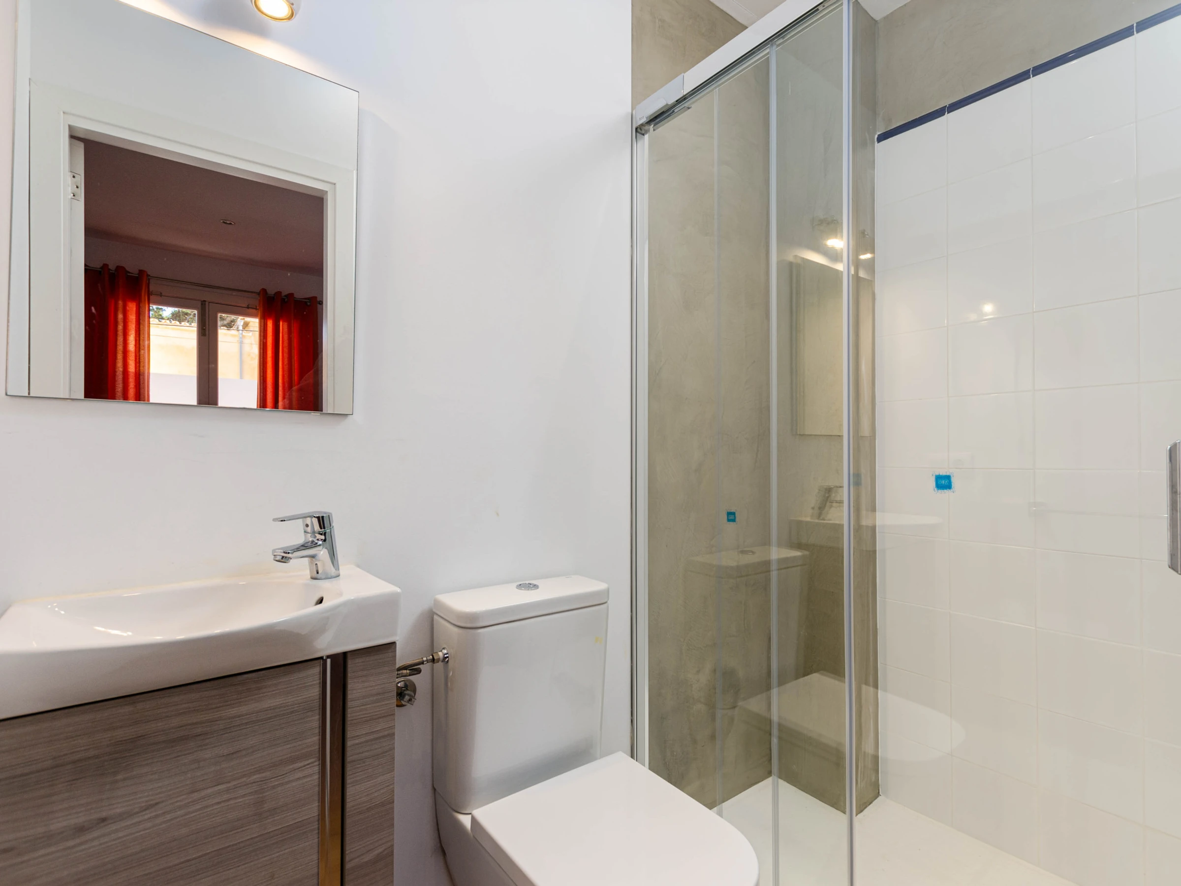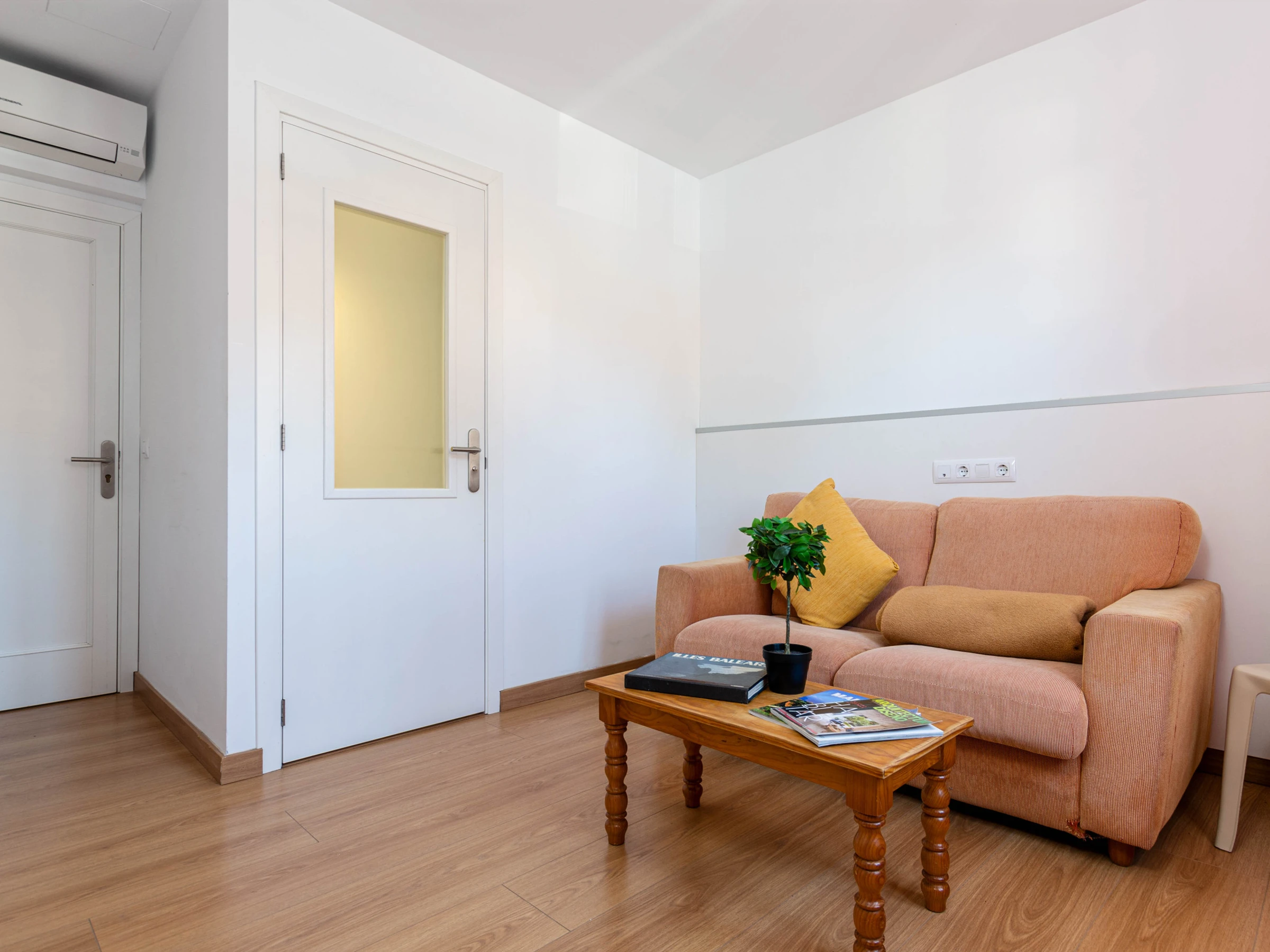 Außerdem gibt es im Erdgeschoss einen kleinen Wohnbereich mit Klimaanlage sowie ein Badezimmer mit Dusche.