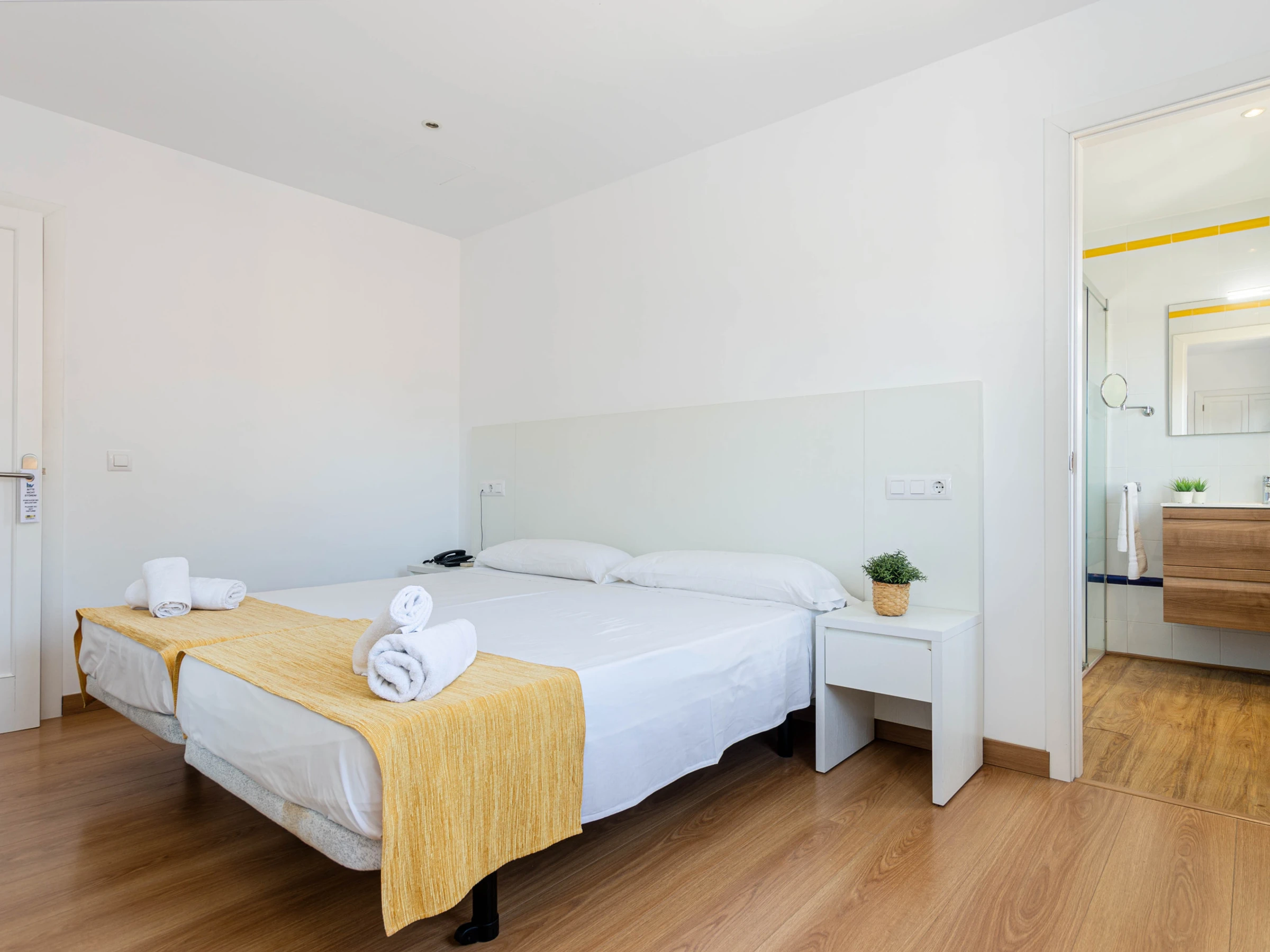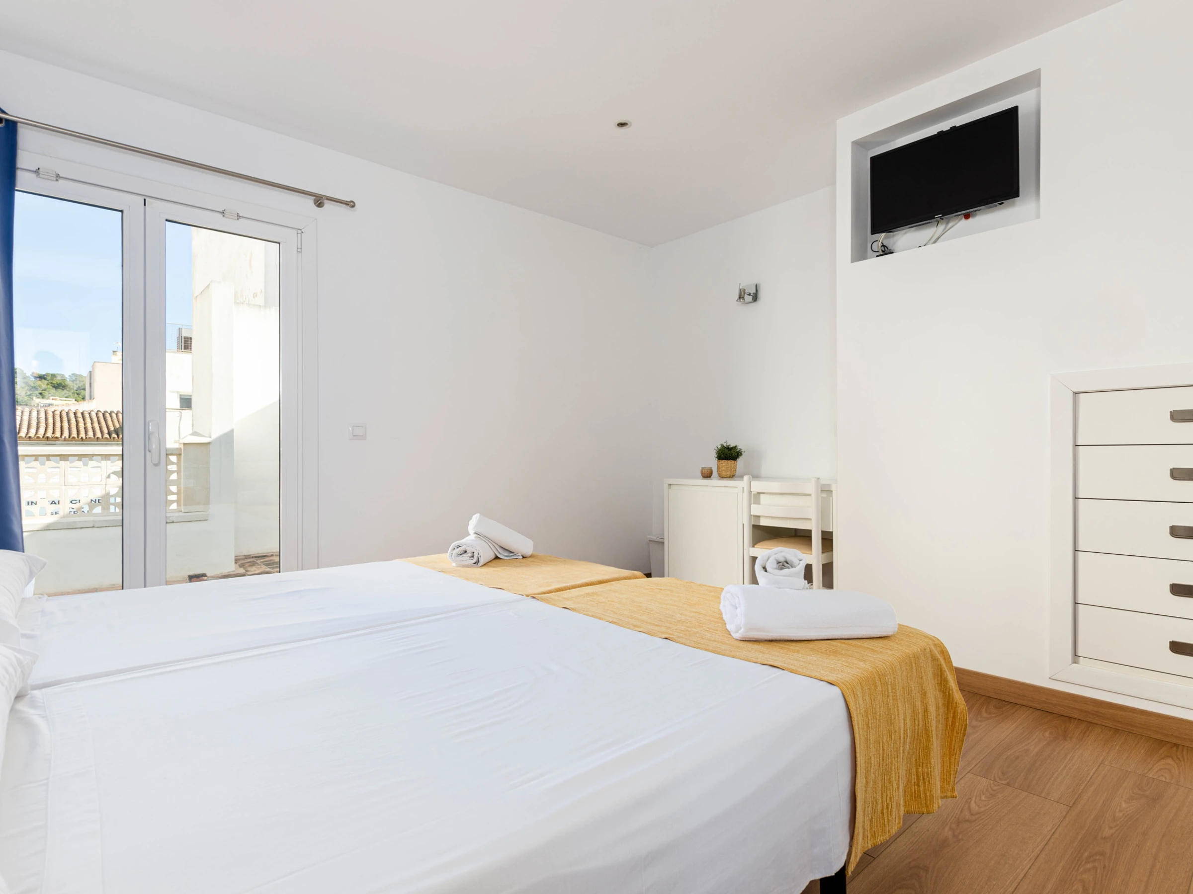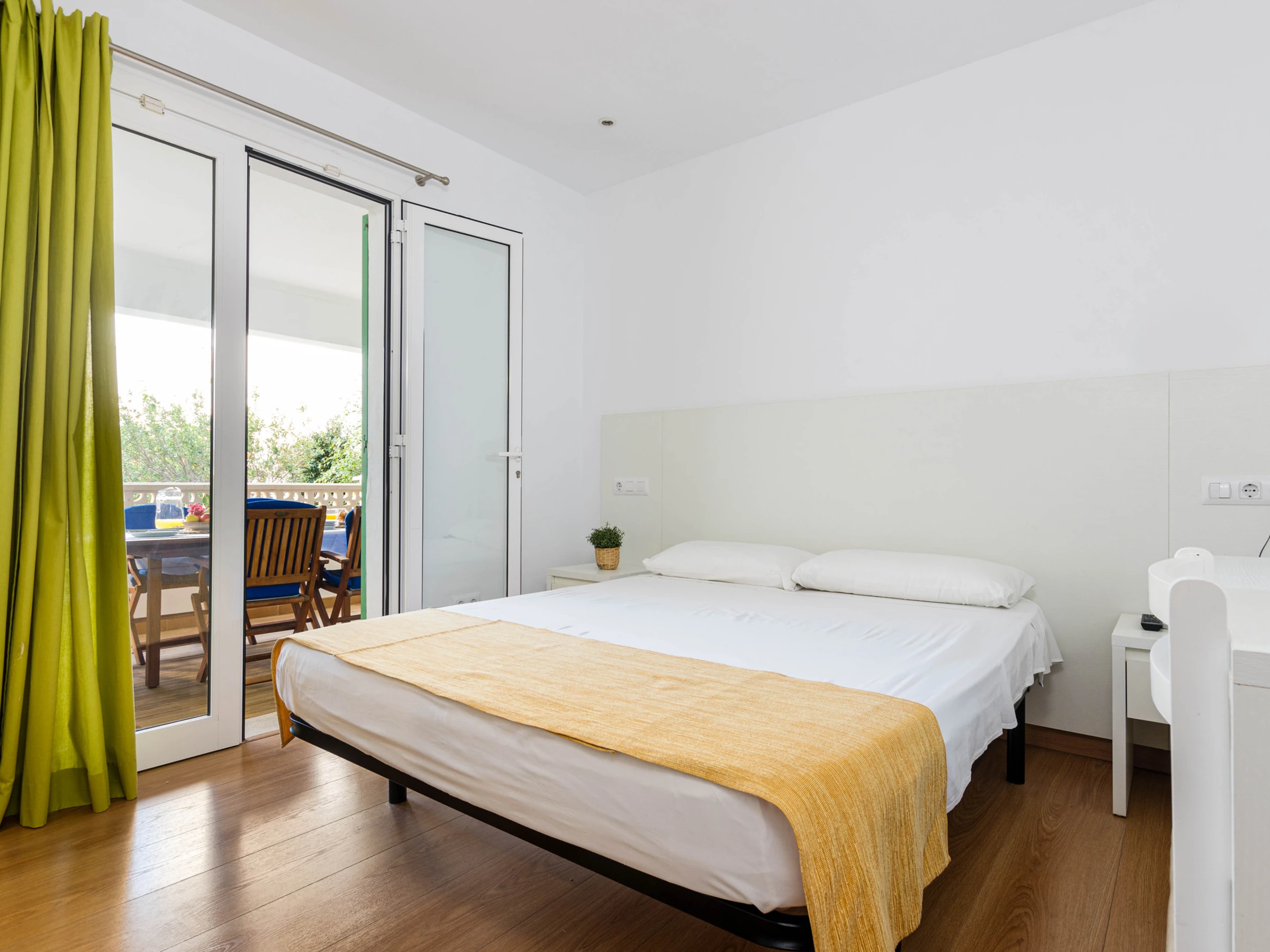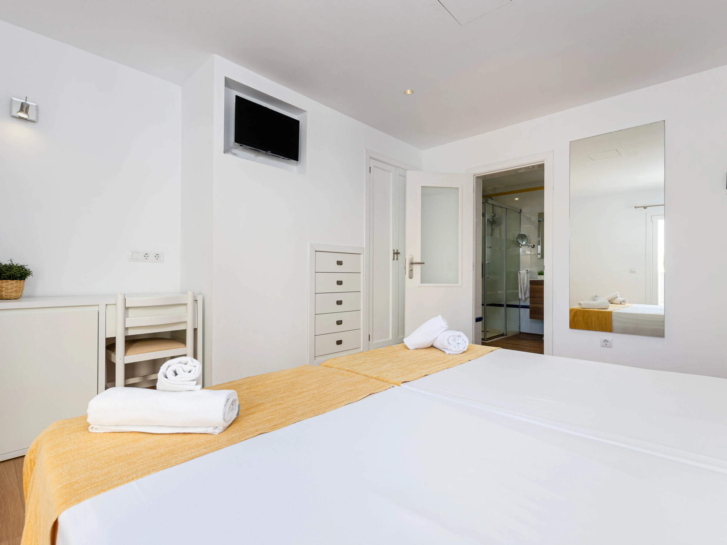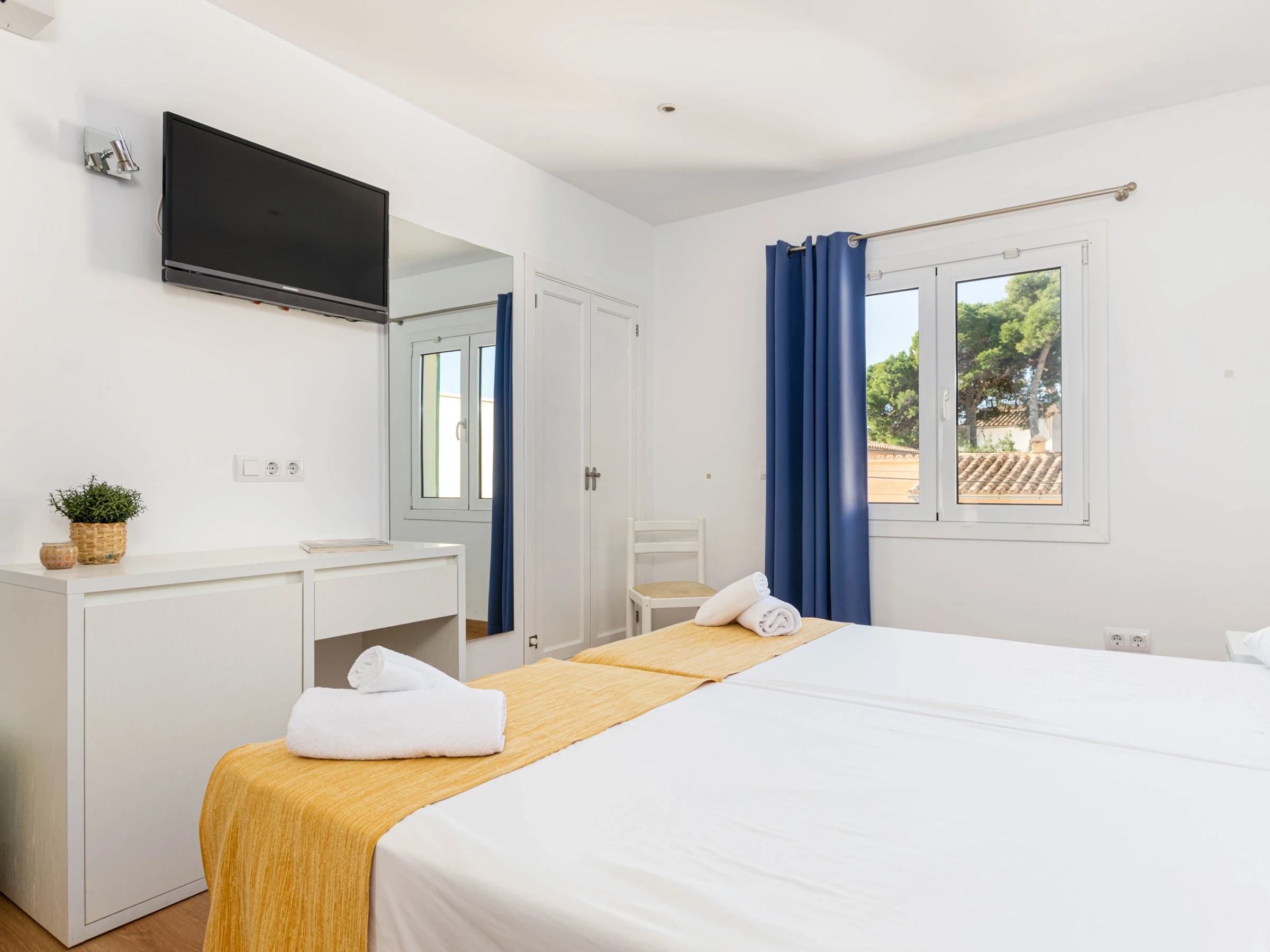 Das Schlafzimmer im Erdgeschoss mit einem Doppelbett (1,5 x 1,9 Meter) hat ebenfalls Zugang zur Terrasse. Zusätzlich gibt es ein weiteres Schlafzimmer mit zwei Einzelbetten auf dieser Etage. Beide Zimmer sind mit Klimaanlage, Sat-TV, einem eigenen Bad mit Dusche und Haartrockner sowie einem Kleiderschrank ausgestattet. Für Familien mit Kleinkindern stehen auf Anfrage ein Babybett und ein Hochstuhl zur Verfügung.