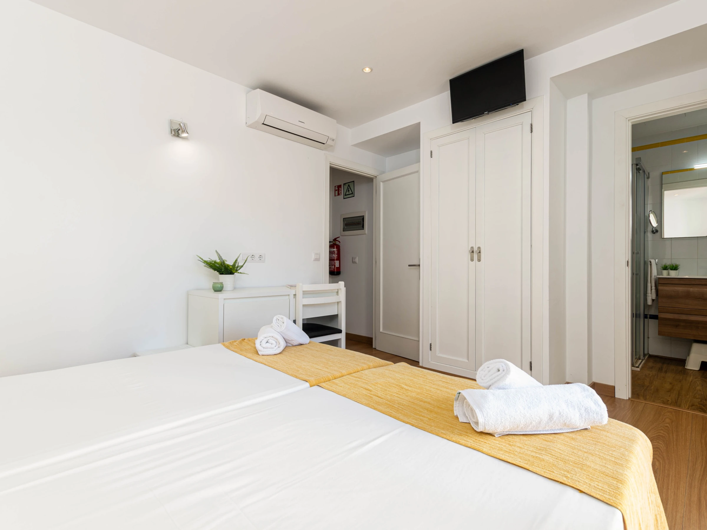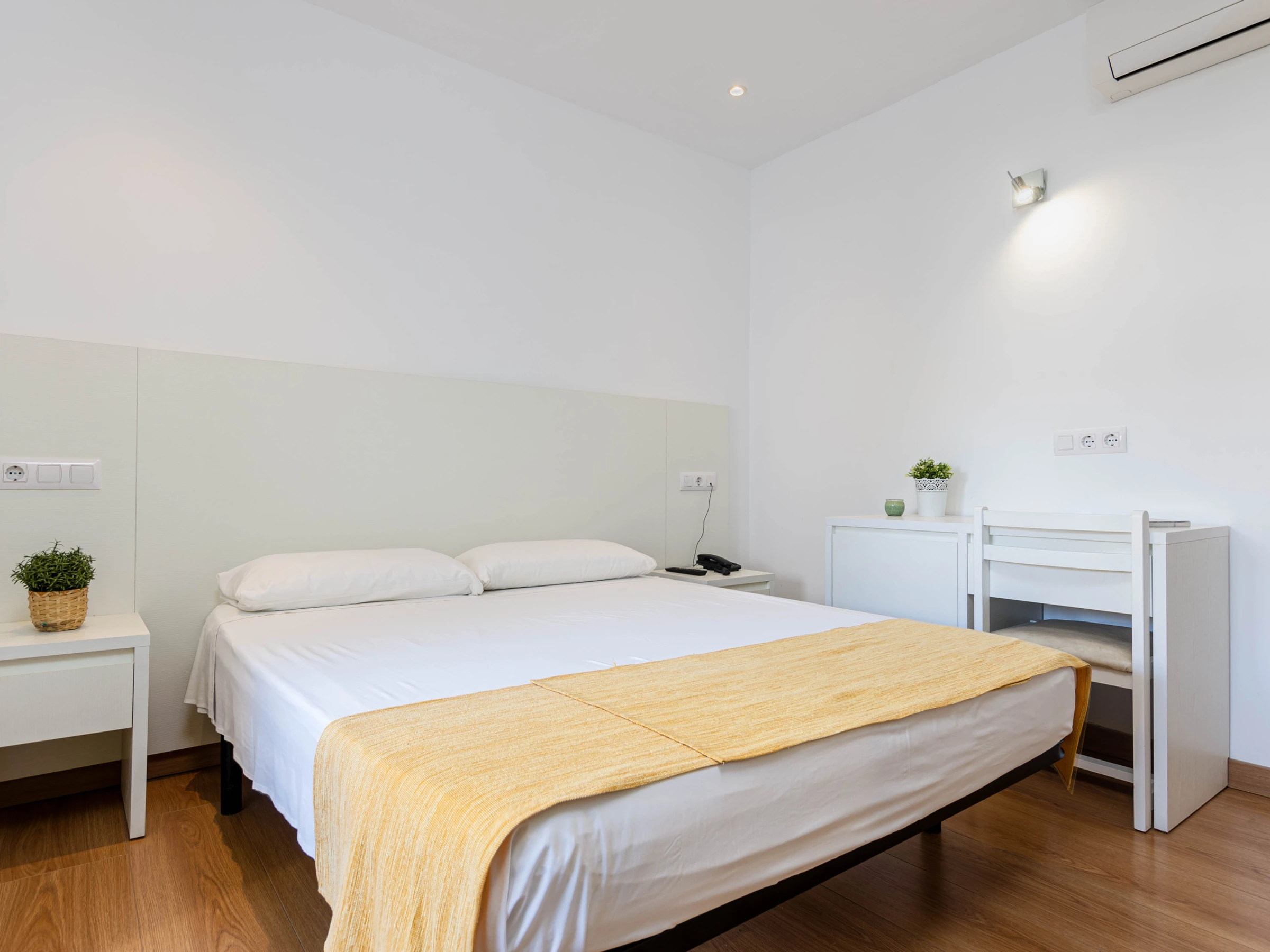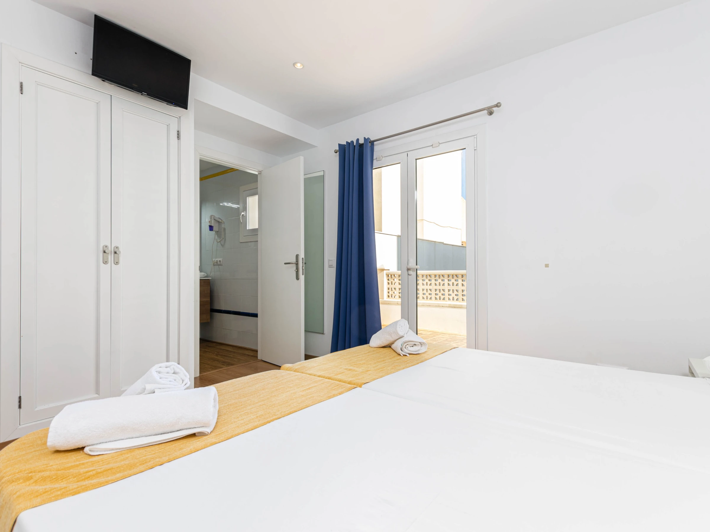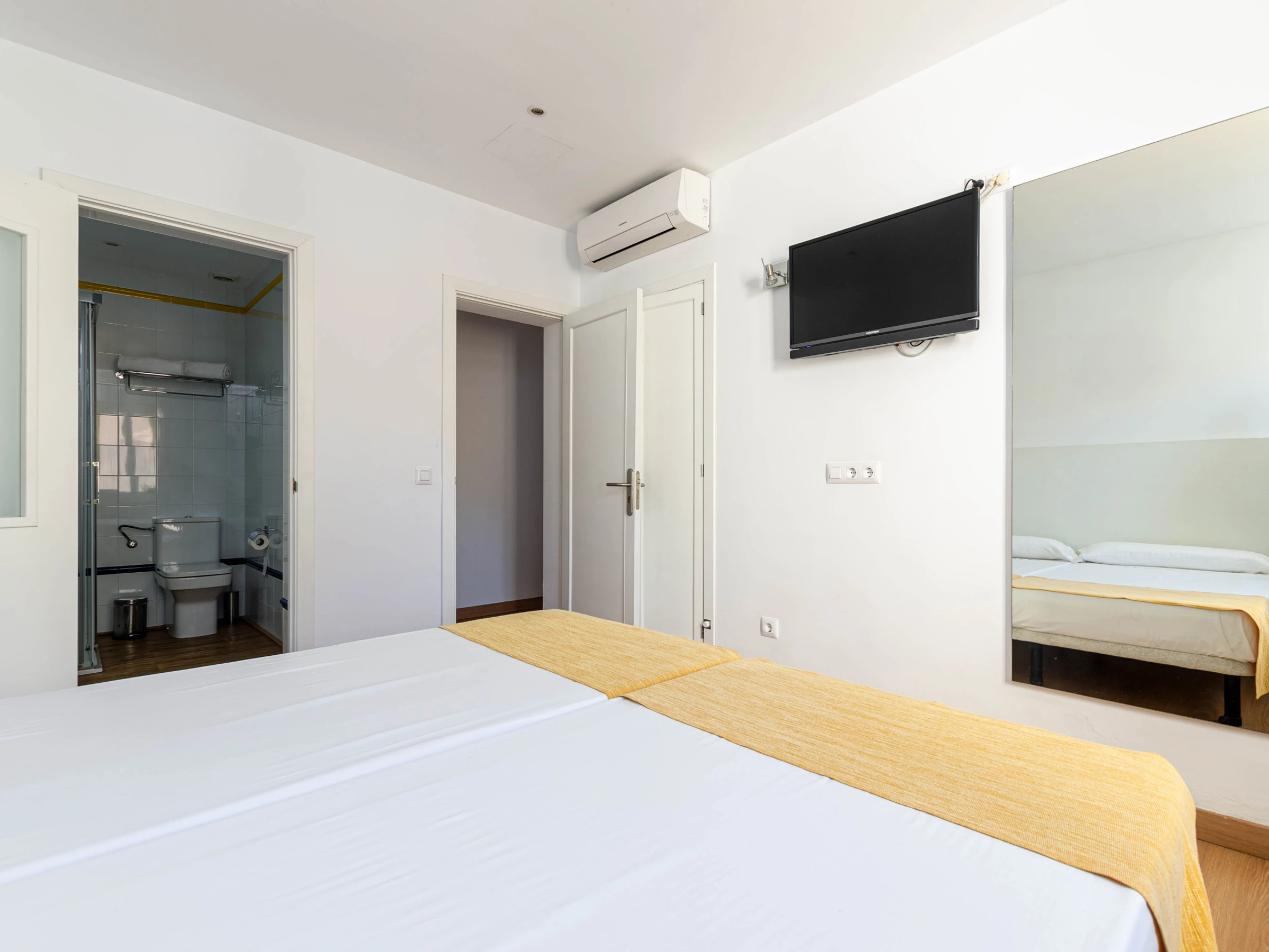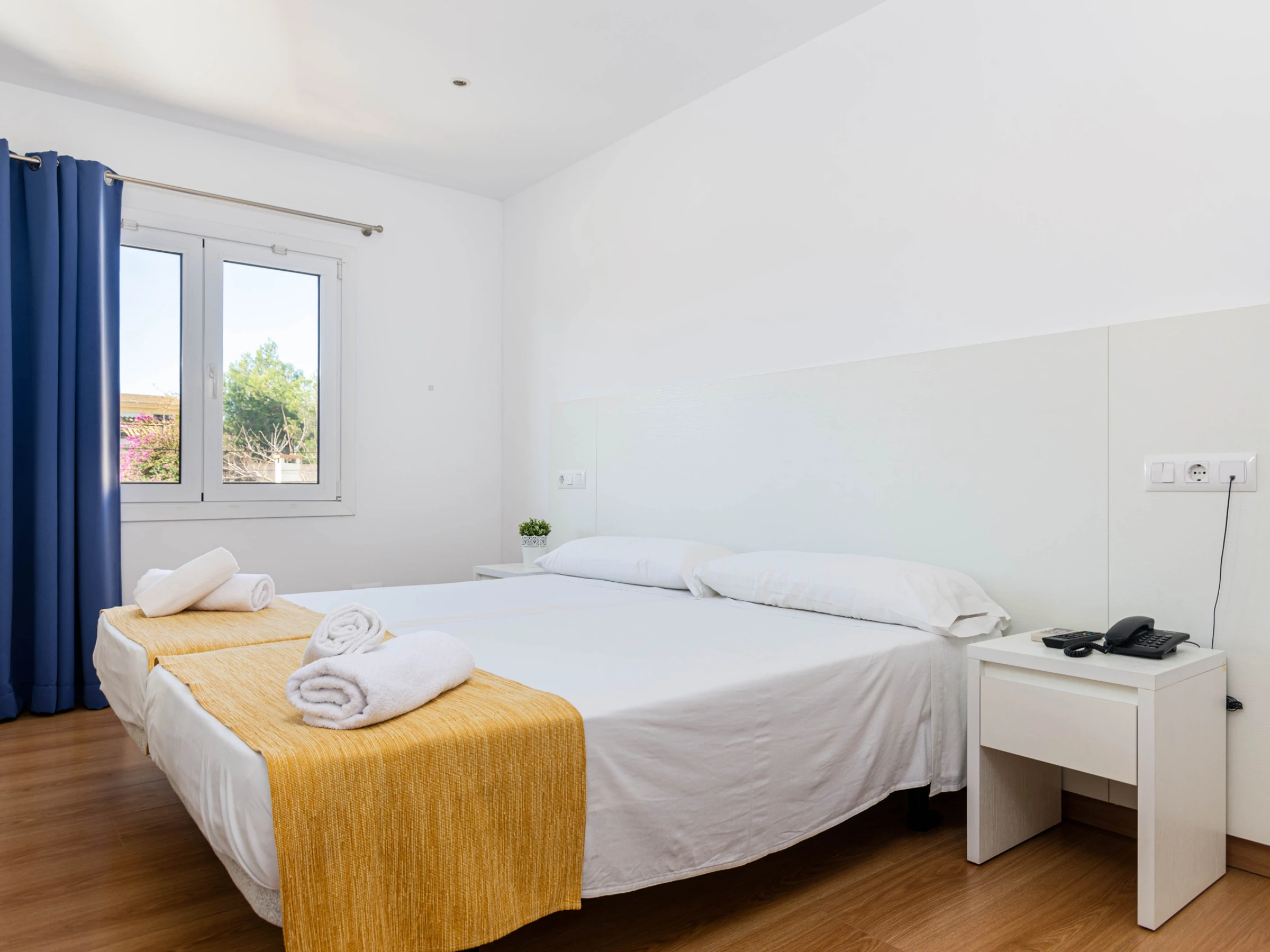 Das Schlafzimmer im Erdgeschoss mit einem Doppelbett (1,5 x 1,9 Meter) hat ebenfalls Zugang zur Terrasse. Zusätzlich gibt es ein weiteres Schlafzimmer mit zwei Einzelbetten auf dieser Etage. Beide Zimmer sind mit Klimaanlage, Sat-TV, einem eigenen Bad mit Dusche und Haartrockner sowie einem Kleiderschrank ausgestattet. Für Familien mit Kleinkindern stehen auf Anfrage ein Babybett und ein Hochstuhl zur Verfügung.