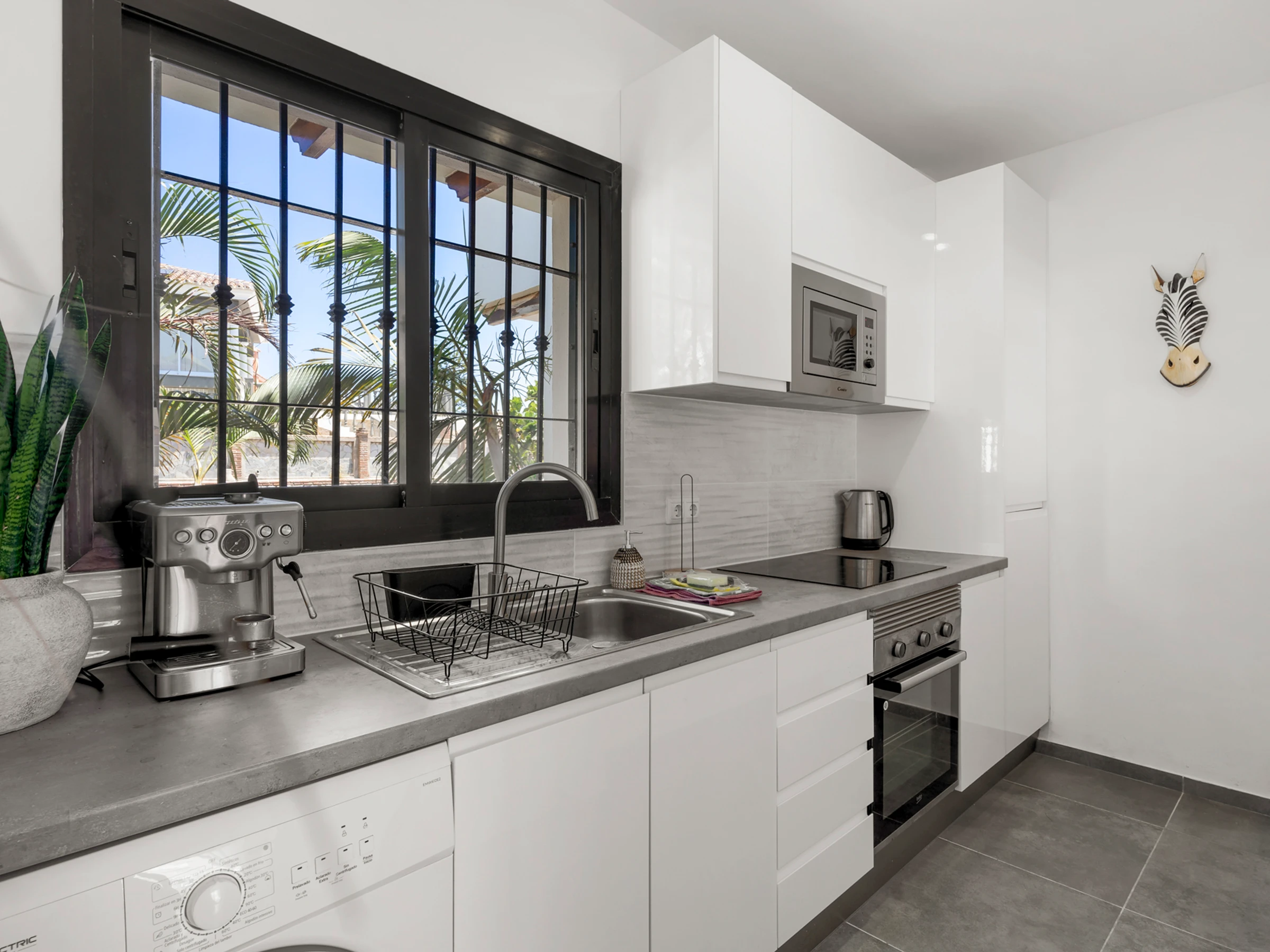 Dieses küche, ist ausgestattet in kühlschrank, mikrowelle, backofen, gefrierschrank, spülmaschine, kochutensilien, kaffeemaschine, toaster und wasserkocher.