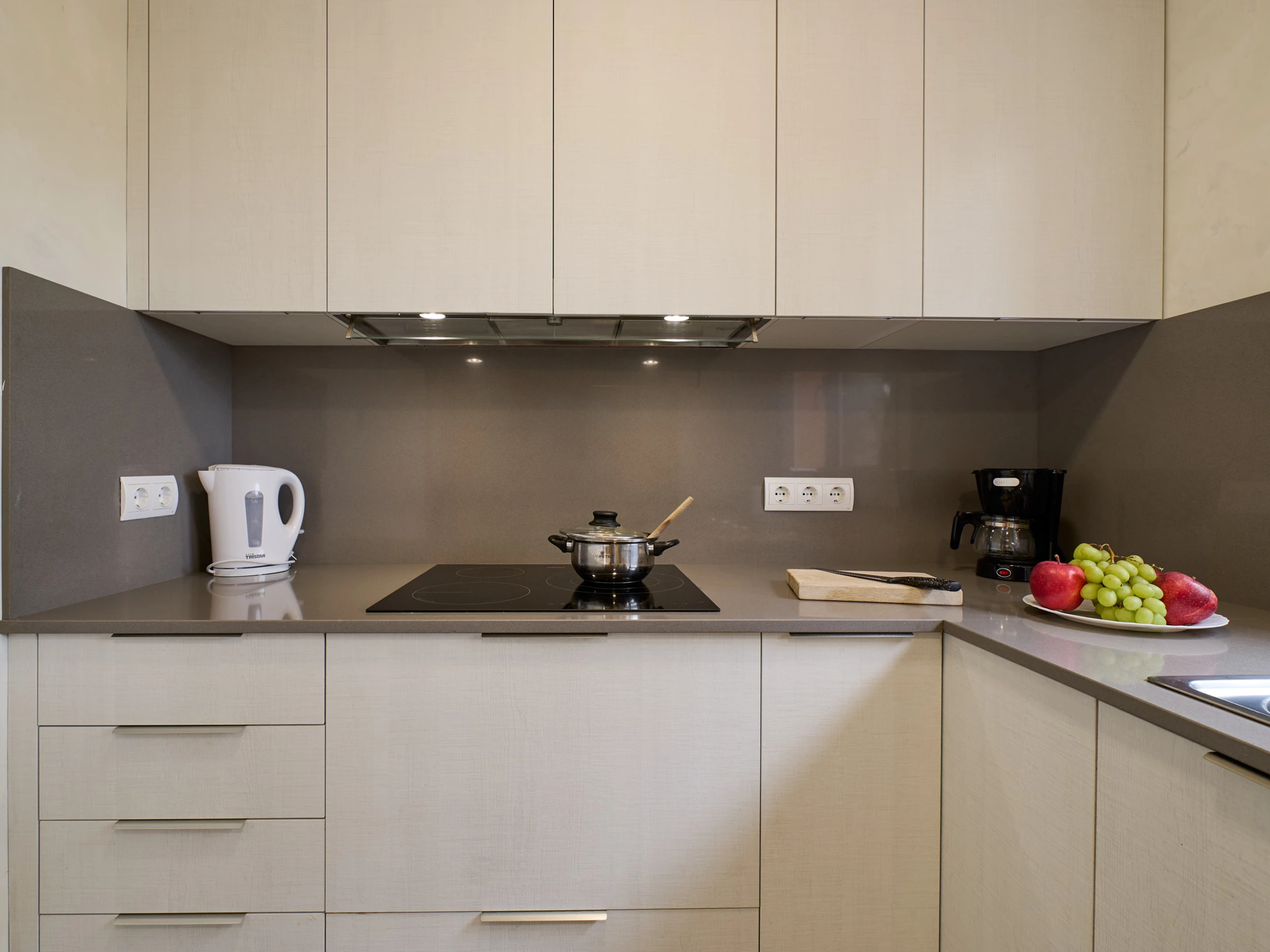 Dieses separate küche, mit ceranfeld, ist ausgestattet in kühlschrank, mikrowelle, backofen, gefrierschrank, spülmaschine, geschirr/besteck und kaffeemaschine.