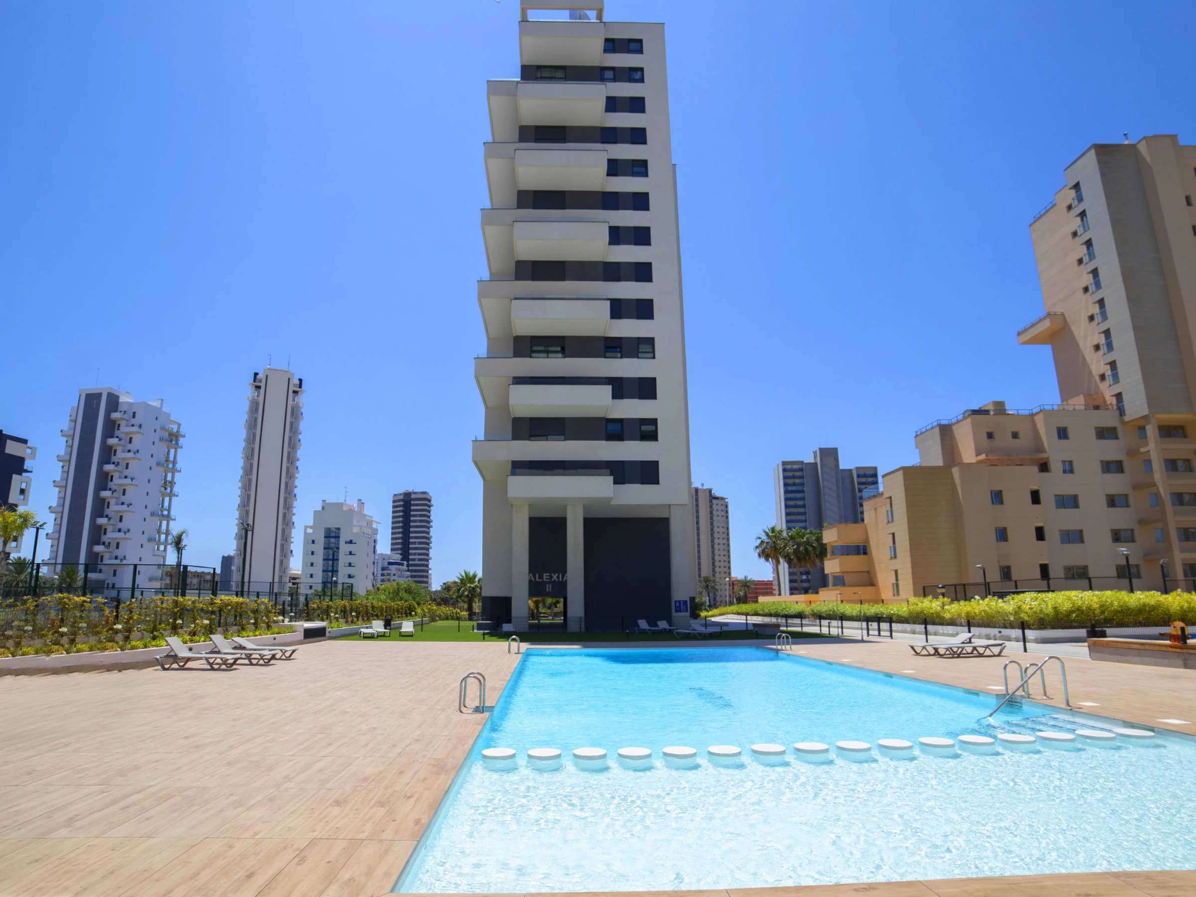 "Alexia II", 3-Zimmer-Wohnung 101 m2 im 8. Stock. Geräumig und hell, schön und modern eingerichtet: offenes Wohn-/Esszimmer mit Digital-TV, Klimaanlage und Warmluftheizung. Ausgang zur Terrasse. 1 Zimmer mit 1 franz. Bett (1 x 160 cm, Länge 200 cm), Dusche/WC, Doppelwaschbecken, Klimaanlage und Warmluftheizung. Ausgang zur Terrasse. 1 Zimmer mit 1 franz. Bett (1 x 160 cm, Länge 200 cm), Klimaanlage und Warmluftheizung. Ausgang zur Terrasse. Offene Küche (Backofen, Geschirrspüler, 3 Induktionskochplatten, Toaster, Wasserkocher, Mikrowelle, elektrische Kaffeemaschine). Bad/Dusche/WC. Grosse Terrasse. Terrassenmöbel. Schöne Sicht auf das Meer und das Städtchen. Zur Verfügung: Waschmaschine, Bügeleisen, Kinderhochstuhl, Babybett bis 2 Jahre, Haartrockner. Internet (WLAN, gratis). Parkplatz Nr. 111 (überdacht). Bitte beachten: geeignet für Familien. Nichtraucher-Haus. [hidden] // Reg. Nr.: ESFCTU0000030290007653030000000000000CV-VUT0499111-A4