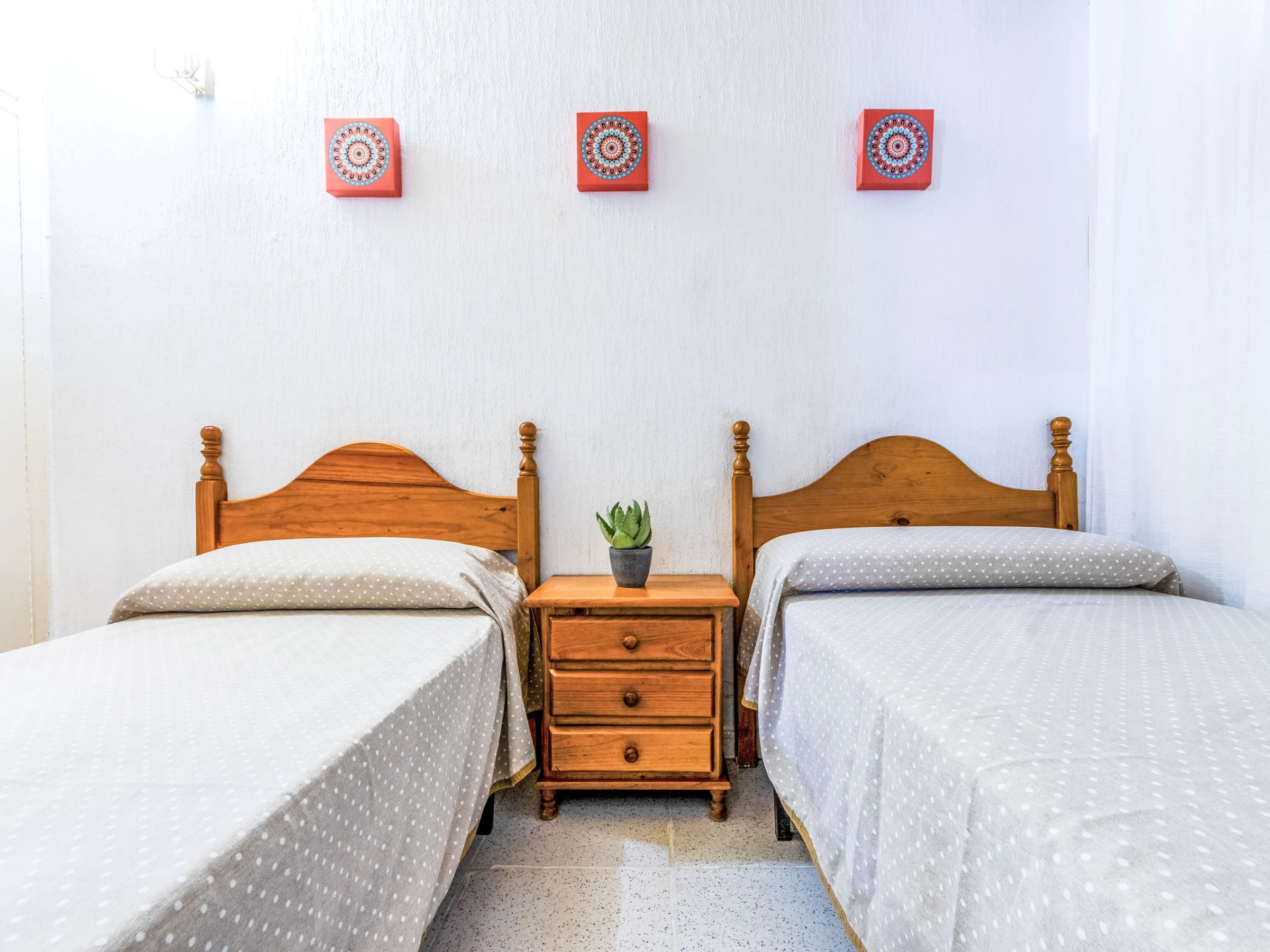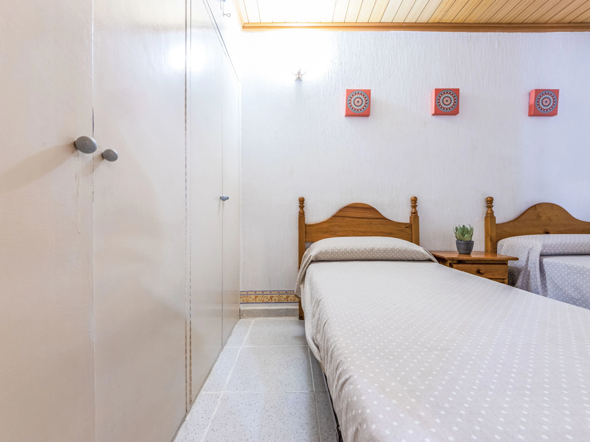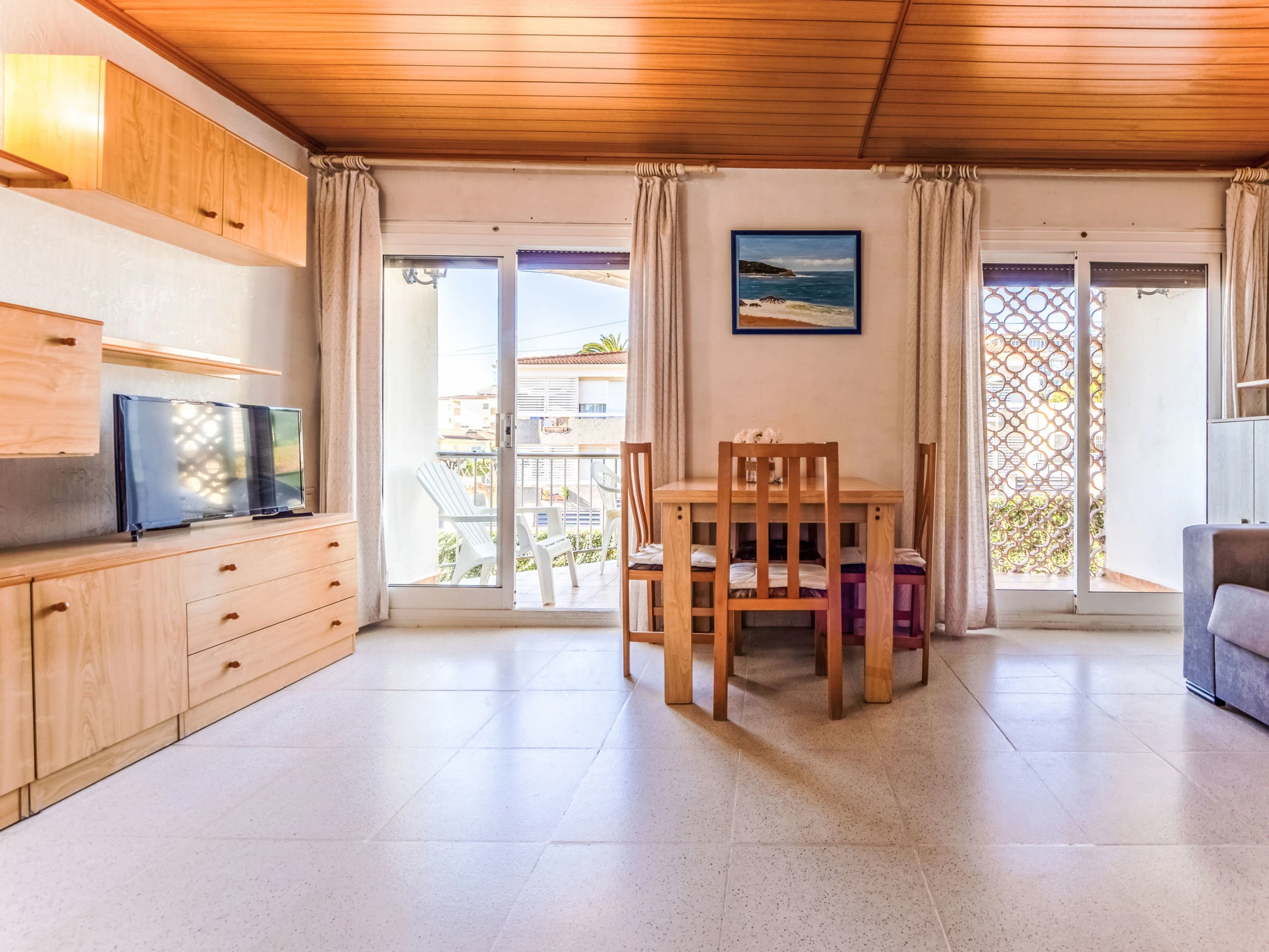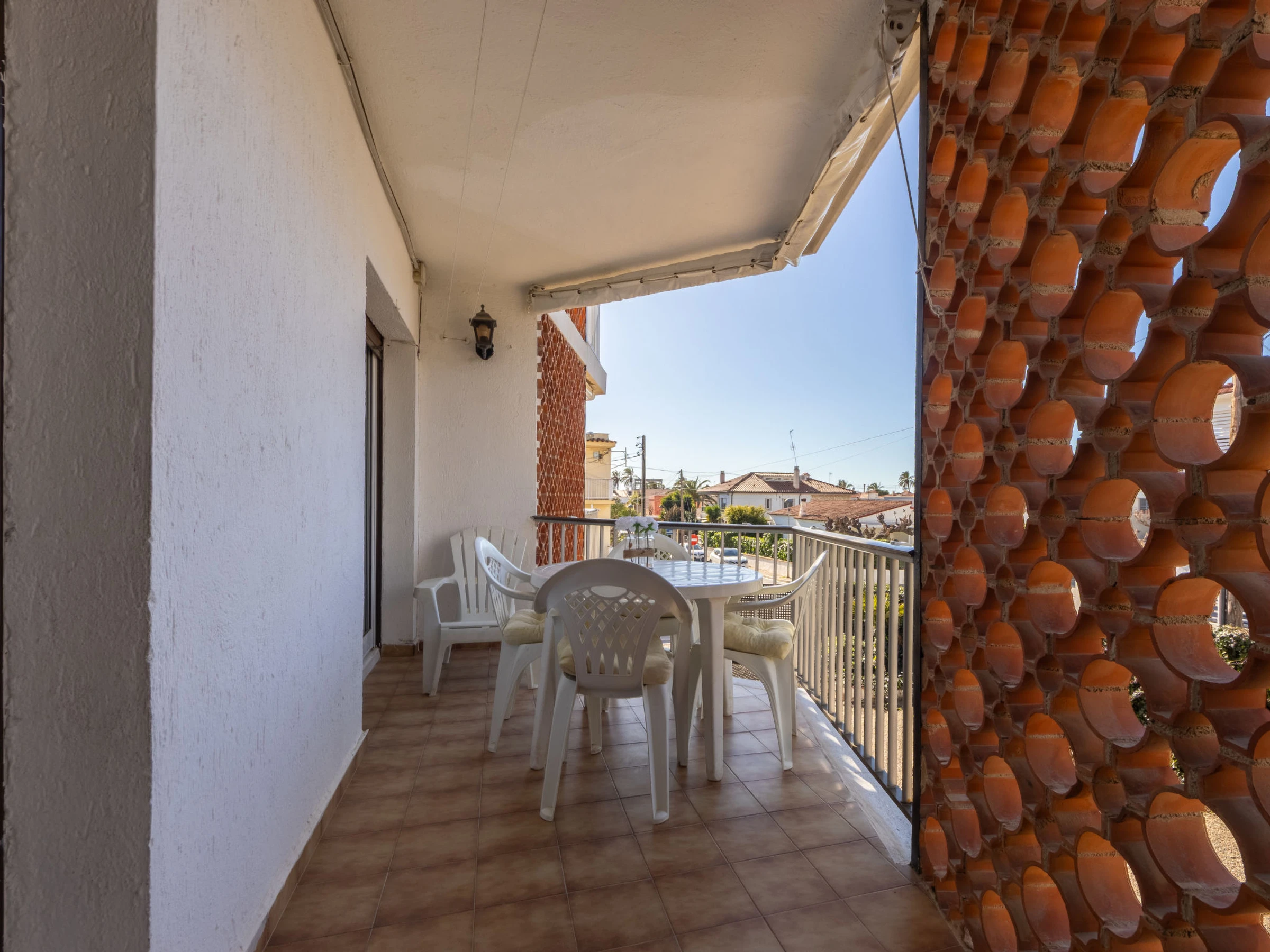 "Delfines", 3-Zimmer-Wohnung 72 m2 im 1. Stock. Einfach und komfortabel eingerichtet: Wohn-/Schlafzimmer mit 2 Betten (90 cm, Länge 190 cm), Digital-TV. Ausgang zur Terrasse. 1 Zimmer mit 2 Betten (90 cm, Länge 190 cm). Küche (Backofen, 3 Glaskeramikplatten, Toaster, Wasserkocher, Mikrowelle, elektrische Kaffeemaschine, Kapseln für die Kaffeemaschine (Nespresso) extra). Dusche, sep. WC. Keine Heizmöglichkeit. Terrasse. Terrassenmöbel. Zur Verfügung: Waschmaschine, Bügeleisen, Haartrockner. Garage Nr. 4 auf dem Grundstück (1 Auto). Geeignet für Familien. [hidden] // Reg. Nr.: ESFCTU00004303100049818900000000000000[hidden]-392