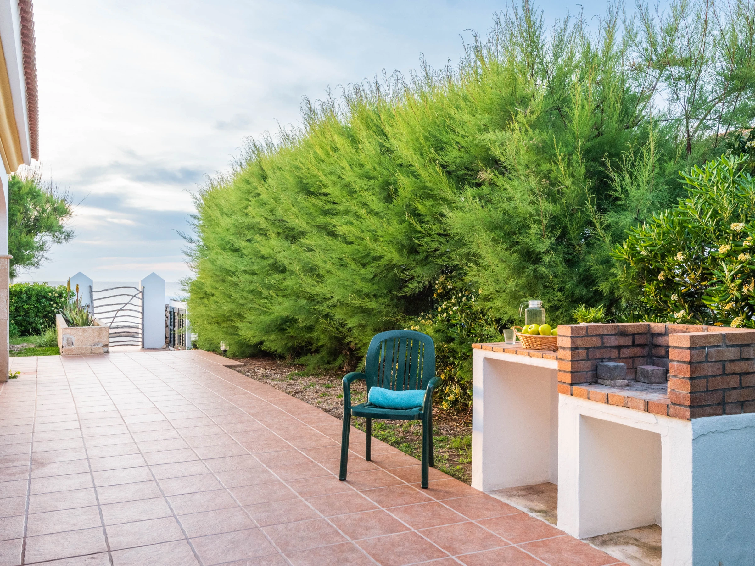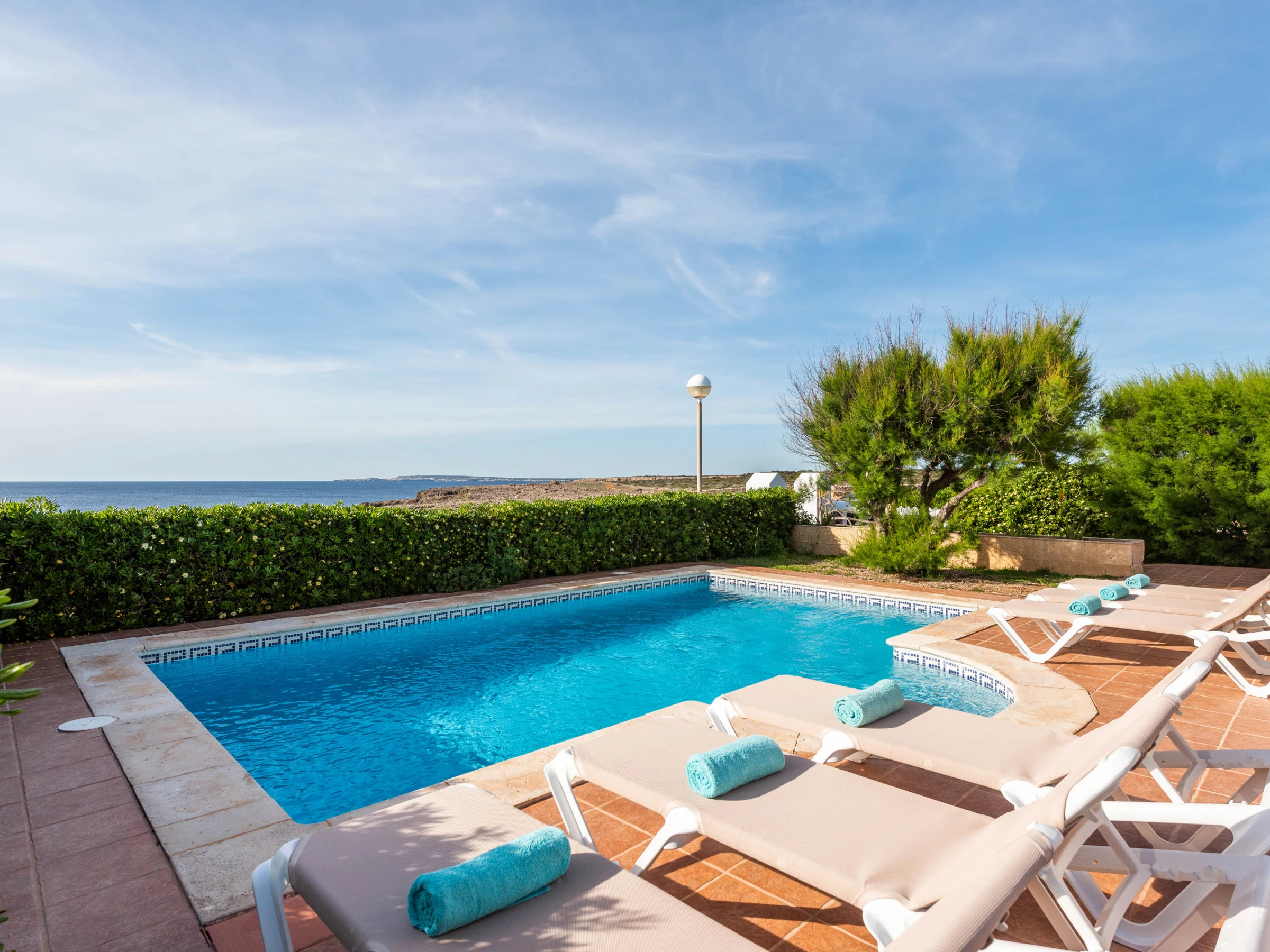 Auf der spektakulären Terrasse finden Sie Gartenmöbel, einen gemauerten Grill und den privaten Pool.