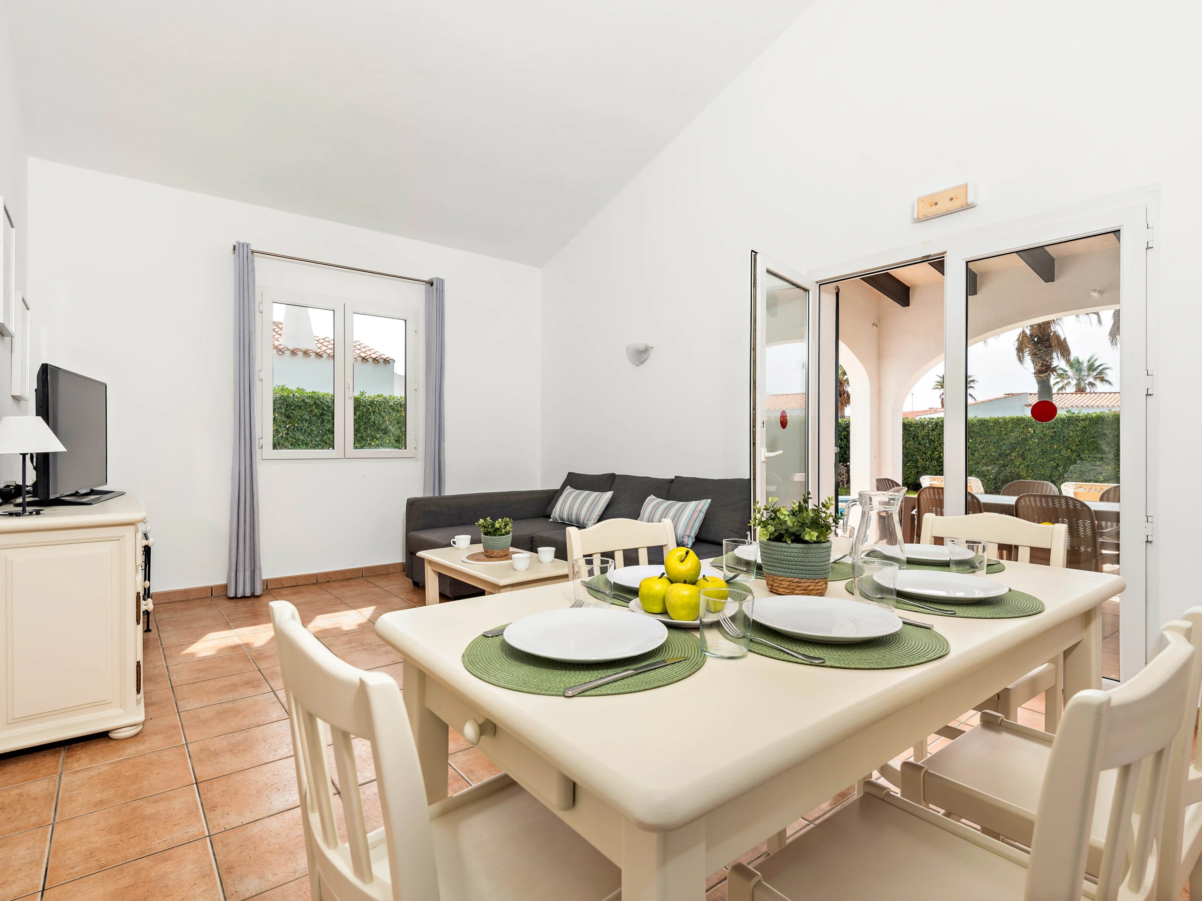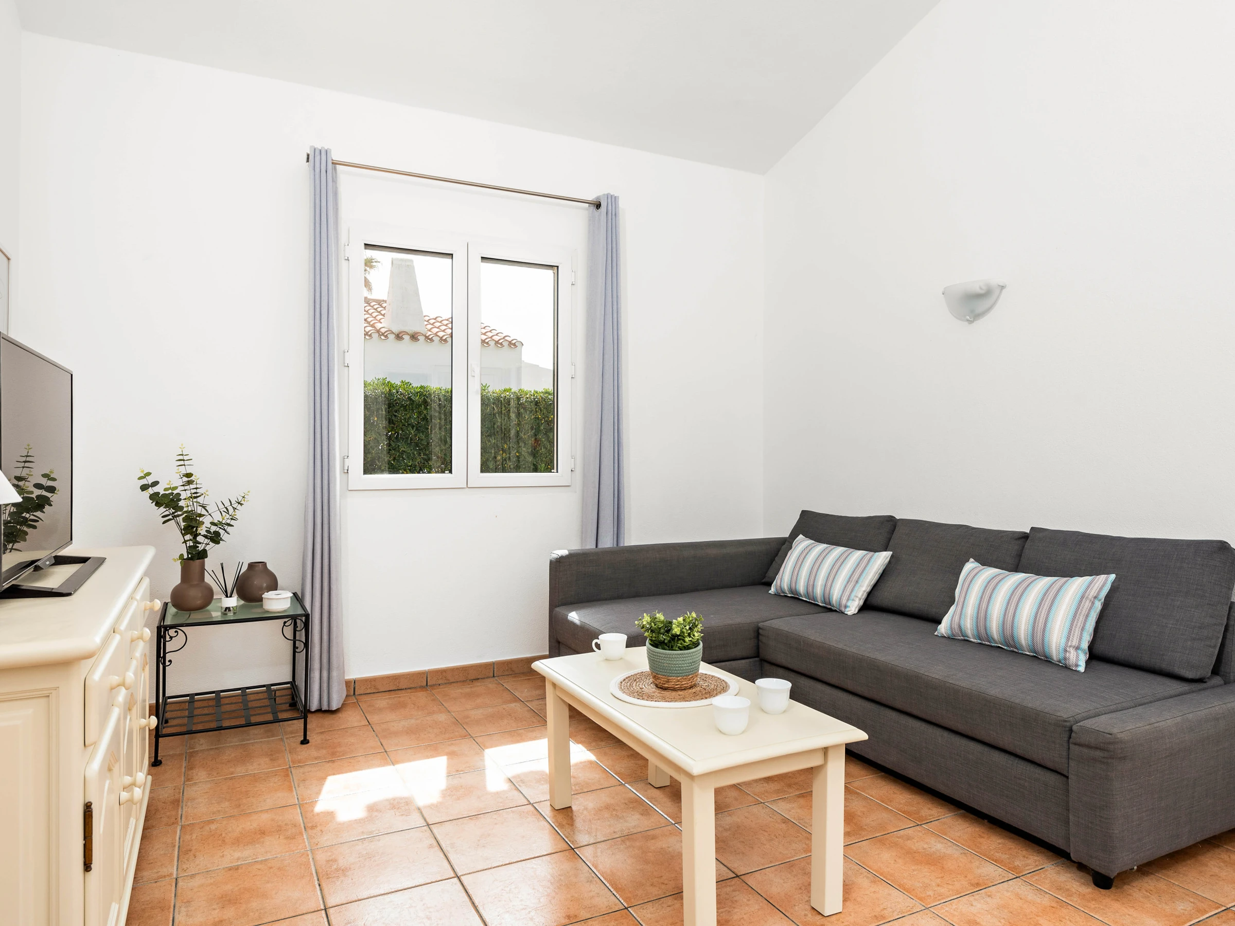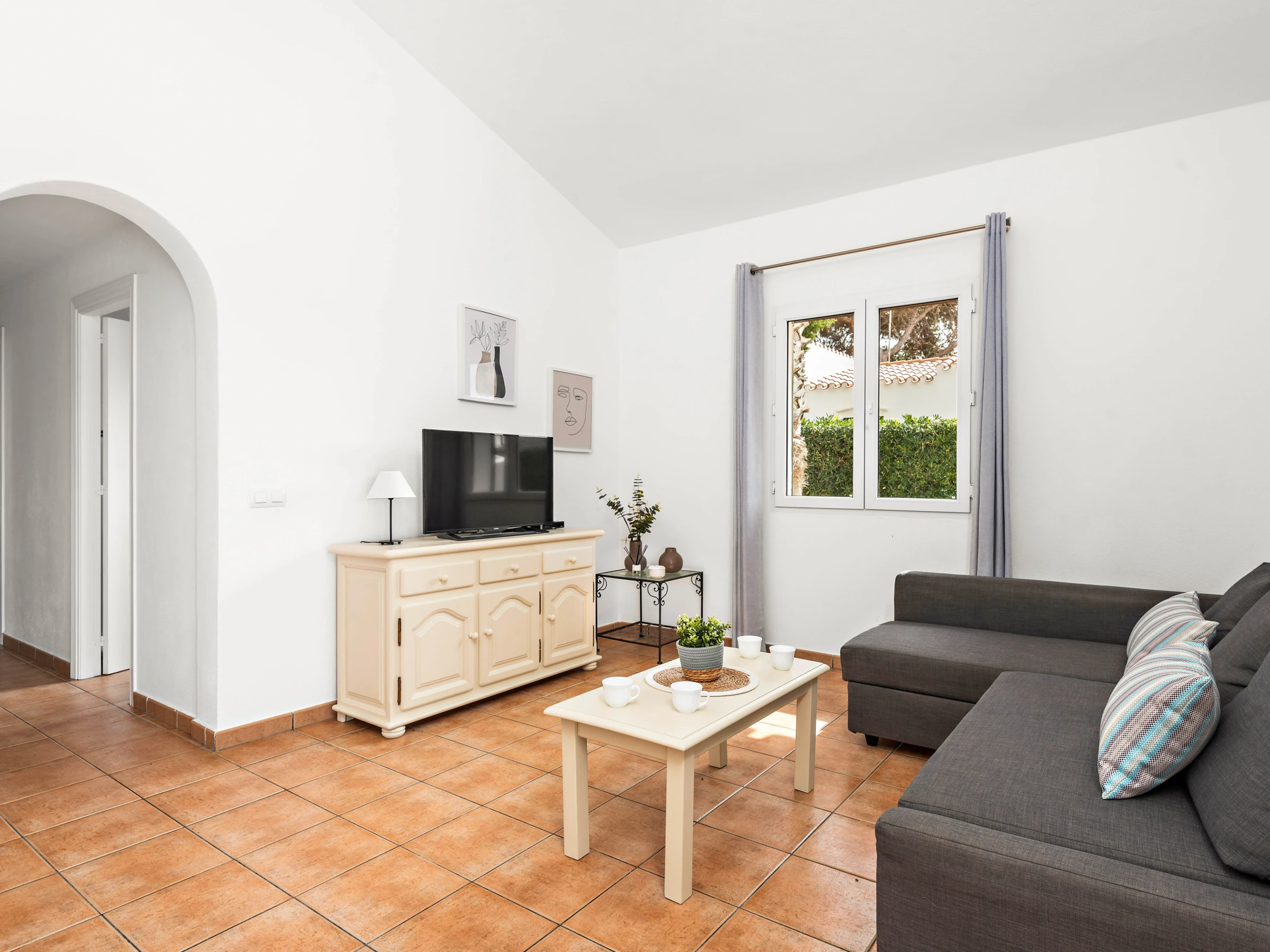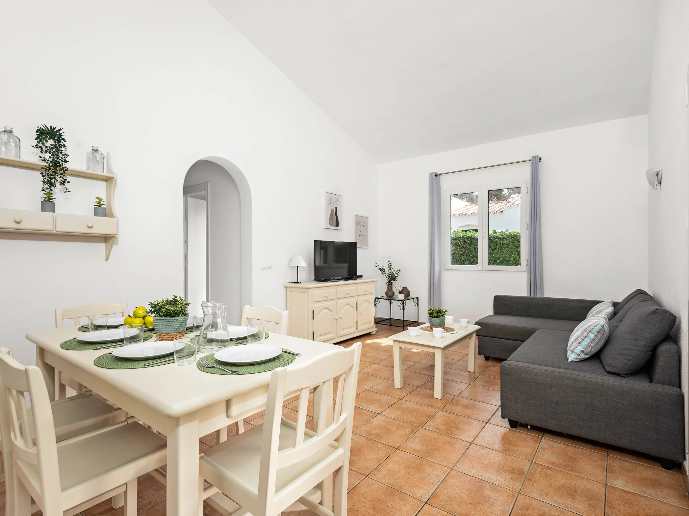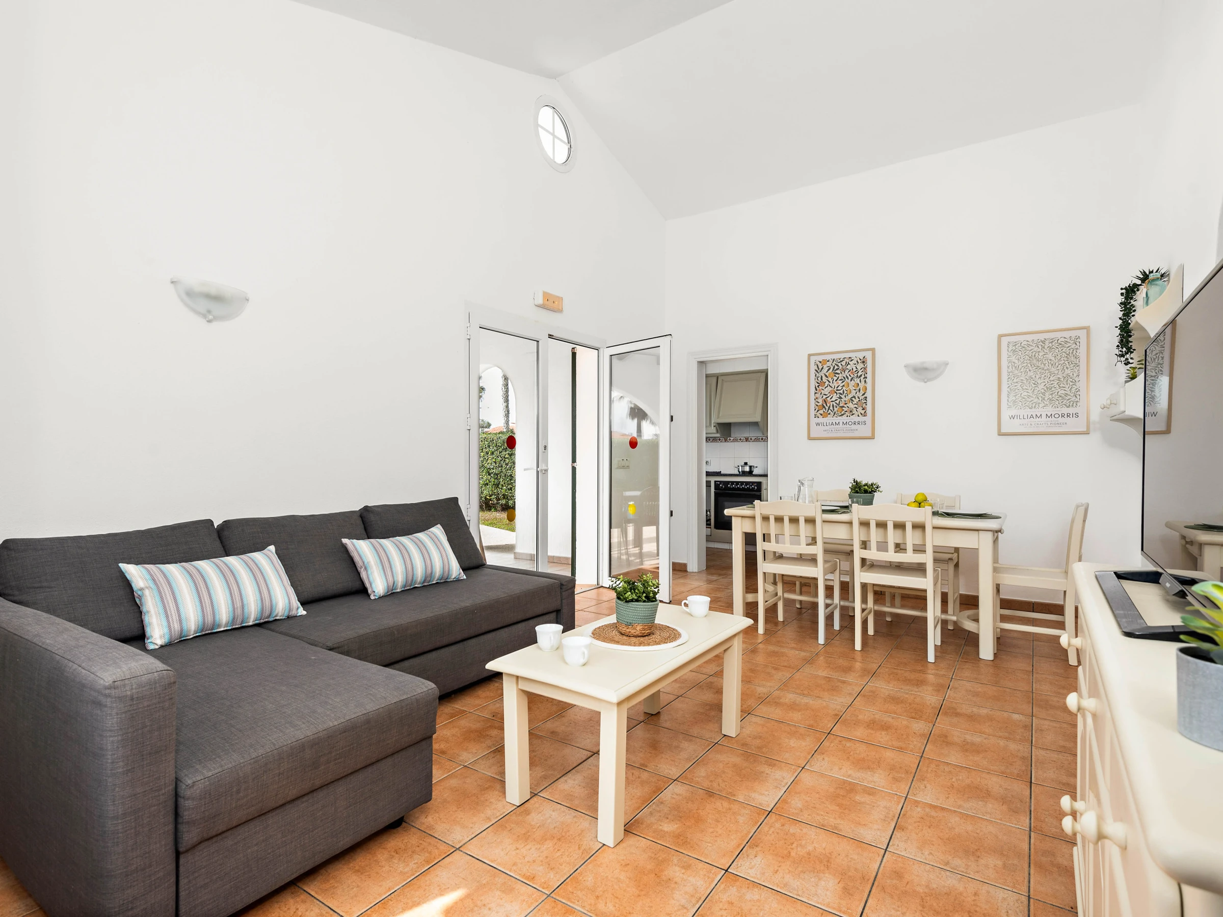 Villa im Erdgeschoss, in der wir folgende Räume vorfinden: Wohnzimmer mit direktem Zugang zur Terrasse und gleichzeitigem Zugang zur Küche. Verfügt über ein bequemes Sofa, TV mit ausländischen Kanälen, kostenloses WLAN für die Gäste.