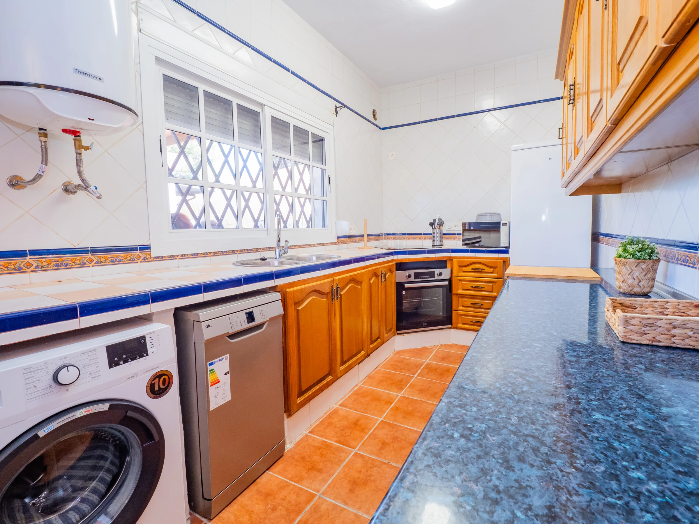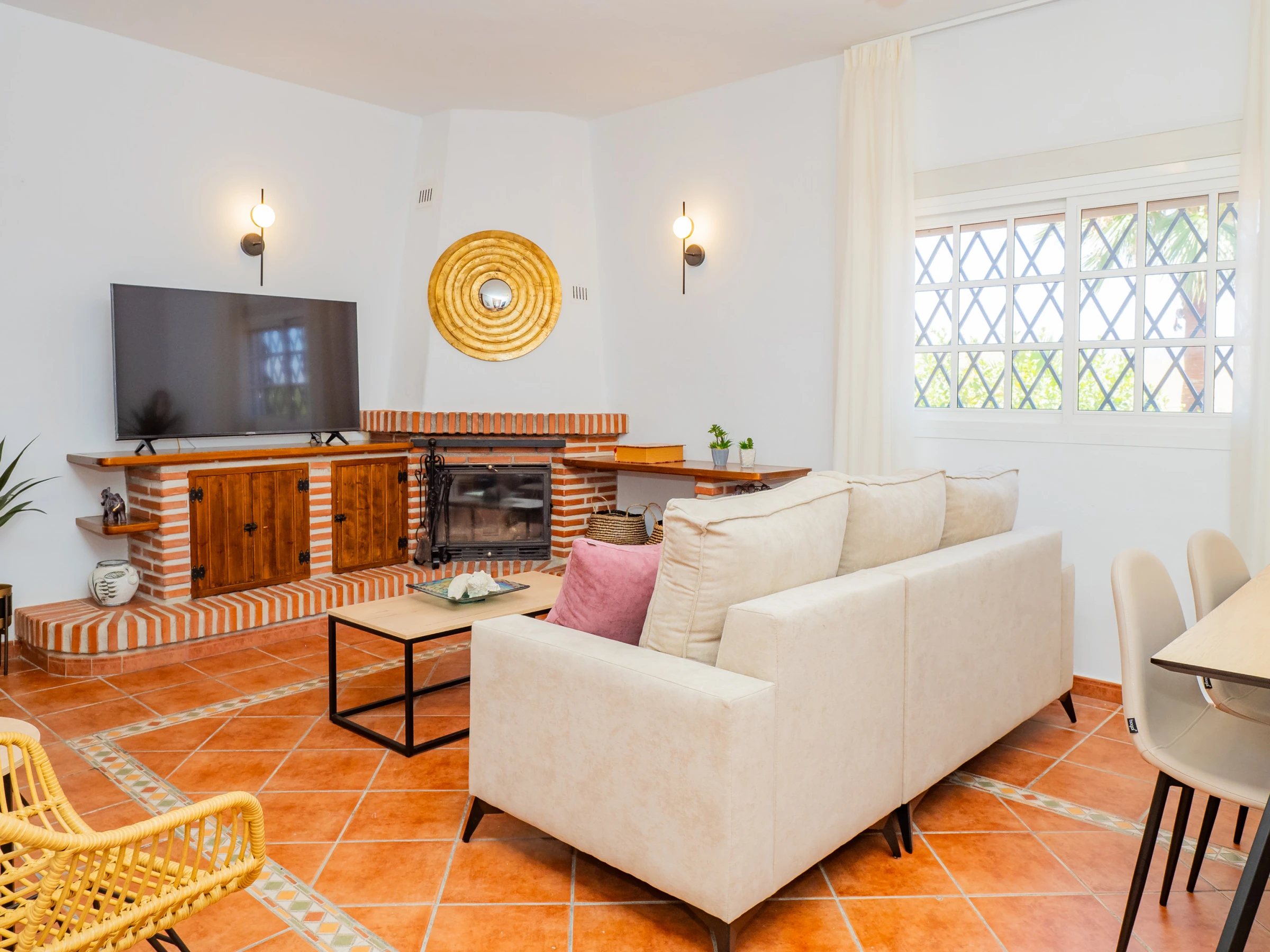 Der Innenbereich bietet ein geräumiges und helles Wohn-Esszimmer, perfekt für Familientreffen, mit Kamin für kalte Jahreszeiten und Fernseher zur Unterhaltung. Die angrenzende Küche ist komplett ausgestattet mit modernen Haushaltsgeräten wie Kühlschrank, Mikrowelle, Backofen, Geschirrspüler, Kaffeemaschine, Toaster und mehr, zusätzlich zu einem vollständigen Küchengeschirr und einem Harz-Tisch, ideal für den Außenbereich oder für Kinder.