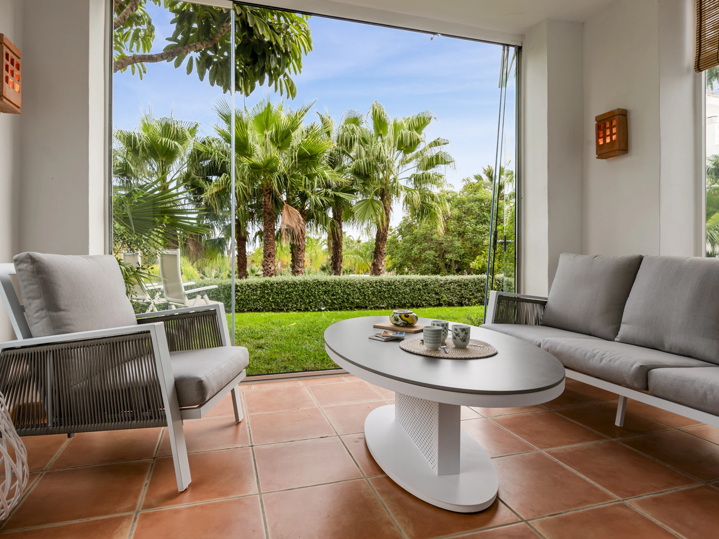 Die Unterkunft verfügt über garten, gartenmöbel, umzäuntes grundstück, 20 m² terrasse, waschmaschine, grill, bügeleisen/-brett, safe, internet (WLAN), haartrockner, zentralheizung, klimaanlage in der ganzen unterkunft, swimming-pool gemeinschaftlicher swimming pool + kinderbecken, garage in auf dem grundstück, 1 Fernseher.