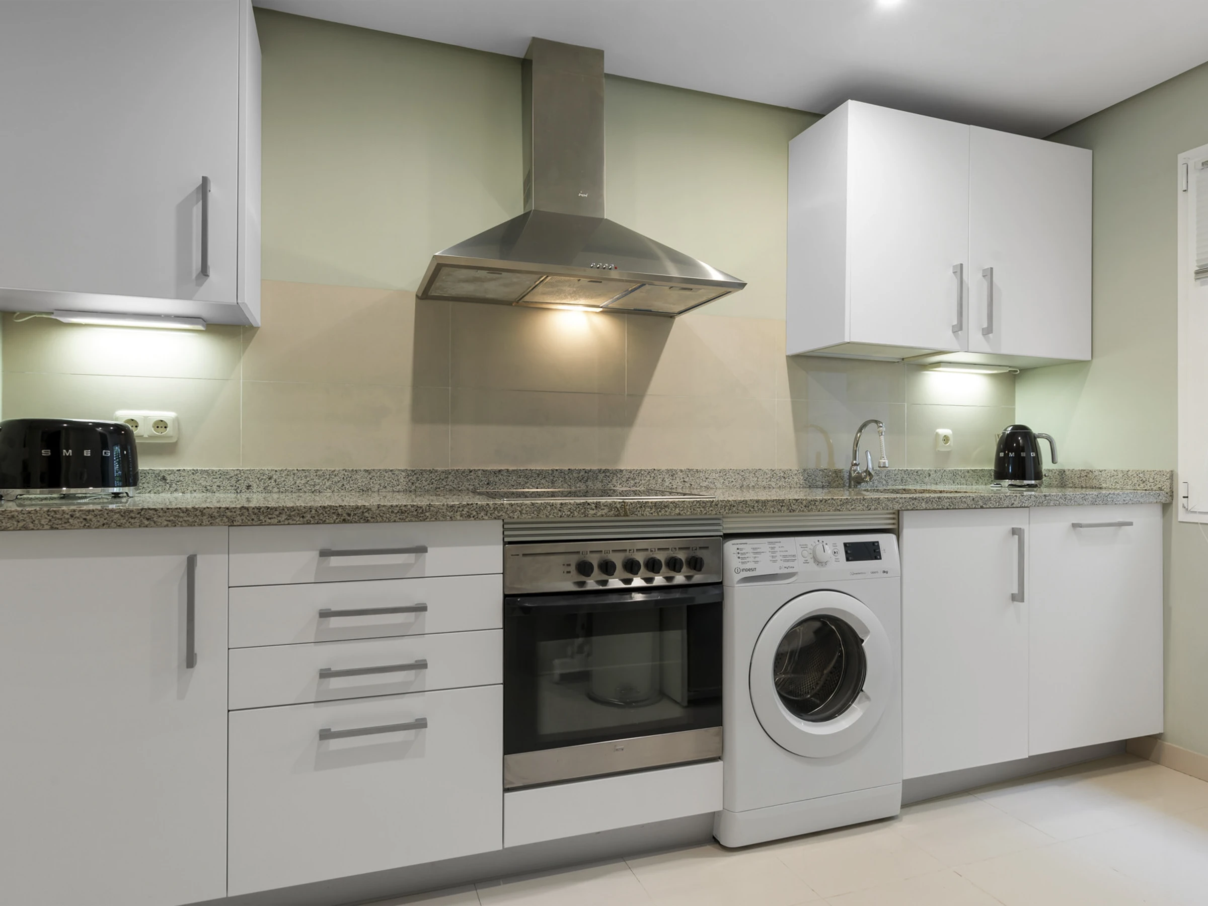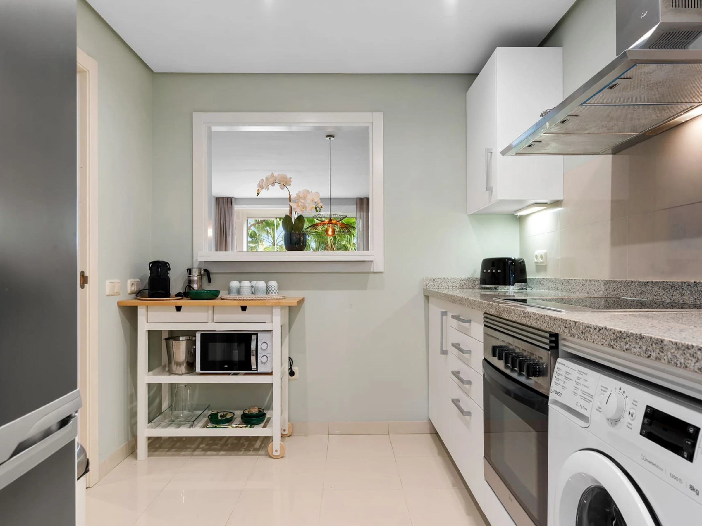 Dieses separate küche, elektrisches kochfeld, ist ausgestattet in kühlschrank, mikrowelle, backofen, gefrierschrank, spülmaschine, geschirr/besteck, kochutensilien, kaffeemaschine, toaster, wasserkocher, saftpresse, küchengeschirr, teller und schüsseln.