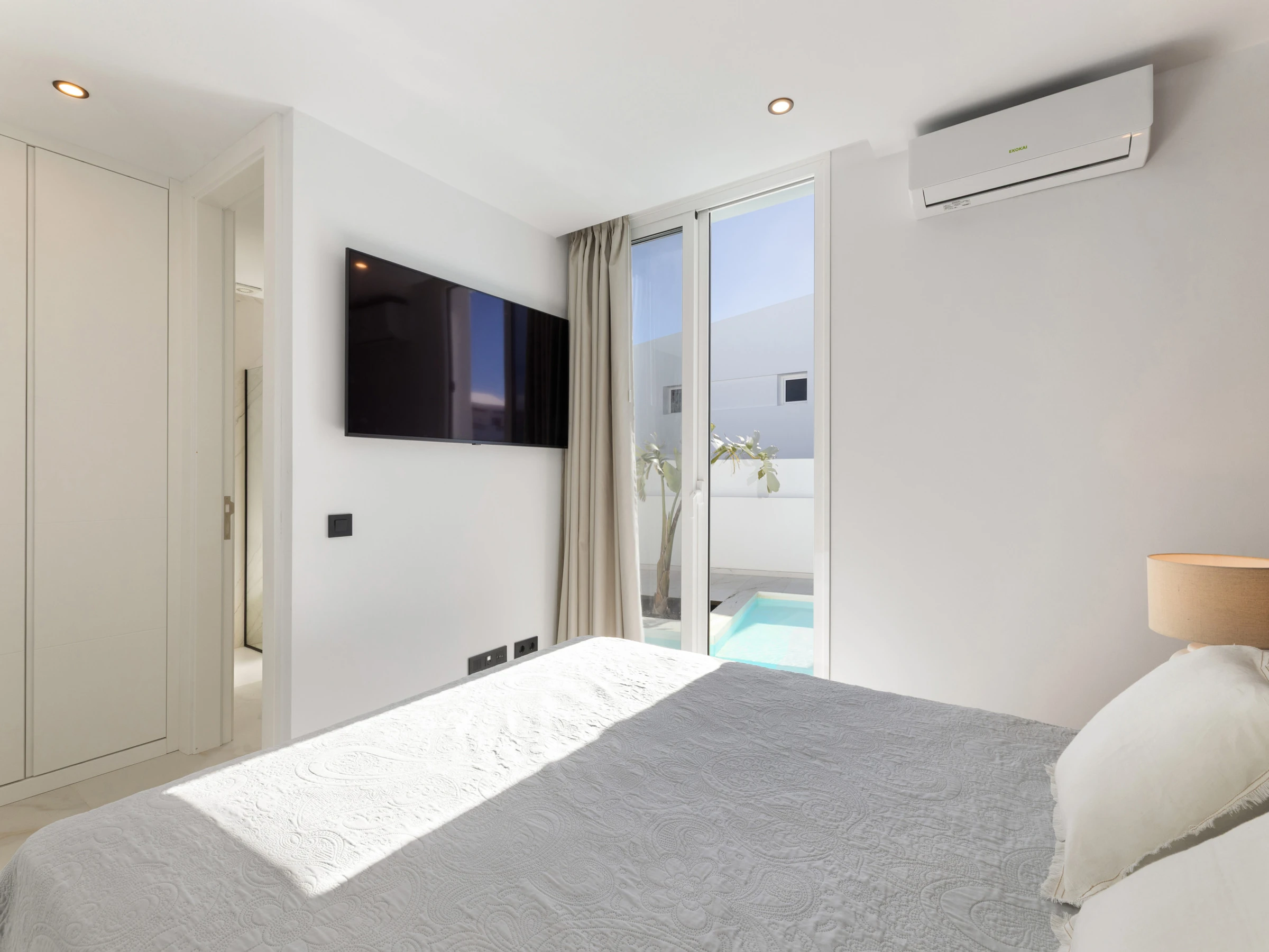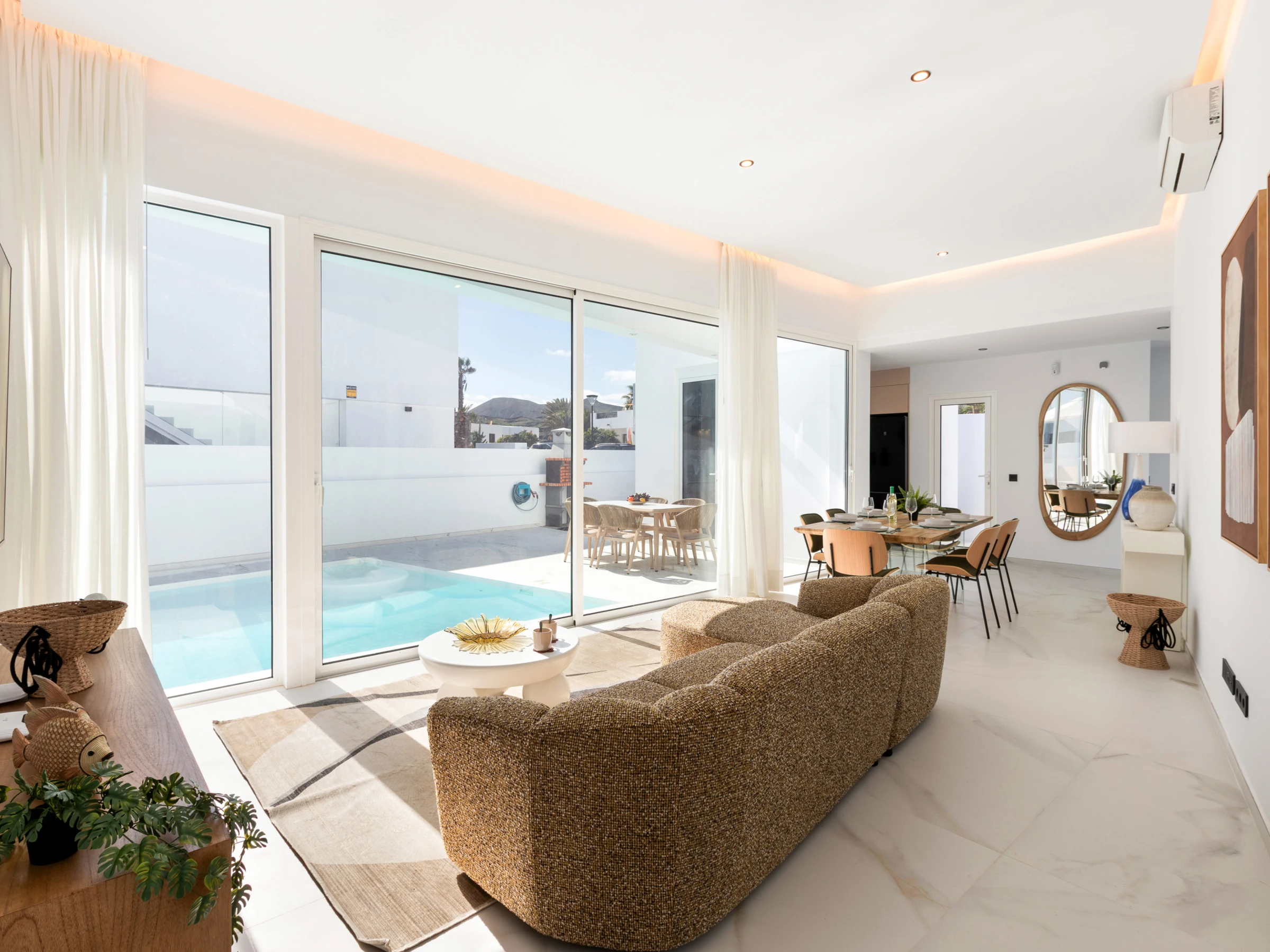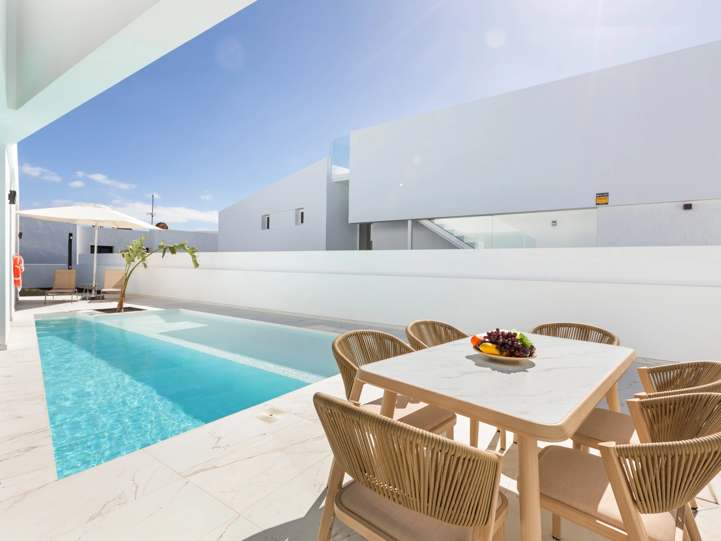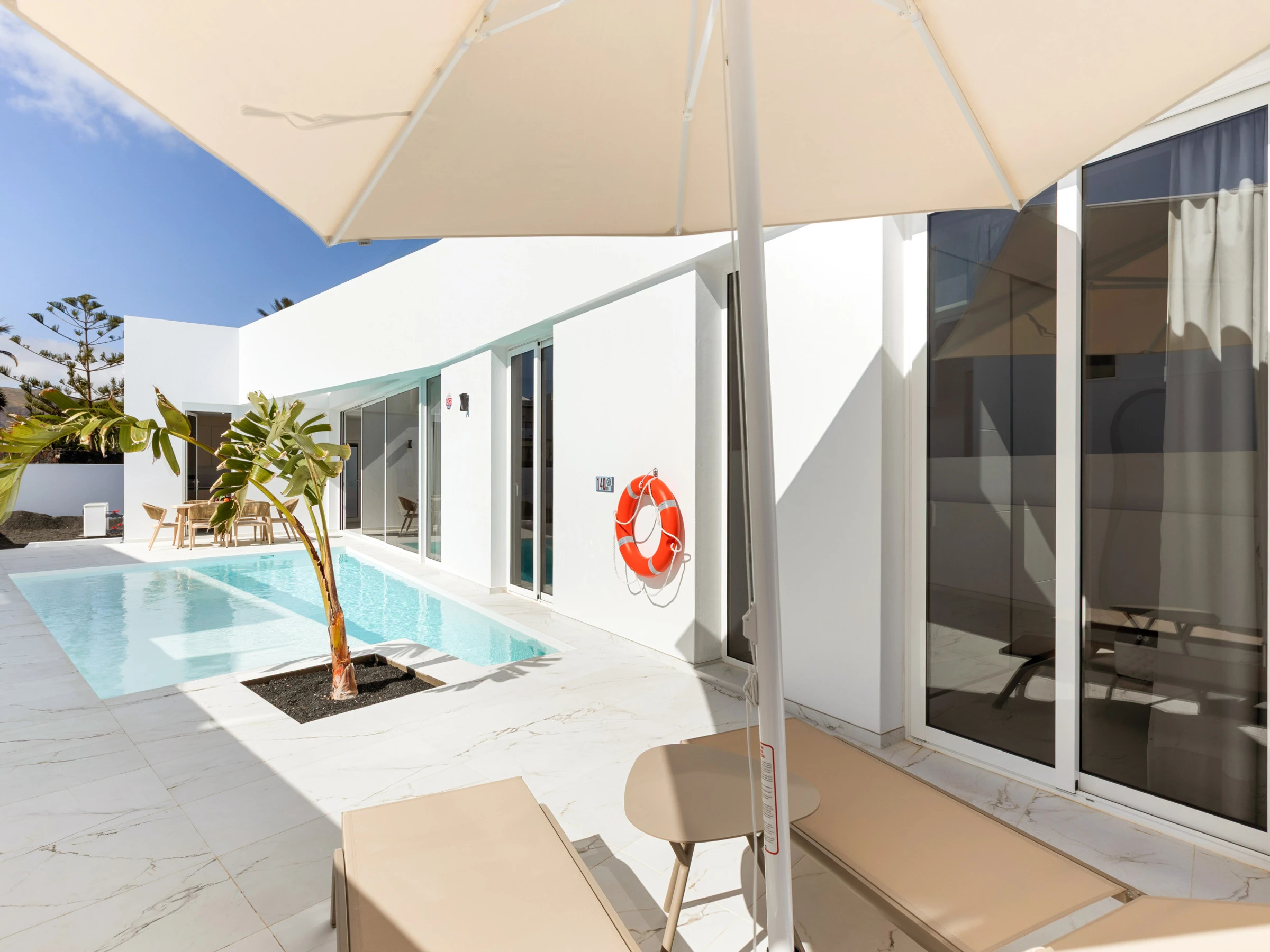 Neu gebaut, mit aktuellem und elegantem Design und Ausstattung sowie Annehmlichkeiten wie zentraler Klimaanlage und eigenem Parkplatz. Verfügt über 3 Doppelzimmer, zwei Badezimmer mit Dusche (eines davon en suite), das Hauptschlafzimmer hat einen Ankleidezimmer. Wohn-Esszimmer mit großen Fenstern zur Poolseite, gut ausgestattete Küche und Waschmaschinenbereich. Im Außenbereich befinden sich eine Außenküche, Grill, Pool, Dusche und Sonnenliegen.