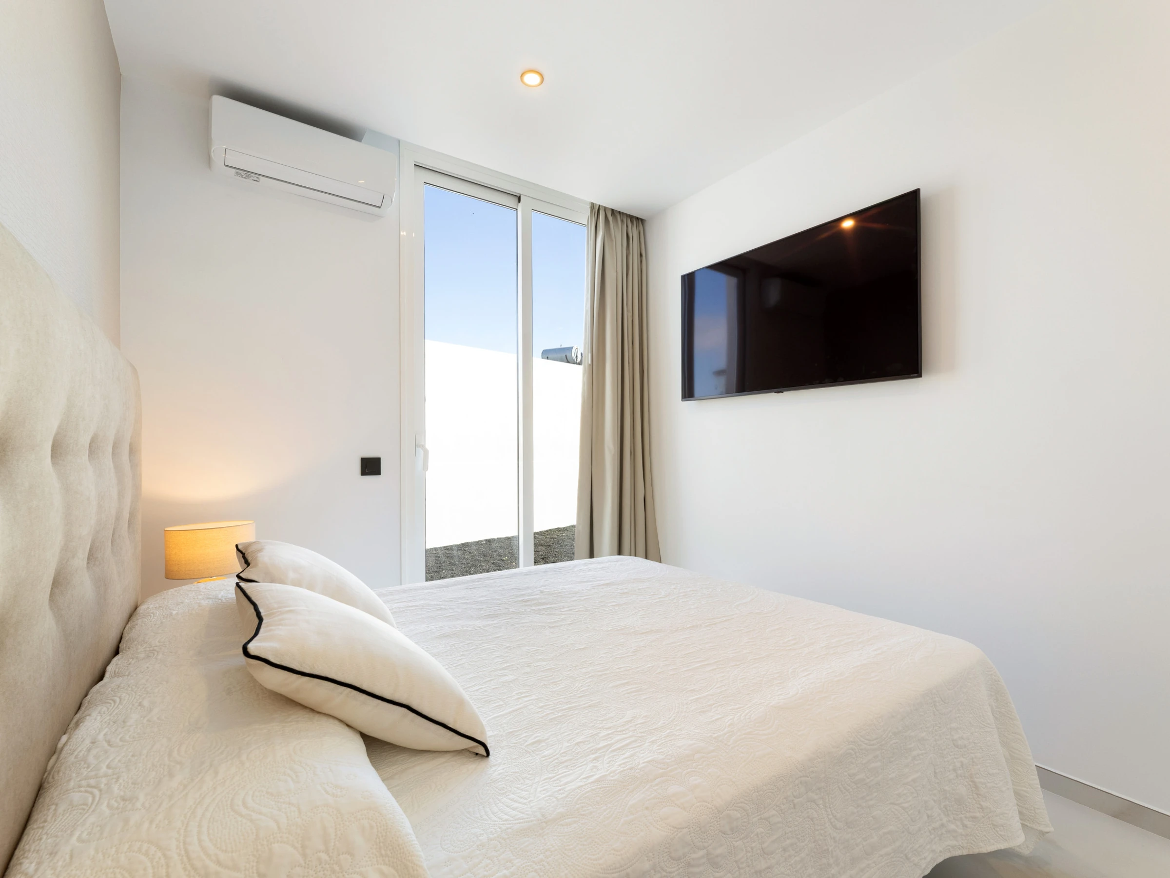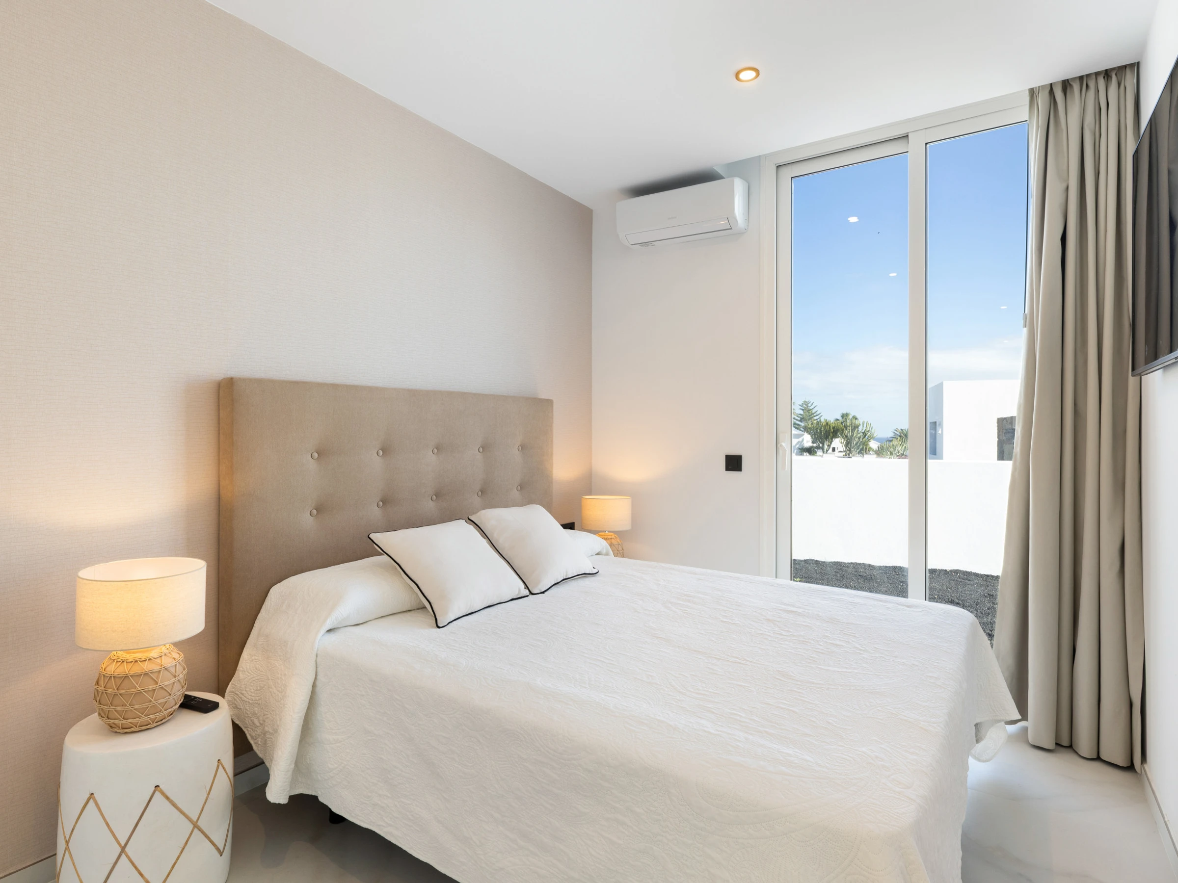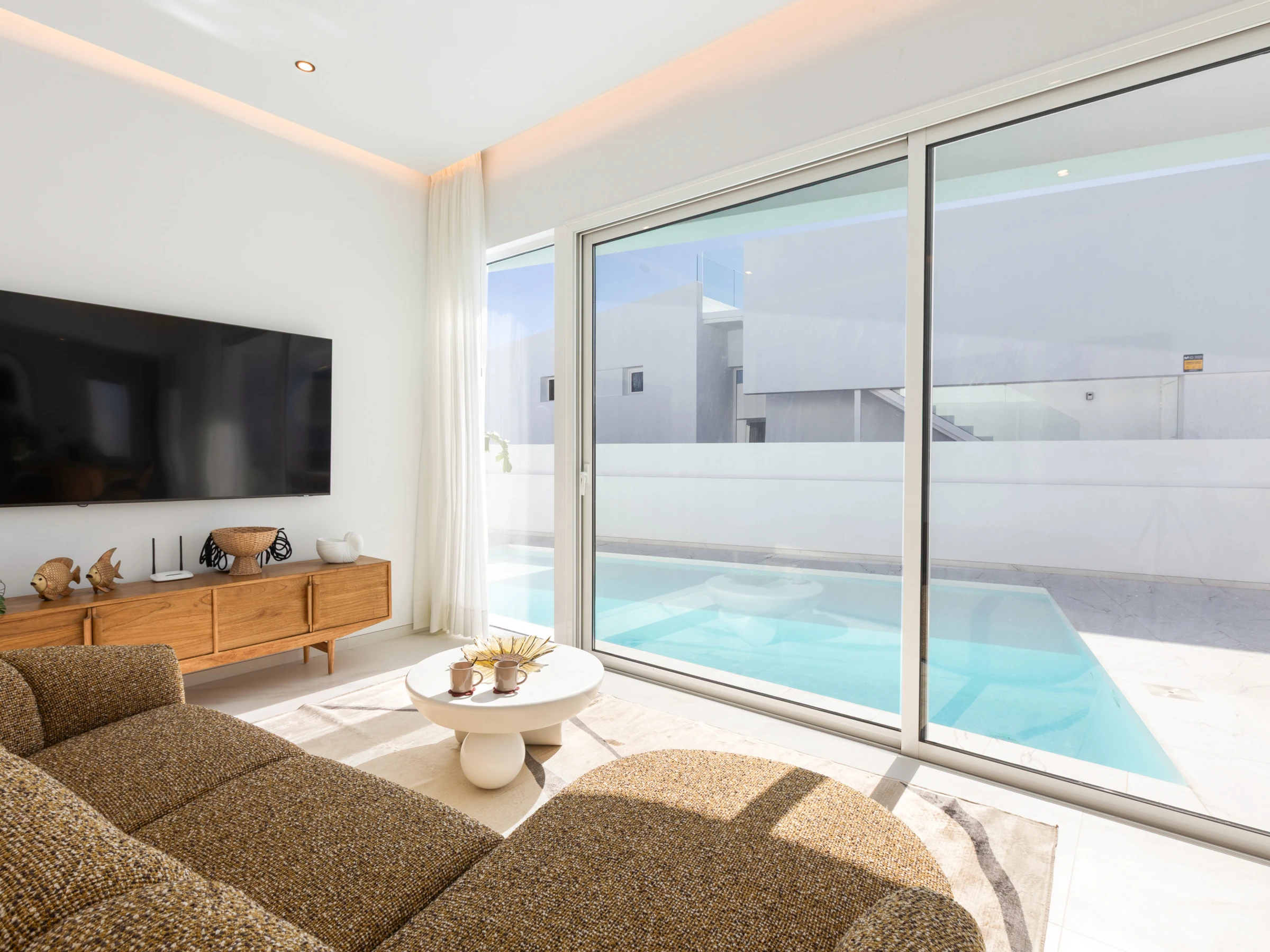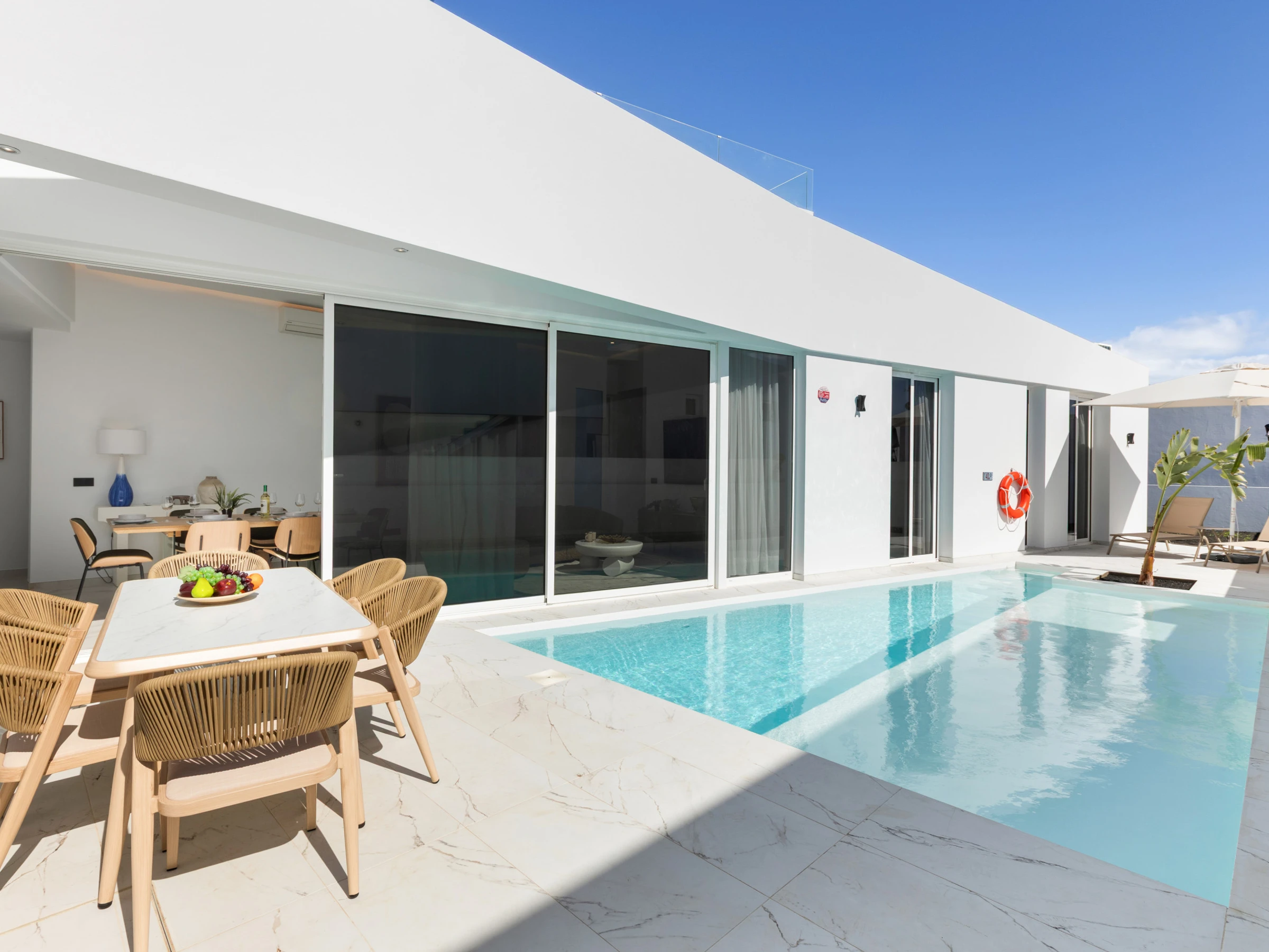 Neu gebaut, mit aktuellem und elegantem Design und Ausstattung sowie Annehmlichkeiten wie zentraler Klimaanlage und eigenem Parkplatz. Verfügt über 3 Doppelzimmer, zwei Badezimmer mit Dusche (eines davon en suite), das Hauptschlafzimmer hat einen Ankleidezimmer. Wohn-Esszimmer mit großen Fenstern zur Poolseite, gut ausgestattete Küche und Waschmaschinenbereich. Im Außenbereich befinden sich eine Außenküche, Grill, Pool, Dusche und Sonnenliegen.