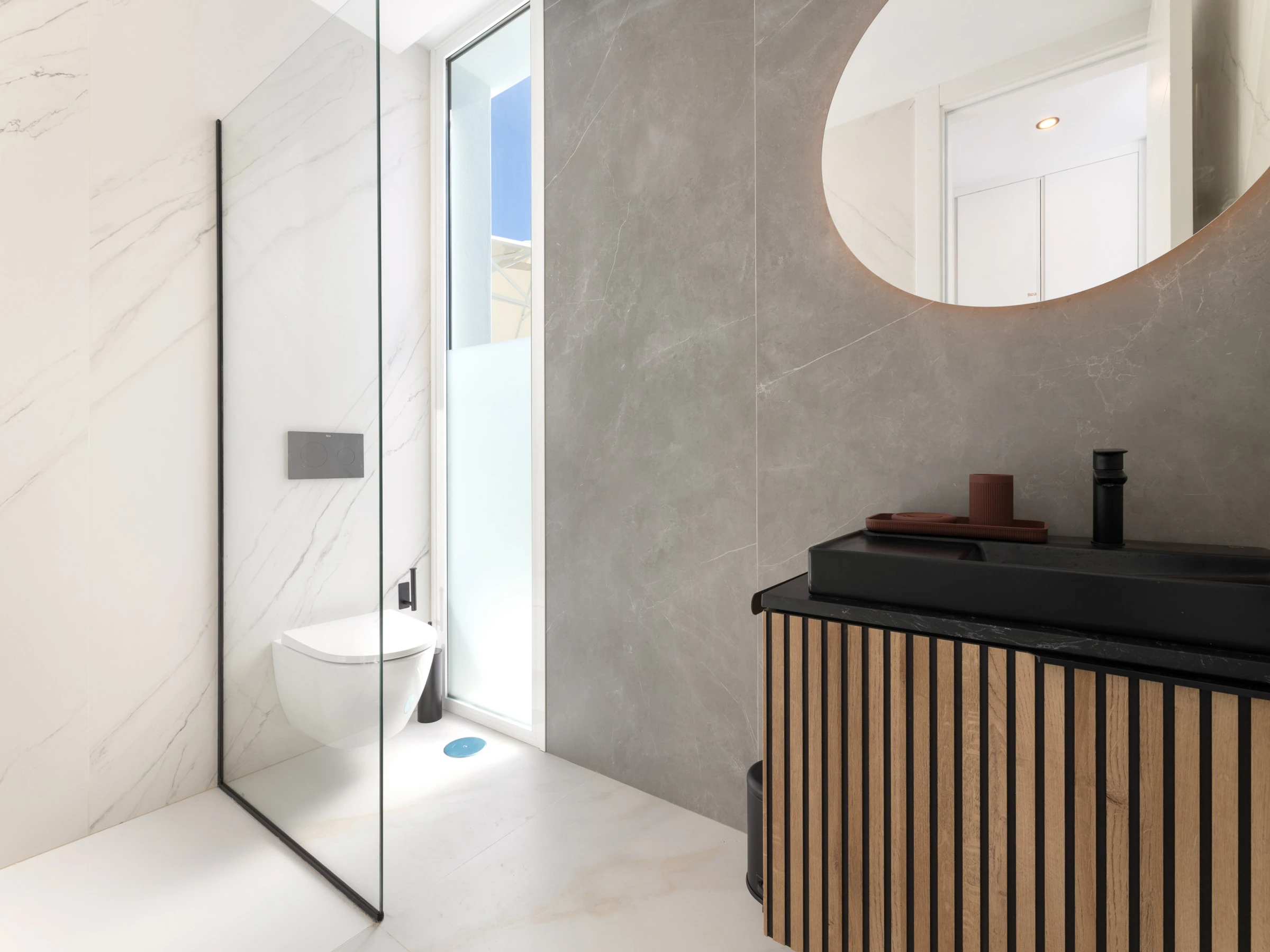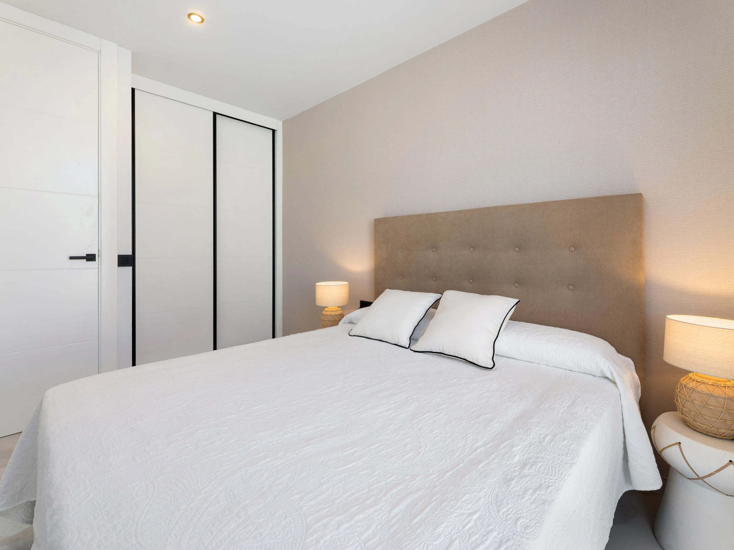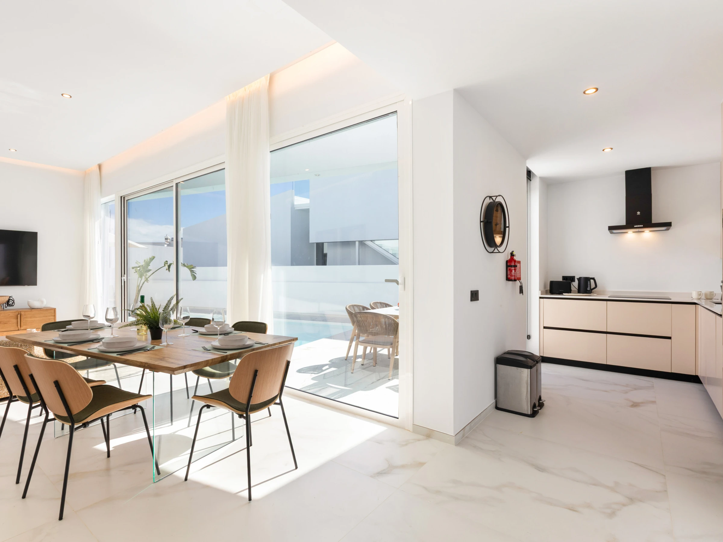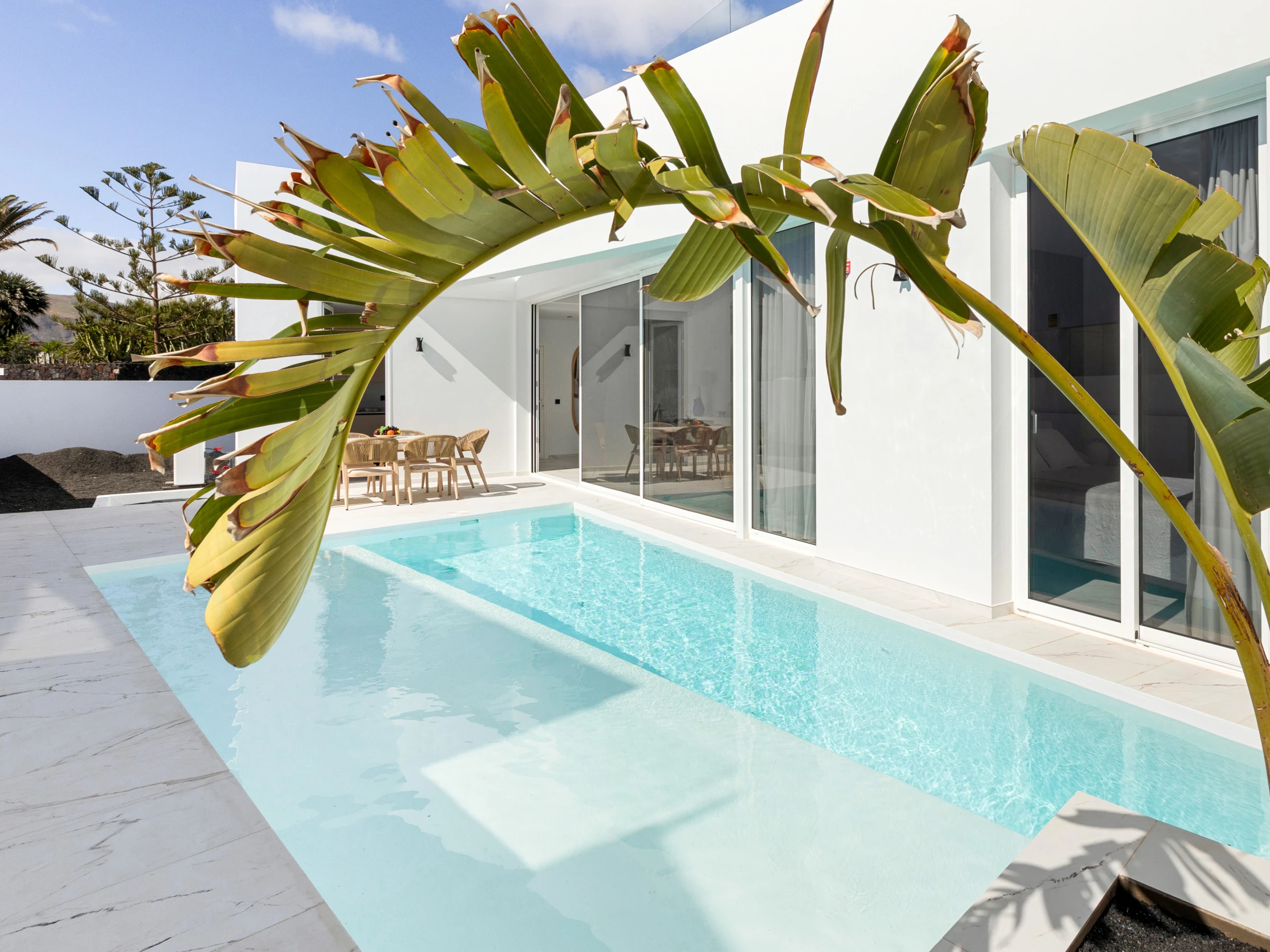 Neu gebaut, mit aktuellem und elegantem Design und Ausstattung sowie Annehmlichkeiten wie zentraler Klimaanlage und eigenem Parkplatz. Verfügt über 3 Doppelzimmer, zwei Badezimmer mit Dusche (eines davon en suite), das Hauptschlafzimmer hat einen Ankleidezimmer. Wohn-Esszimmer mit großen Fenstern zur Poolseite, gut ausgestattete Küche und Waschmaschinenbereich. Im Außenbereich befinden sich eine Außenküche, Grill, Pool, Dusche und Sonnenliegen.