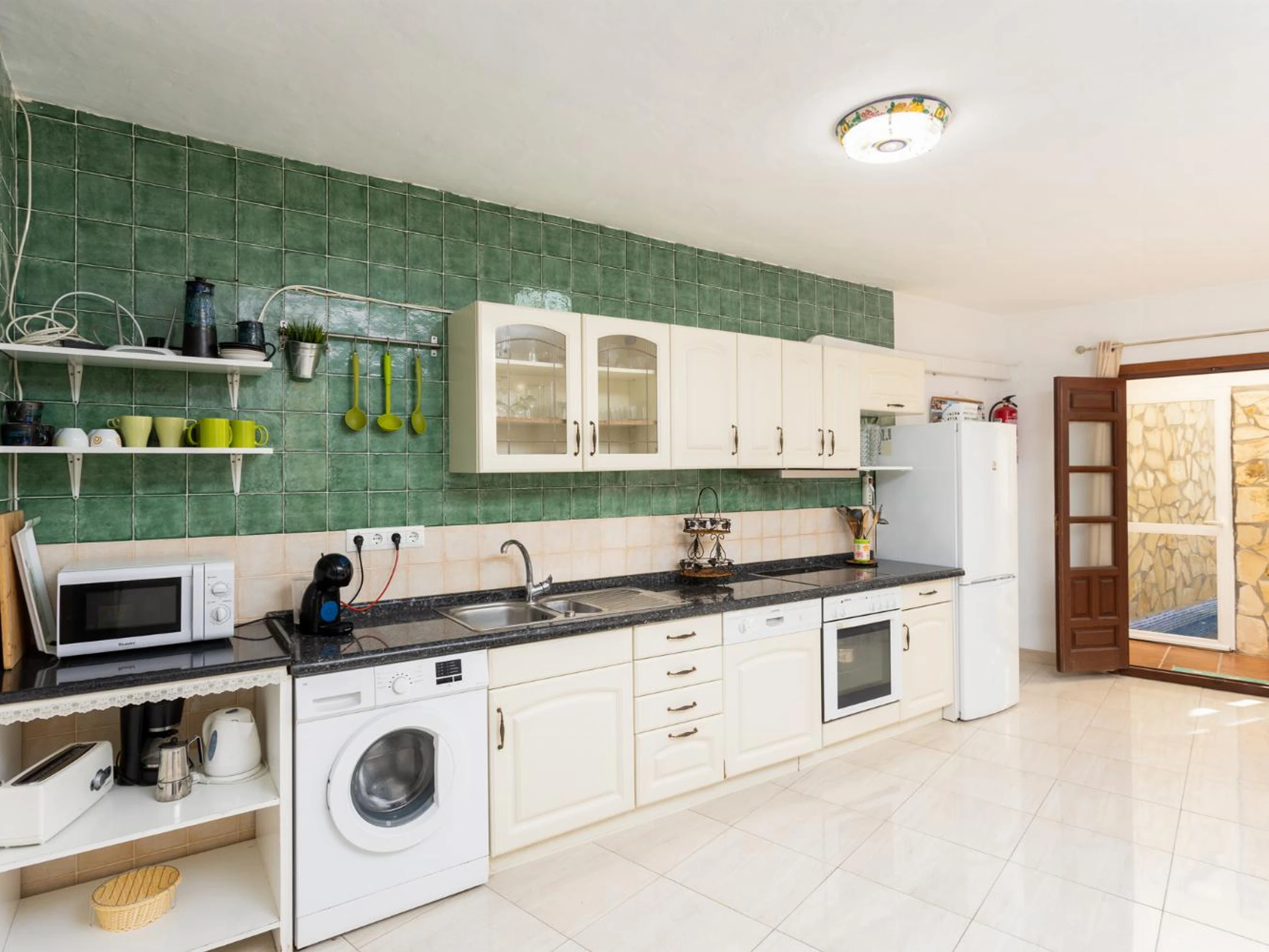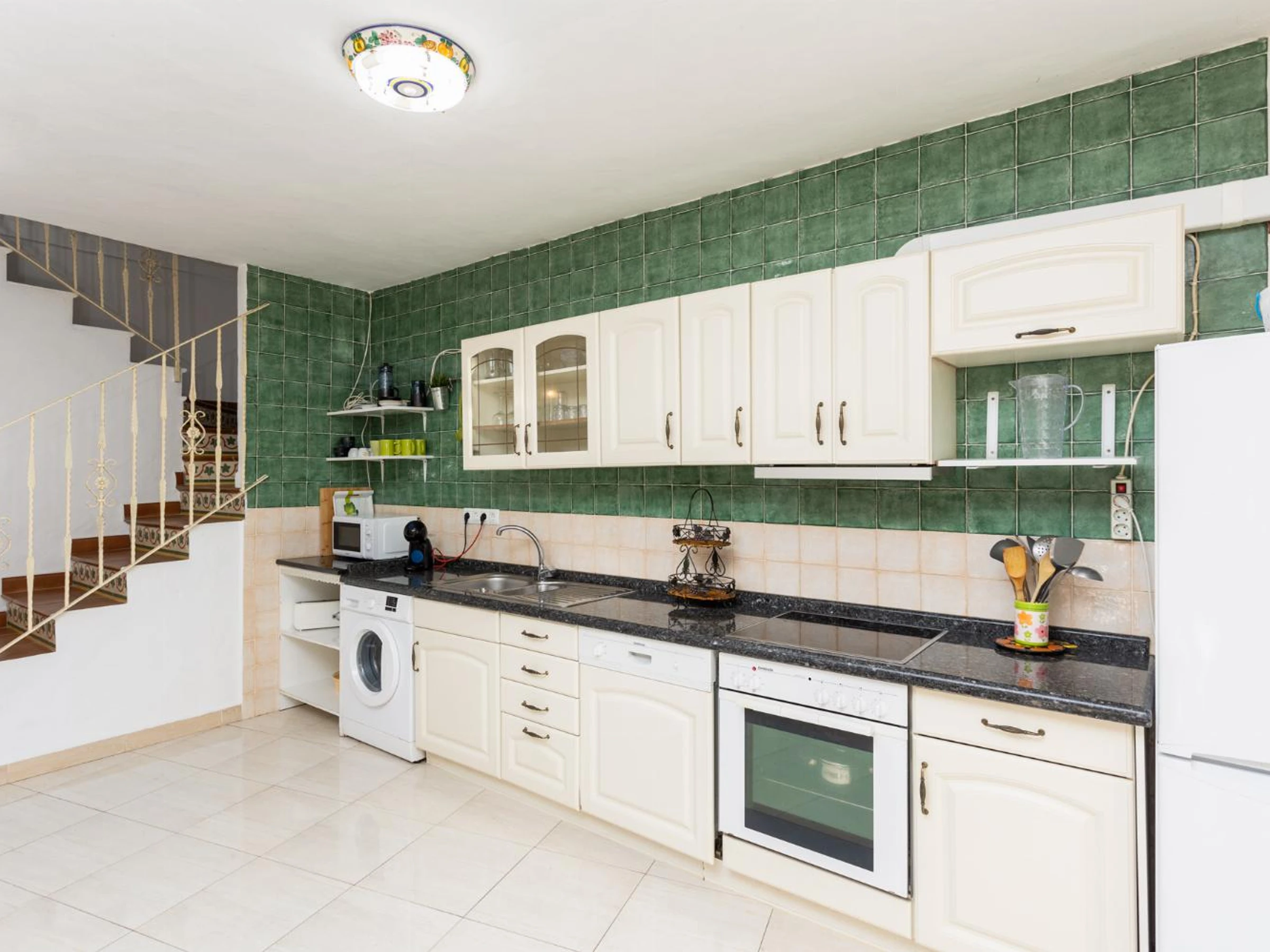 Dieses küche, ist ausgestattet in kühlschrank, mikrowelle, backofen, gefrierschrank, spülmaschine, kaffeemaschine und toaster.