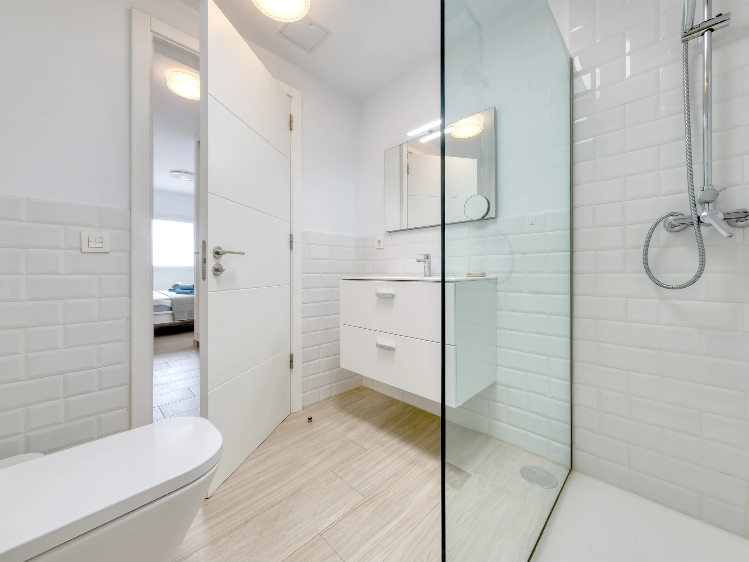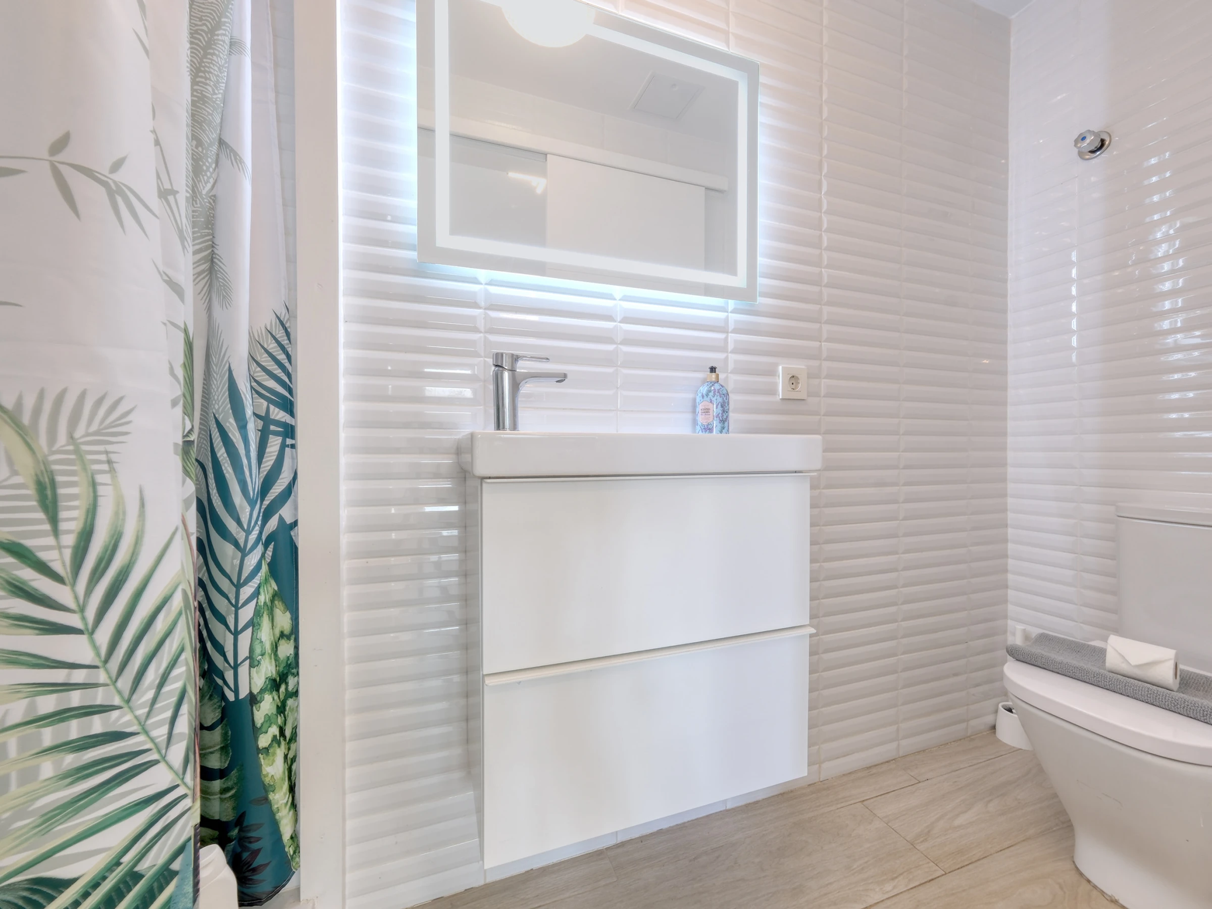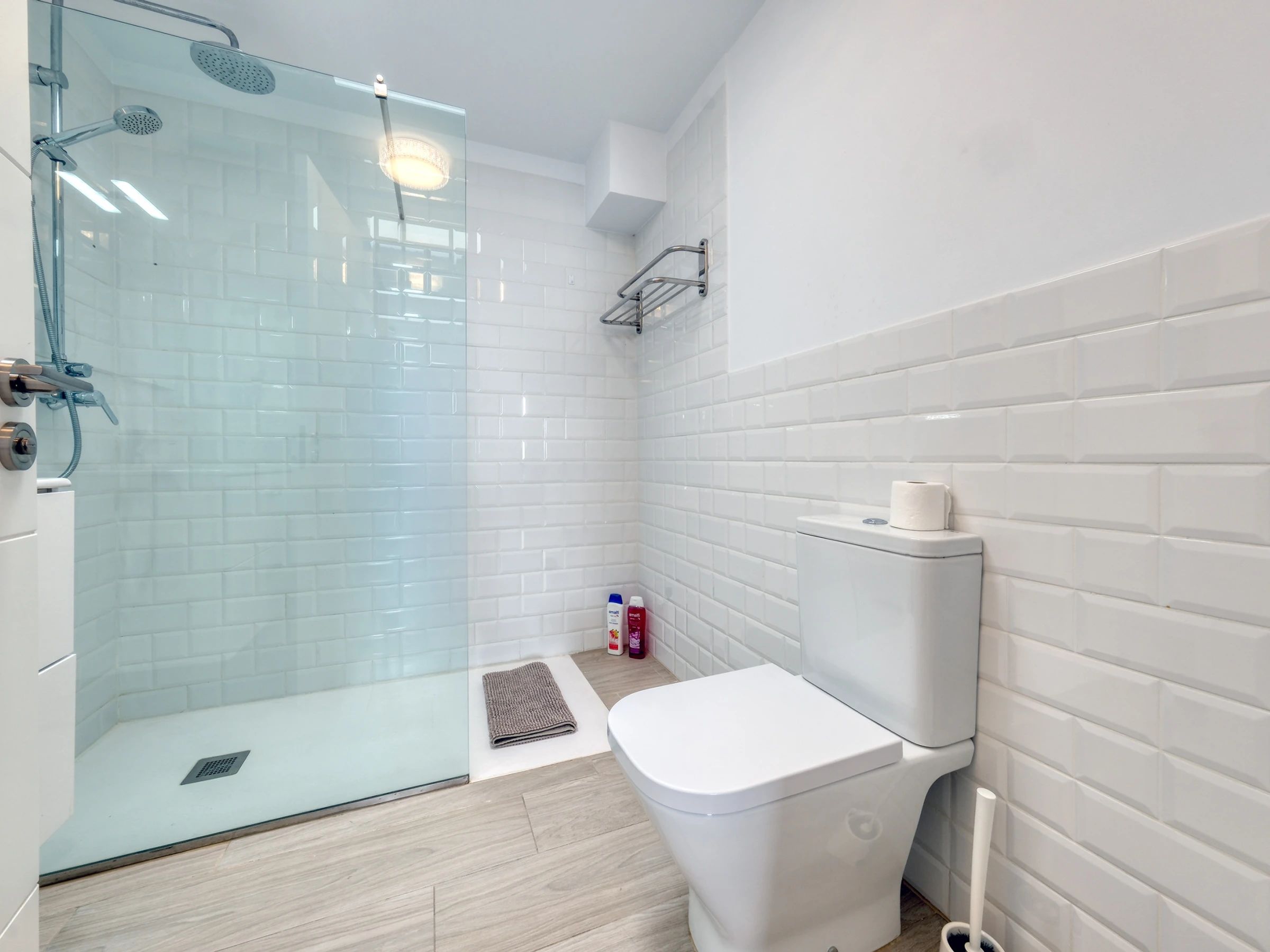 Außerdem verfügt es über drei vollständige Badezimmer mit Dusche und WC, die in der Wohnung verteilt sind: zwei im Obergeschoss und eines im Erdgeschoss, die darauf ausgelegt sind, allen Gästen Privatsphäre und Komfort zu gewährleisten.