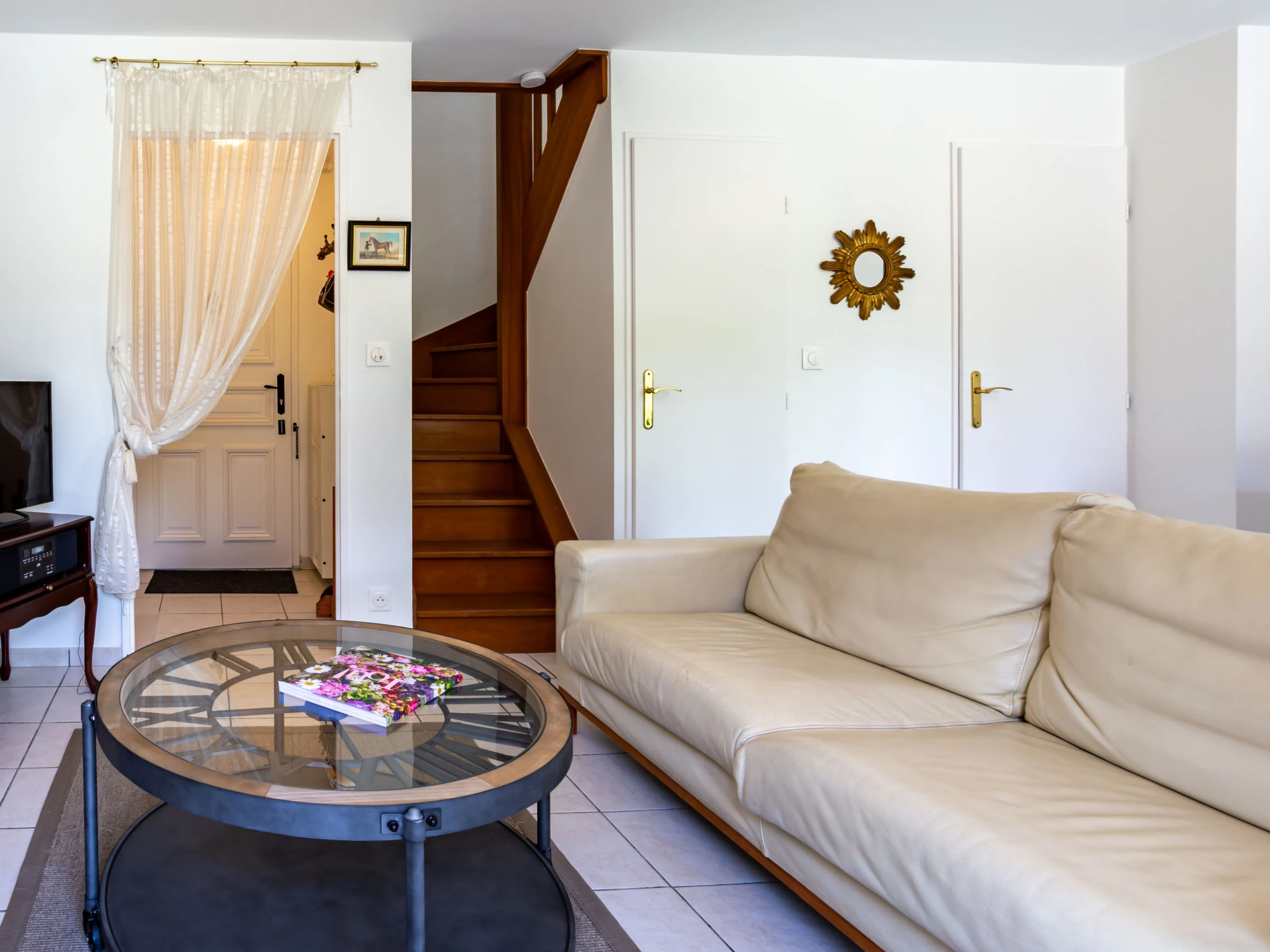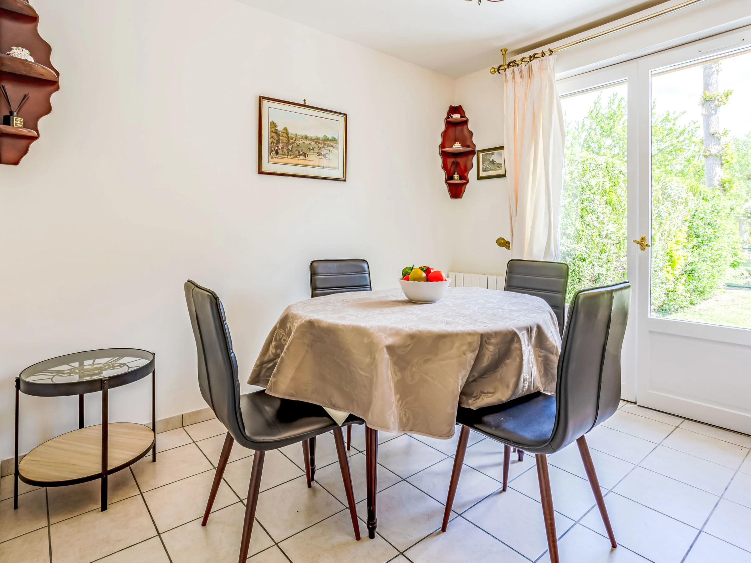 3-Zimmer-Reihenhaus 55 m2 auf 2 Stockwerken. Eingang. Wohn-/Esszimmer mit offenem Kamin (nur Deko), TV (Flachbildschirm). Ausgang zum Garten. Küche (4 Kochplatten, Backofen, Geschirrspüler, Toaster, Wasserkocher, Mikrowelle, elektrische Kaffeemaschine). Sep. WC. E-Heizung. Obergeschoss: 1 Zimmer mit 1 franz. Bett (1 x 180 cm, Länge 200 cm), TV (Flachbildschirm). 1 Zimmer mit 1 franz. Bett (1 x 140 cm, Länge 190 cm), TV (Flachbildschirm). Dusche/WC. Garten, Ostlage und Südlage, Rasen. Terrassenmöbel, Liegestühle. Zur Verfügung: Waschmaschine, Wäschetrockner. Internet (Wireless LAN, gratis). Parkplatz. Bitte beachten: Nichtraucher-Unterkunft. Rauchmelder. [hidden]
