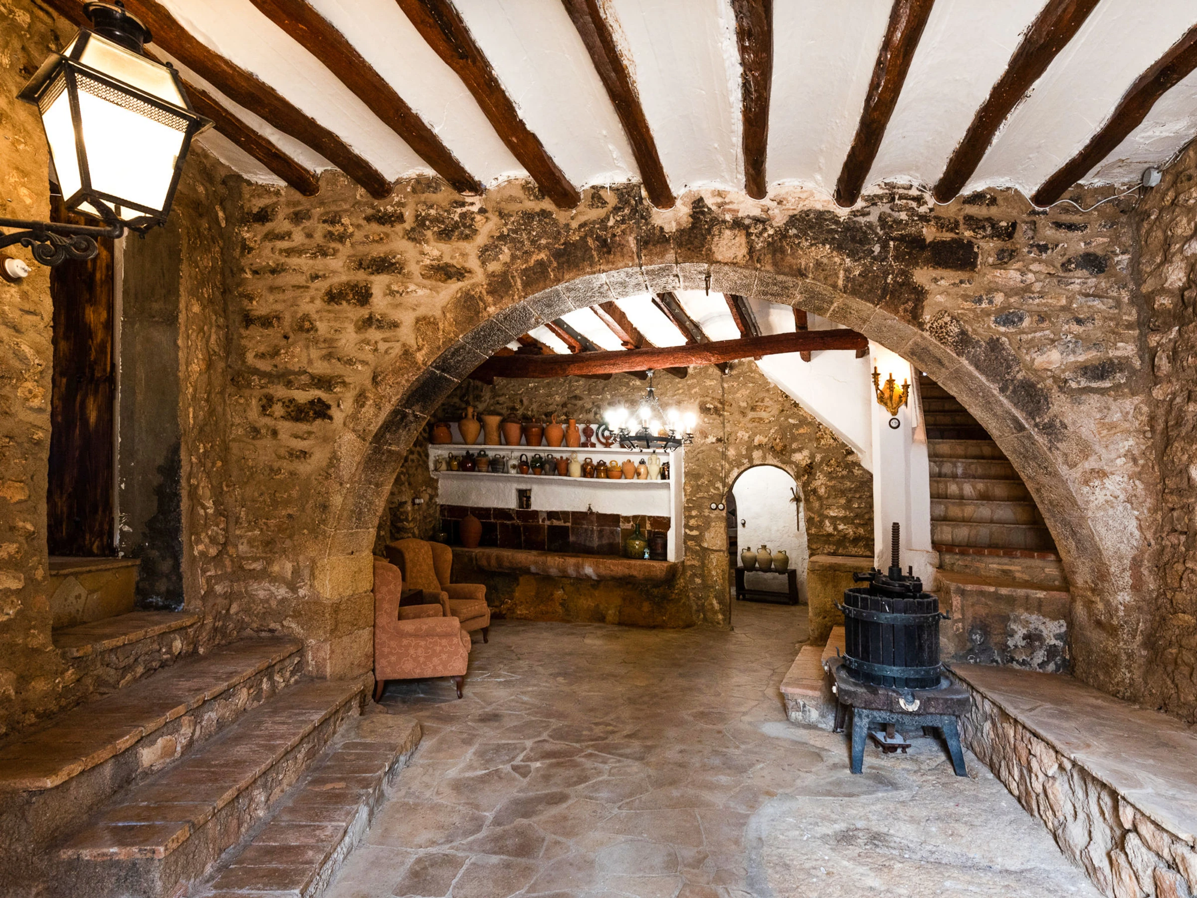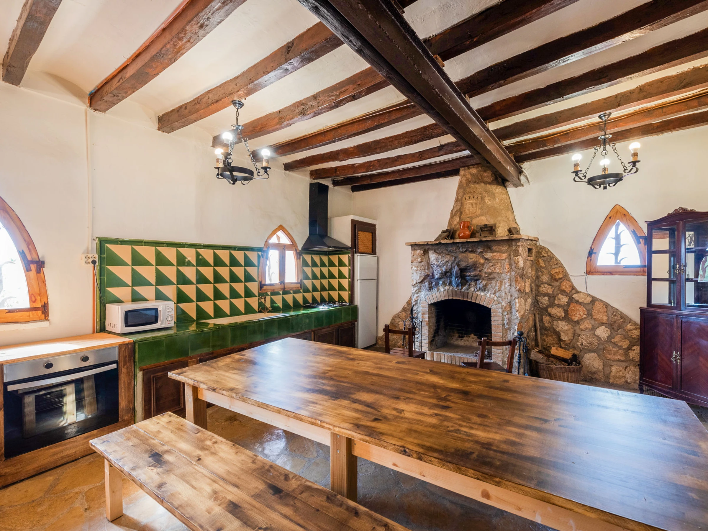 El Catllar: Alte, rustikale, historische Finca "Mas d´en Tarres", auf 2 Stockwerken, umgeben von Feldern. Ruhige Lage, 10 km vom Meer, 10 km vom Strand, im Grünen. Zur Alleinbenutzung: Grundstück 2 ha (eingezäunt) mit Rasen und Bäumen, Naturgarten, Schwimmbad (7 x 3 m, 21 m2, 120 - 150 cm tief, saisonale Verfügbarkeit: [hidden] - [hidden] Tischtennis, Grill, Grillhaus, Kinderspielplatz (Rutschbahn, Schaukel), Parkplatz (für 8 Autos). Einkaufsgeschäft 3.5 km, Lebensmittelgeschäft 3.5 km, Supermarkt 4.5 km, Restaurant 3.5 km, Bar 3.5 km, Bushaltestelle "El Catllar" 4 km, Bahnstation "Torredembarra" 13 km. Bitte beachten: Fahrzeug empfohlen. Objekt geeignet für 20 Erwachsene geeignet für Events.