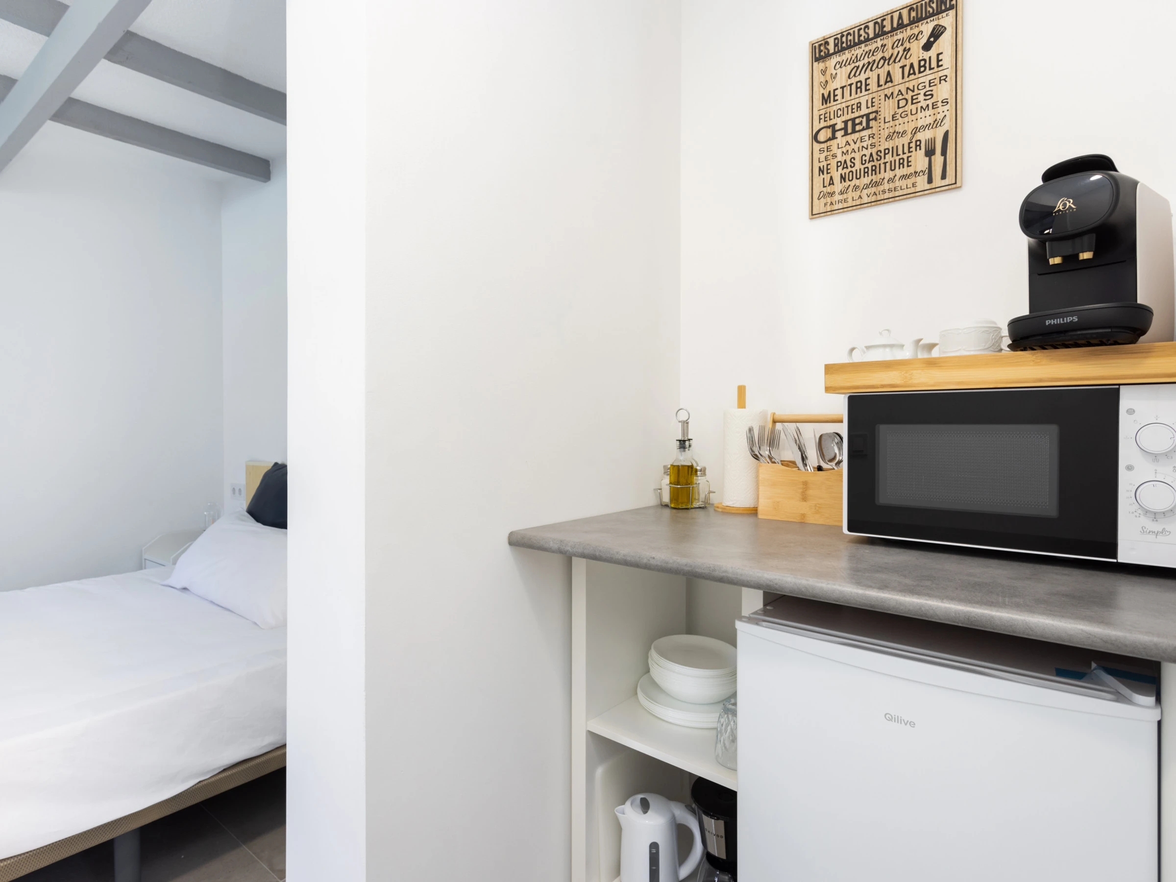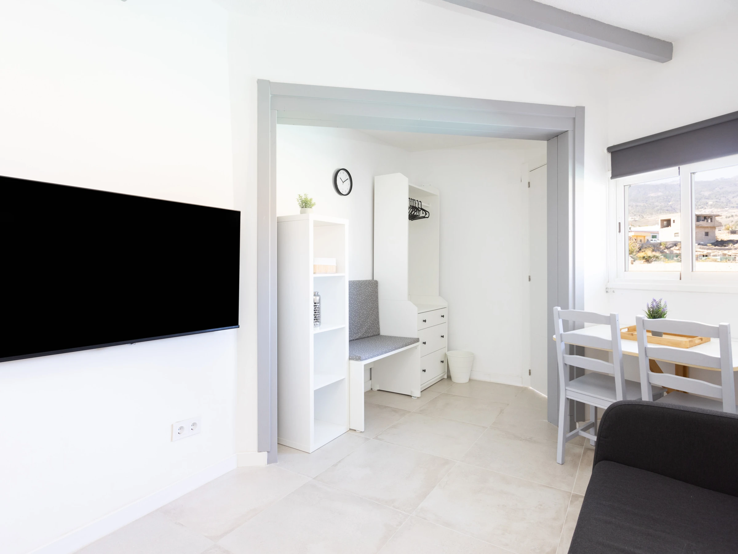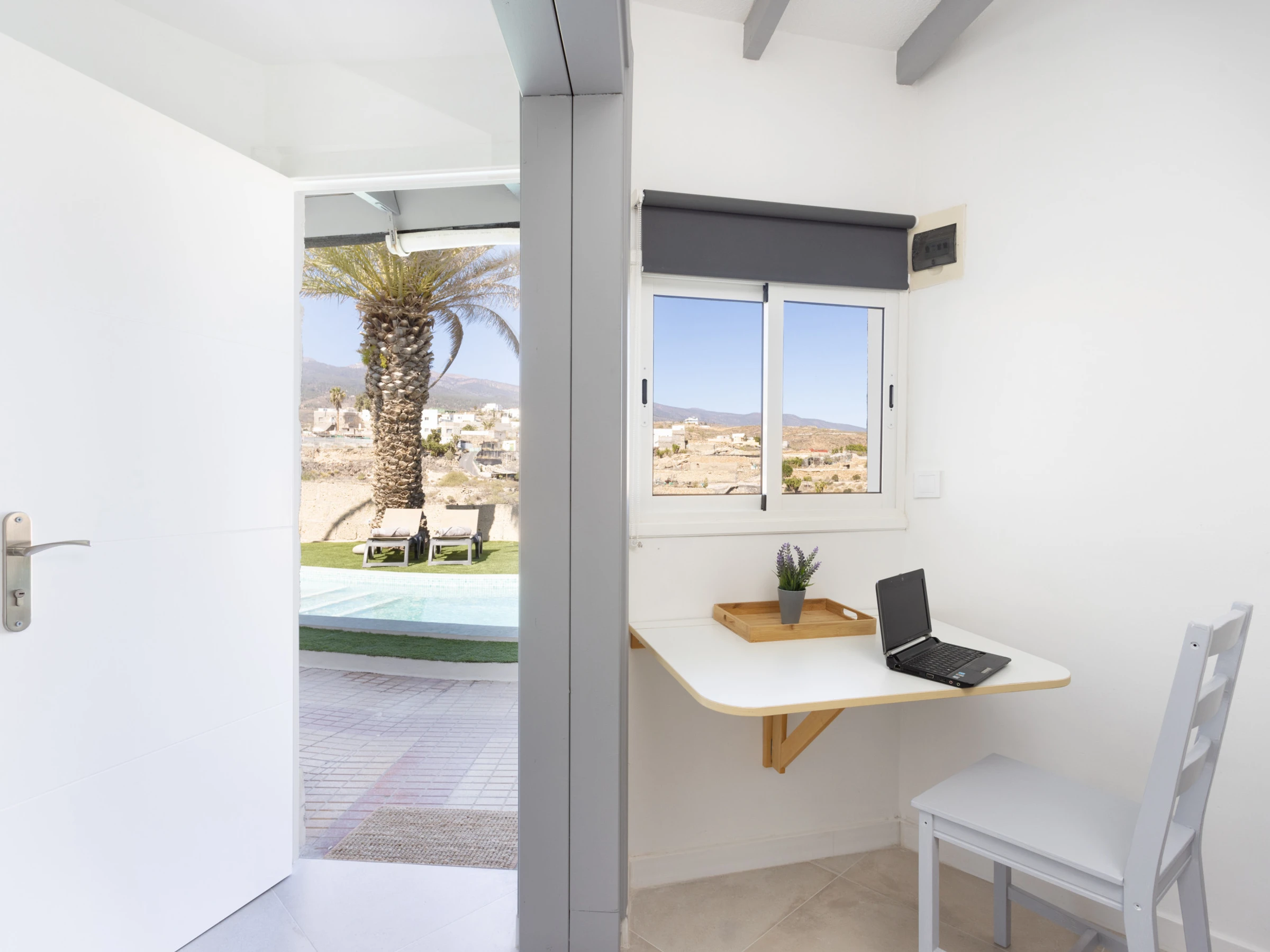 Dieses gemütliche Doppelstudio, das sich in unserer Unterkunft Oasis Tenerife Rentals befindet, ist klein, aber mit allem ausgestattet, was Sie für einen komfortablen Aufenthalt benötigen. Es verfügt über ein bequemes Doppelbett, einen Esstisch mit wunderbarem Blick auf den Pool und die Berge, eine kleine Küchenzeile und ein privates Badezimmer mit Whirlpool-Dusche, ideal zum Entspannen am Ende des Tages.