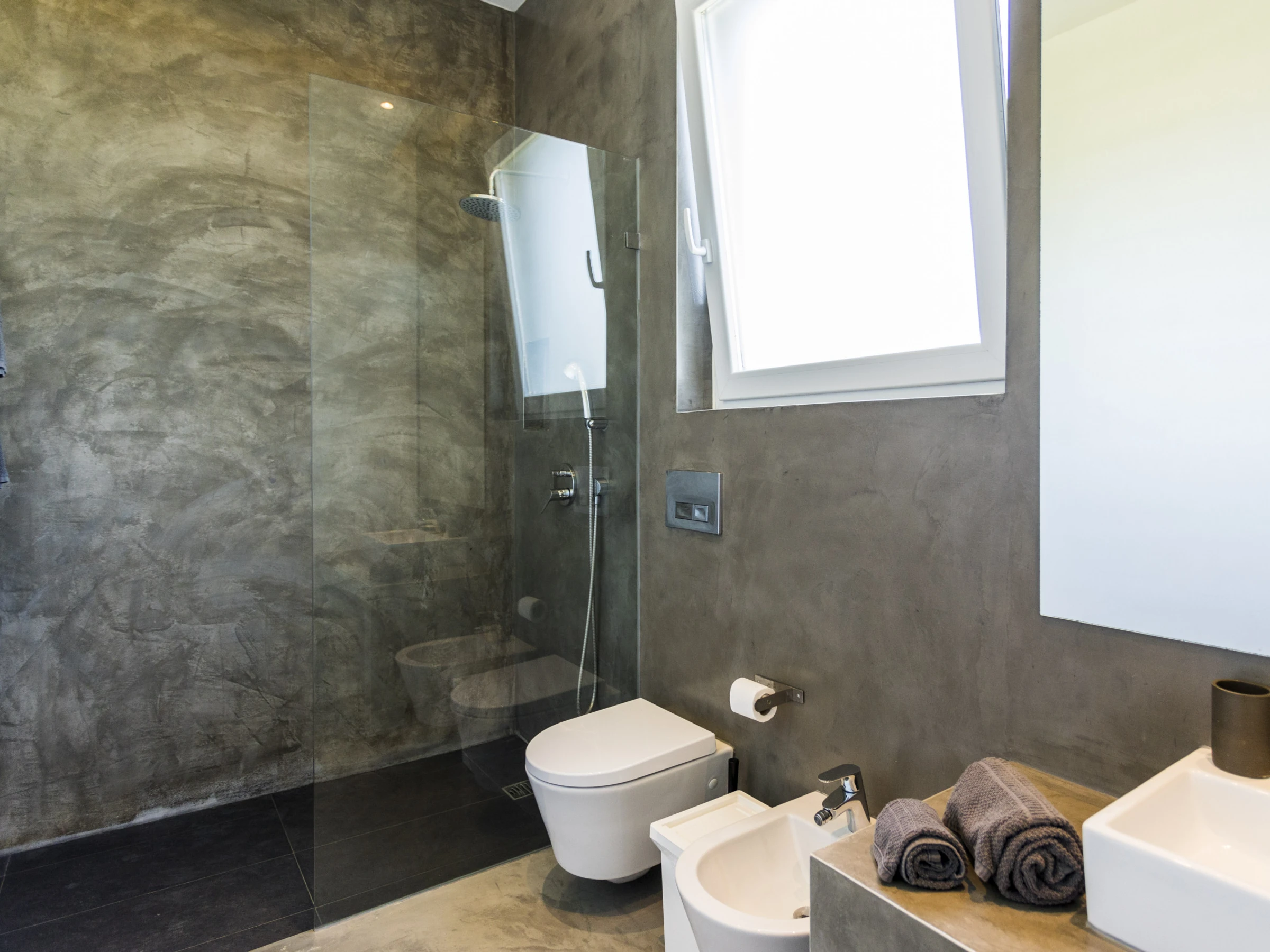 Each bedroom has its own private bathroom, which are done up in modern marble. The indoor dining area has space for everyone to be seated, and boasts a huge window that overlooks the swimming pool, which is just the other side of the wall. The main indoor living area is a massive open plan space with tonnes of sofa space and a flat-screen TV, with huge sliding doors that lead onto the terrace and feed light into the house all day long.