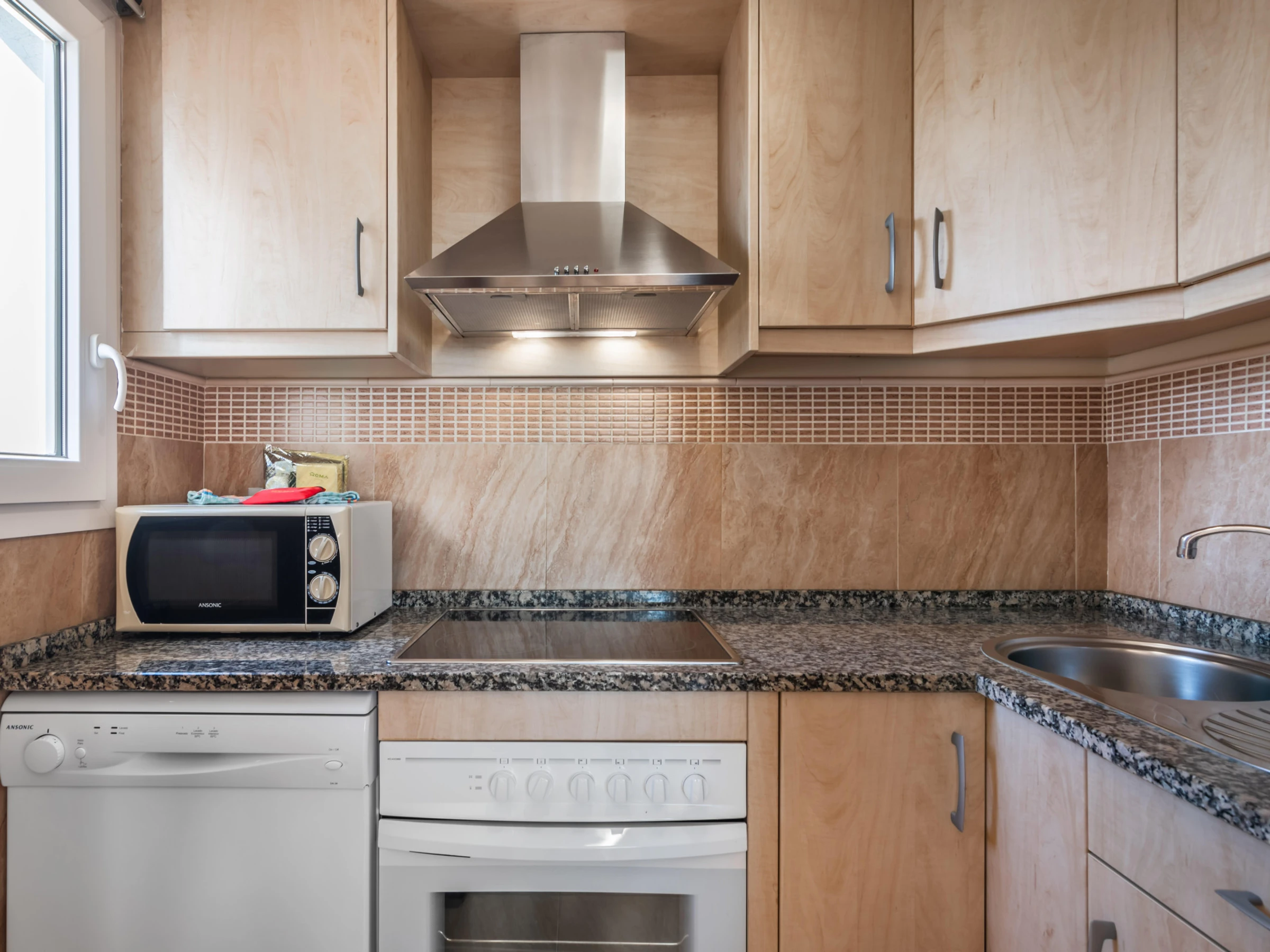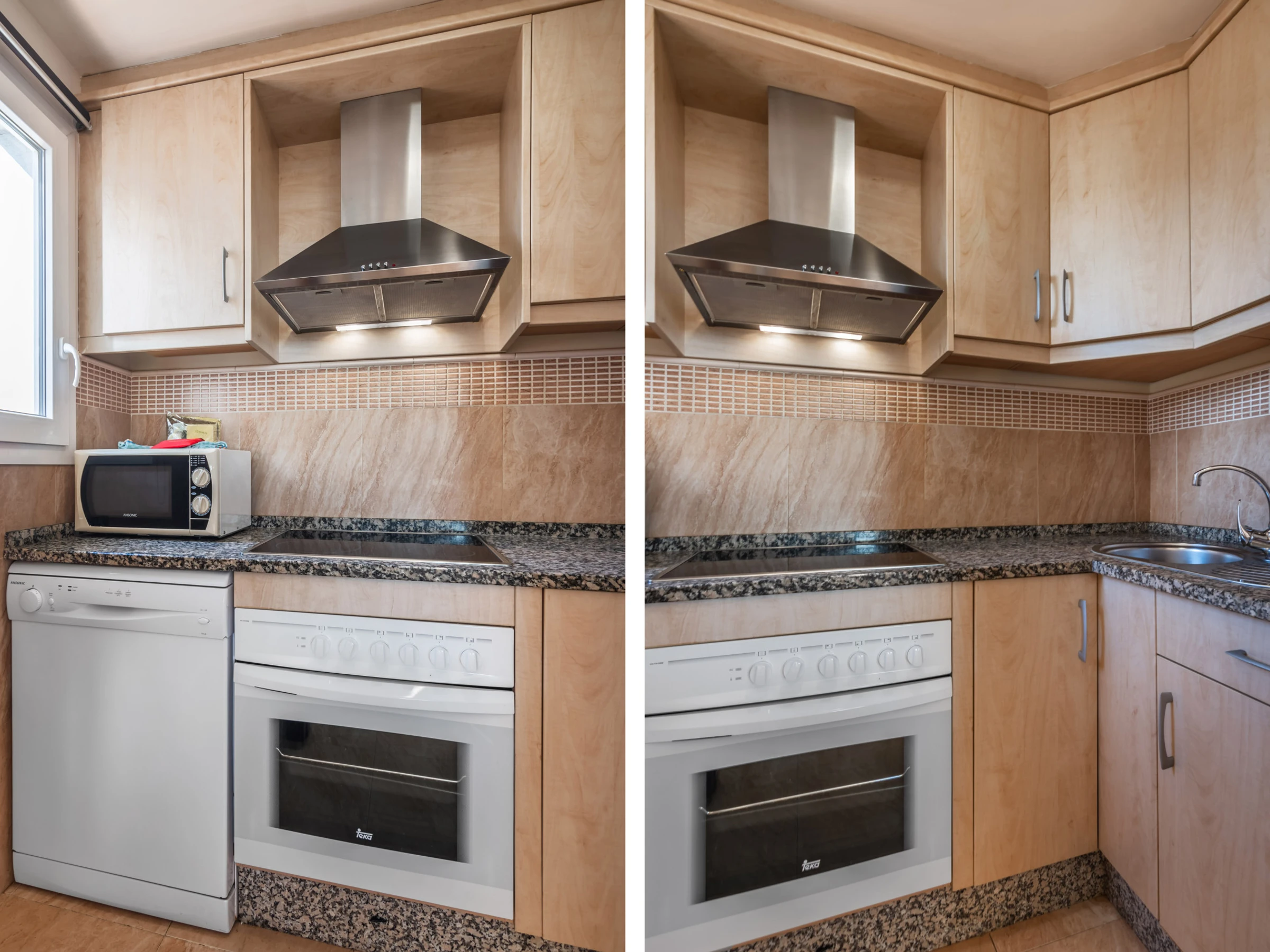 Dieses separate küche, mit ceranfeld, ist ausgestattet in kühlschrank, mikrowelle, backofen, gefrierschrank, spülmaschine, geschirr/besteck, kochutensilien, kaffeemaschine, toaster und saftpresse.