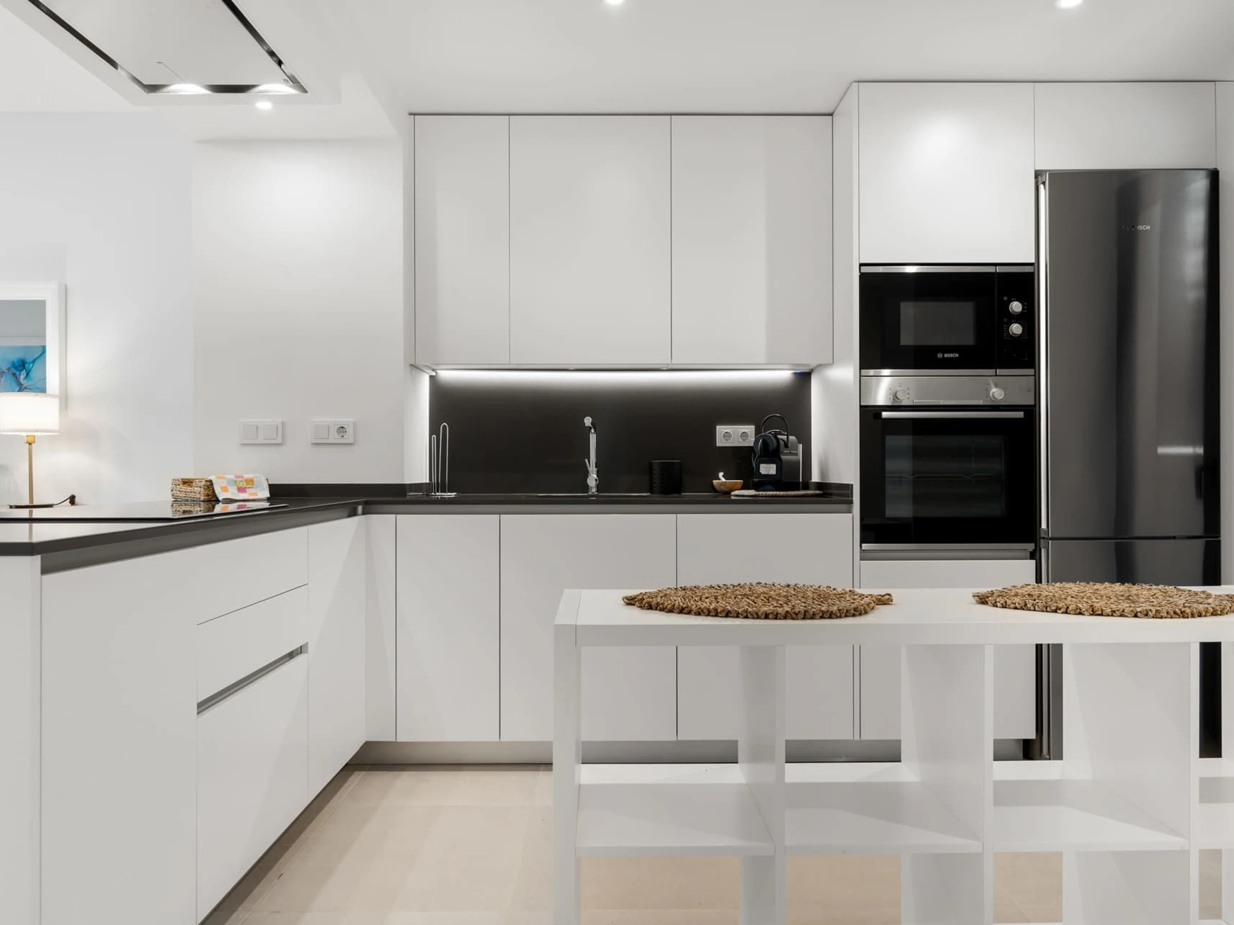 Dieses offene küche, elektrisches kochfeld, ist ausgestattet in kühlschrank, mikrowelle, backofen, gefrierschrank, spülmaschine, geschirr/besteck, kochutensilien, kaffeemaschine, toaster, wasserkocher, küchengeschirr, herdplatte.