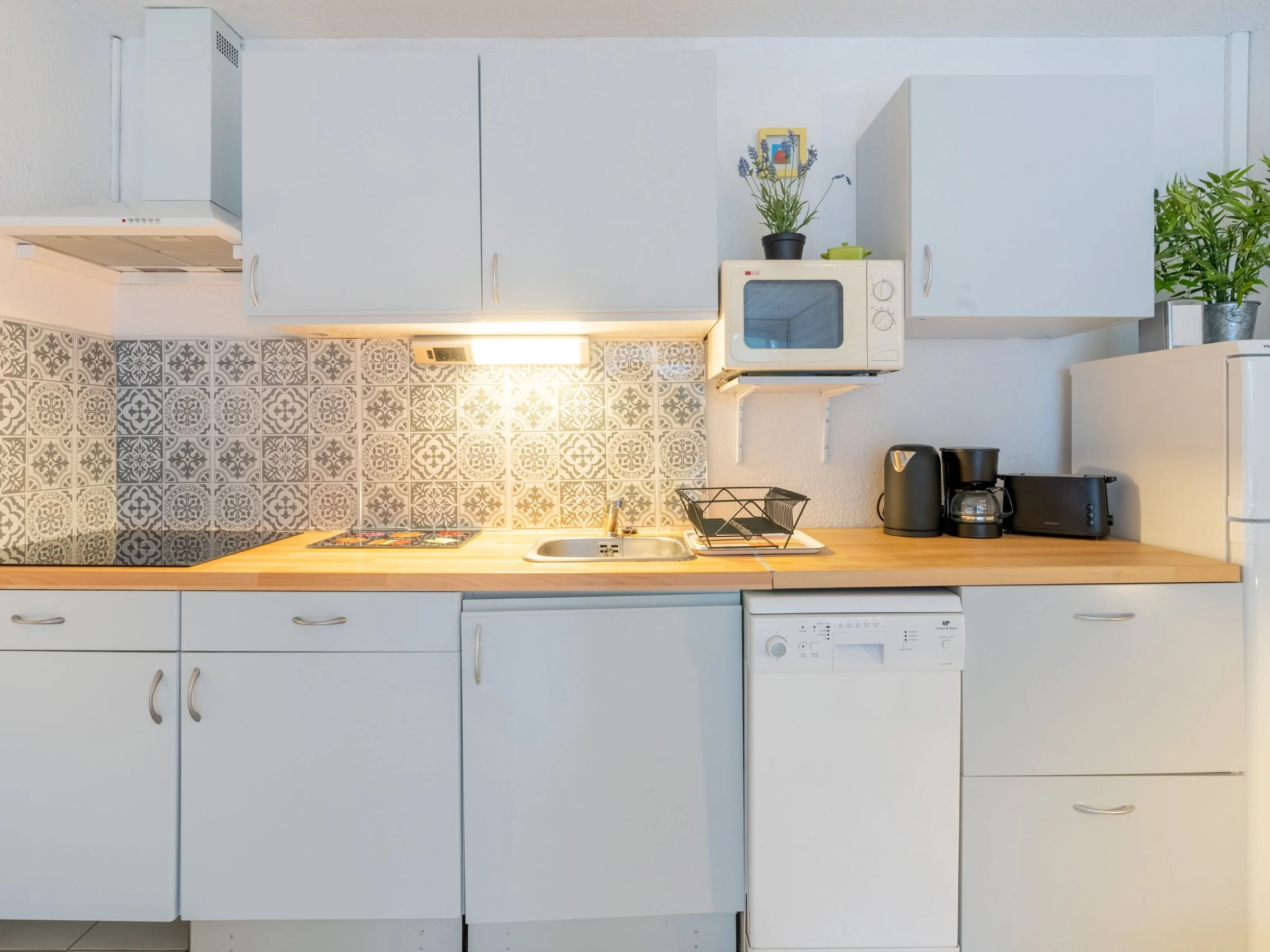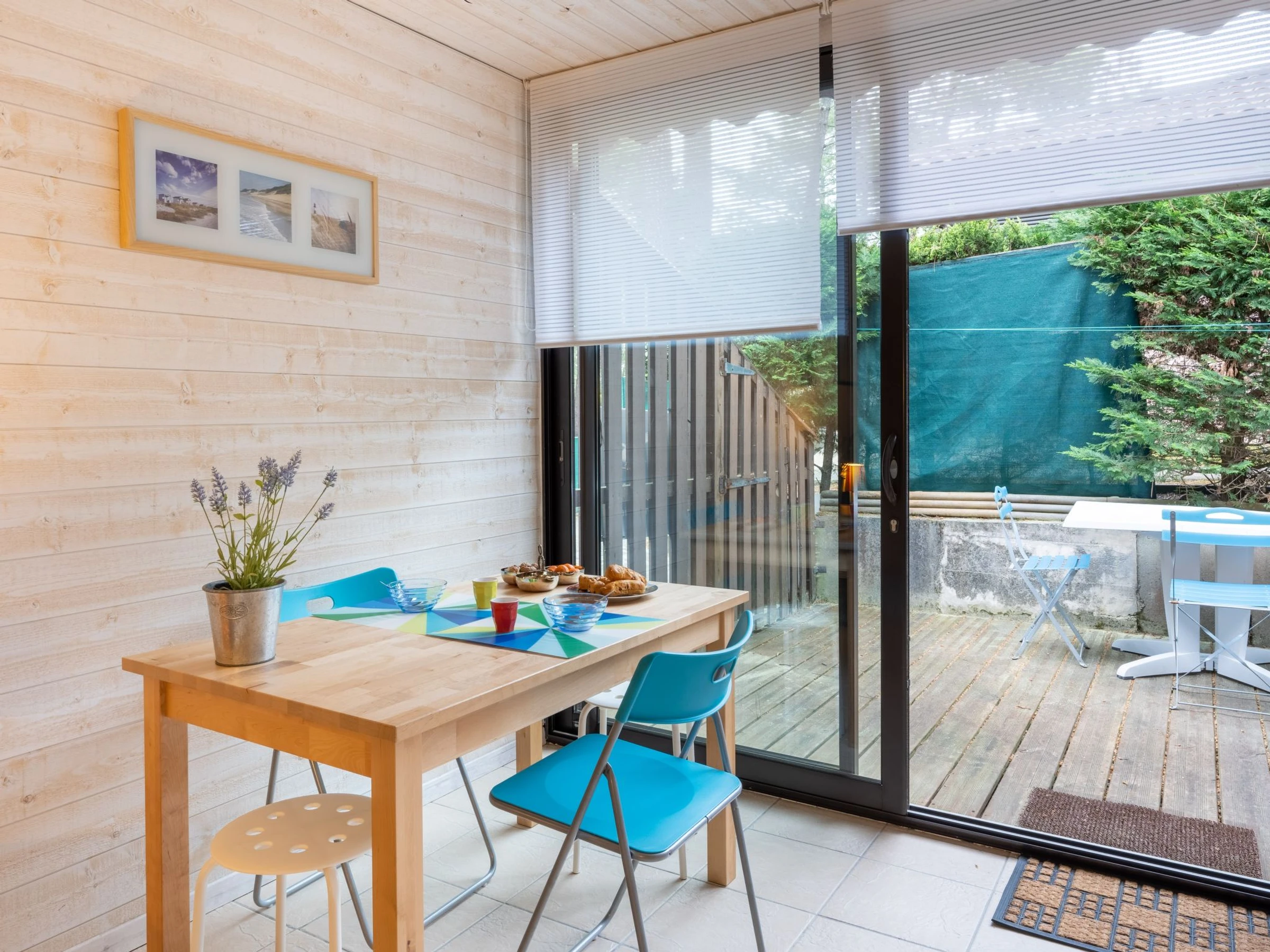 2-Zimmer-Reihenhaus 35 m2. Objekt geeignet für 2 Erwachsene + 2 Kinder. Komfortabel und schön eingerichtet: Wohn-/Esszimmer mit Veranda mit 1 Doppeldiwanbett (160 cm, Länge 190 cm), TV. Ausgang zur Terrasse. 1 Zimmer mit 2 Betten (80 cm, Länge 190 cm). Offene Küche (Geschirrspüler, 3 Induktionskochplatten, Toaster, Wasserkocher, Mikrowelle, elektrische Kaffeemaschine). Dusche, sep. WC. E-Heizung. Terrasse 12 m2, Ostlage. Terrassenmöbel, Elektrogrill. Zur Verfügung: Waschmaschine, Haartrockner. Internet (WLAN, extra). Parkplatz. Bitte beachten: geeignet für Familien. Nichtraucher-Unterkunft. Rauchmelder.