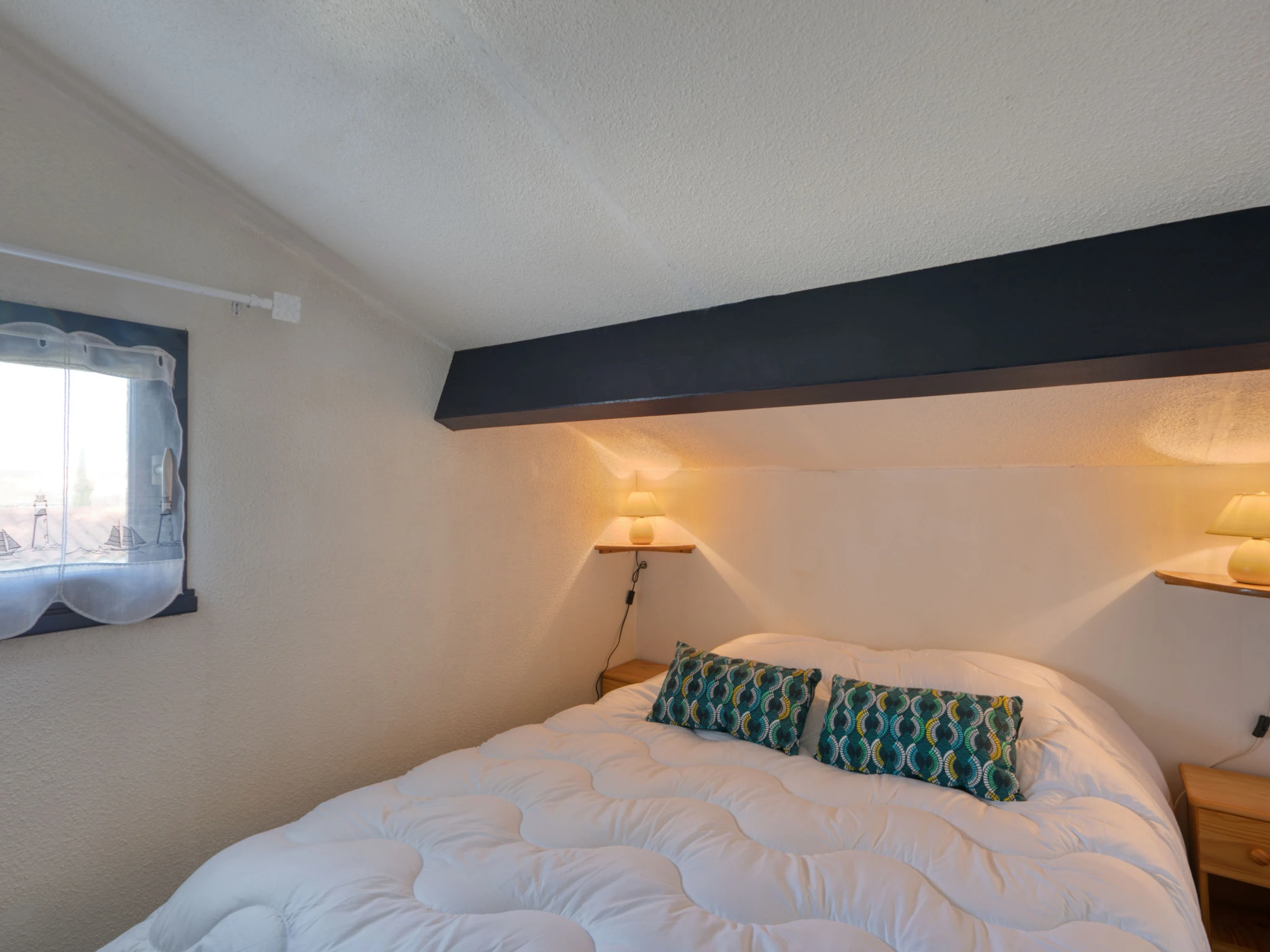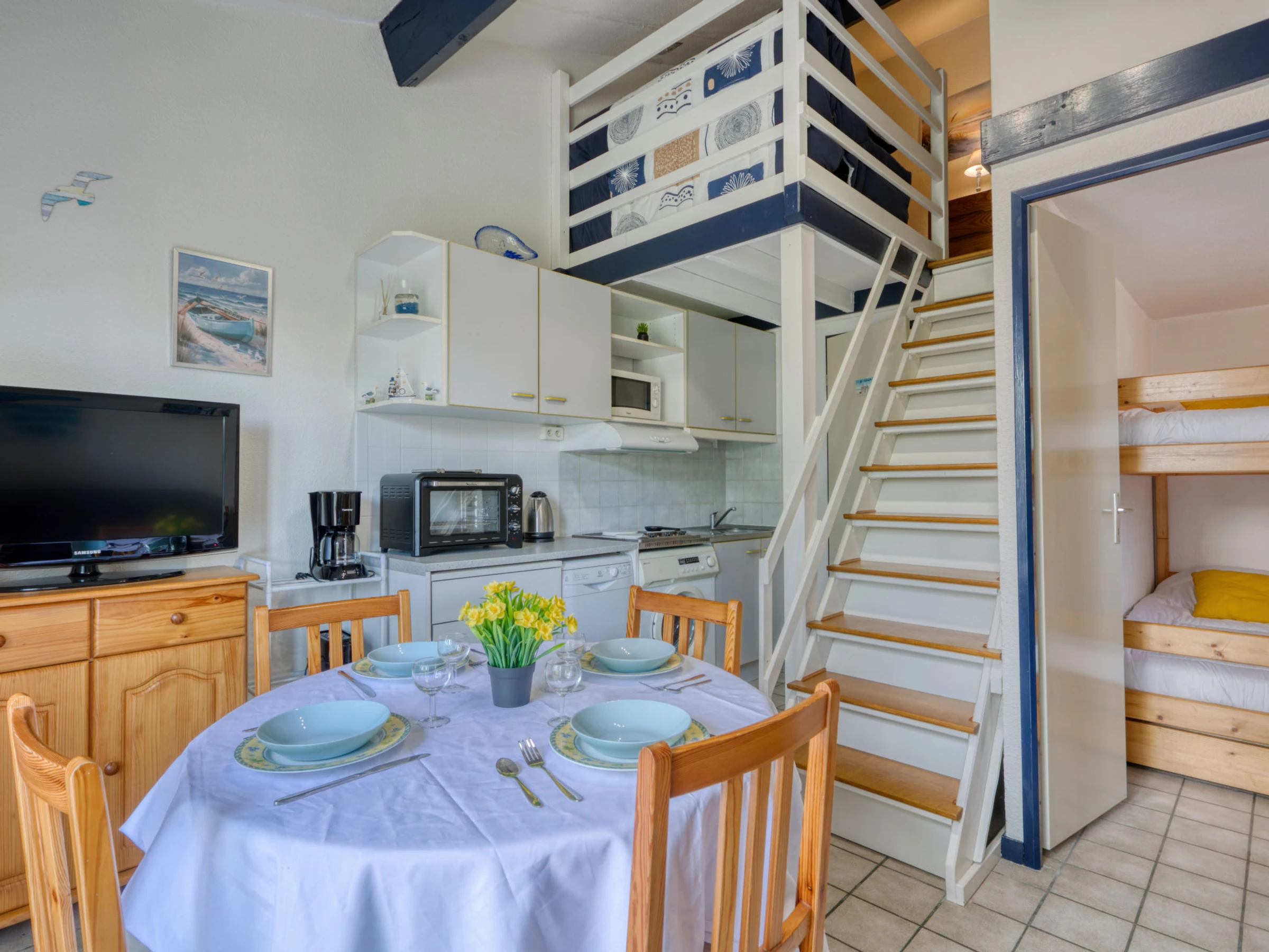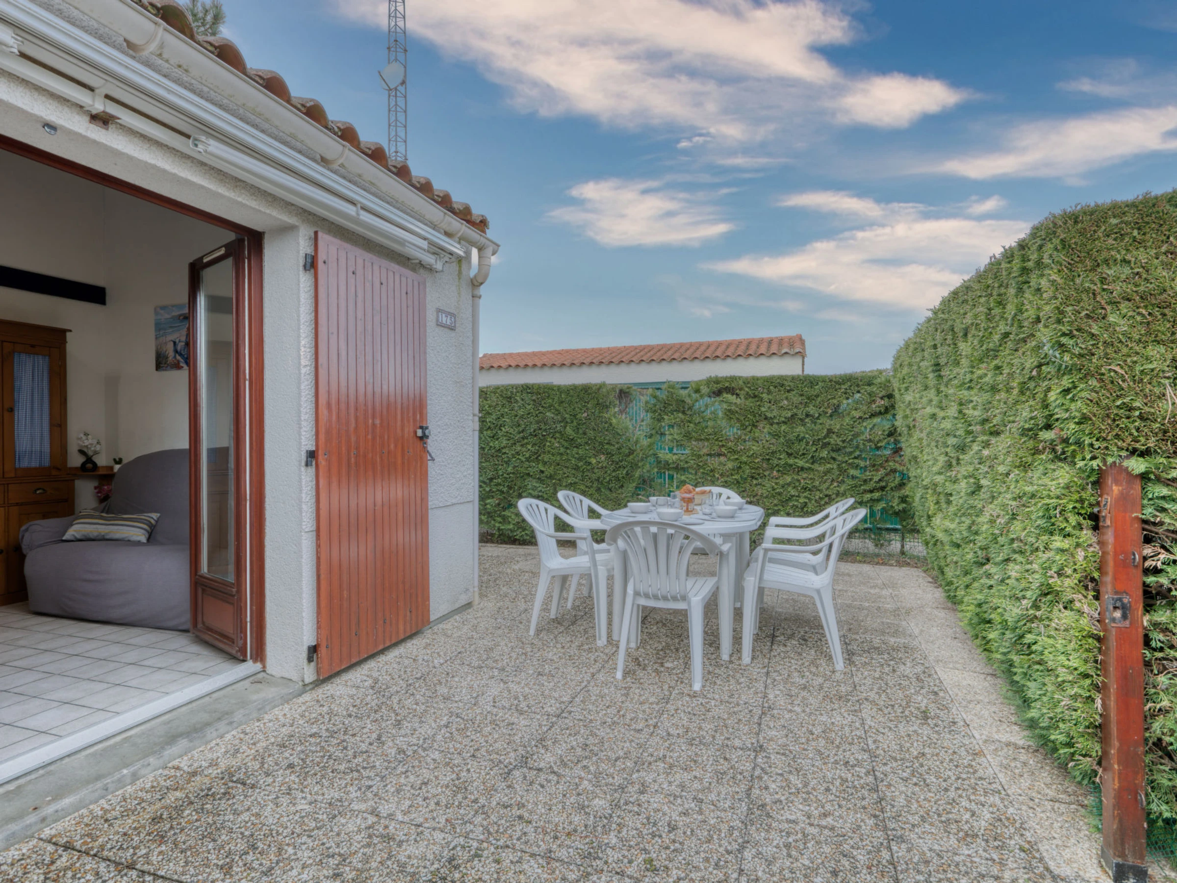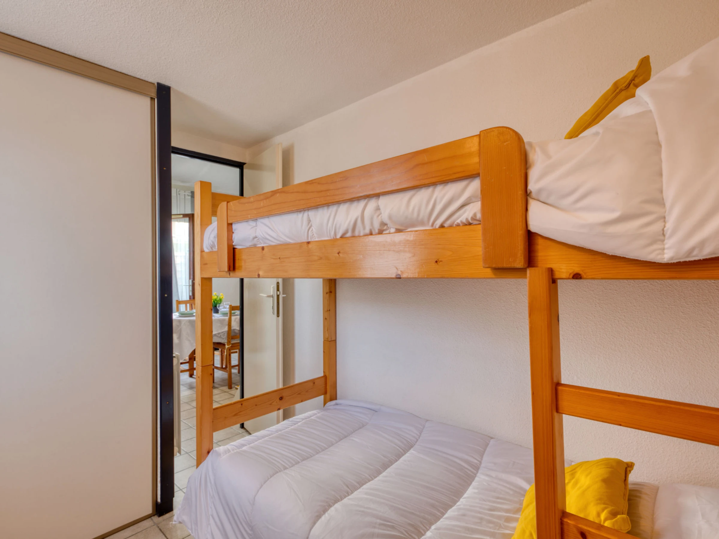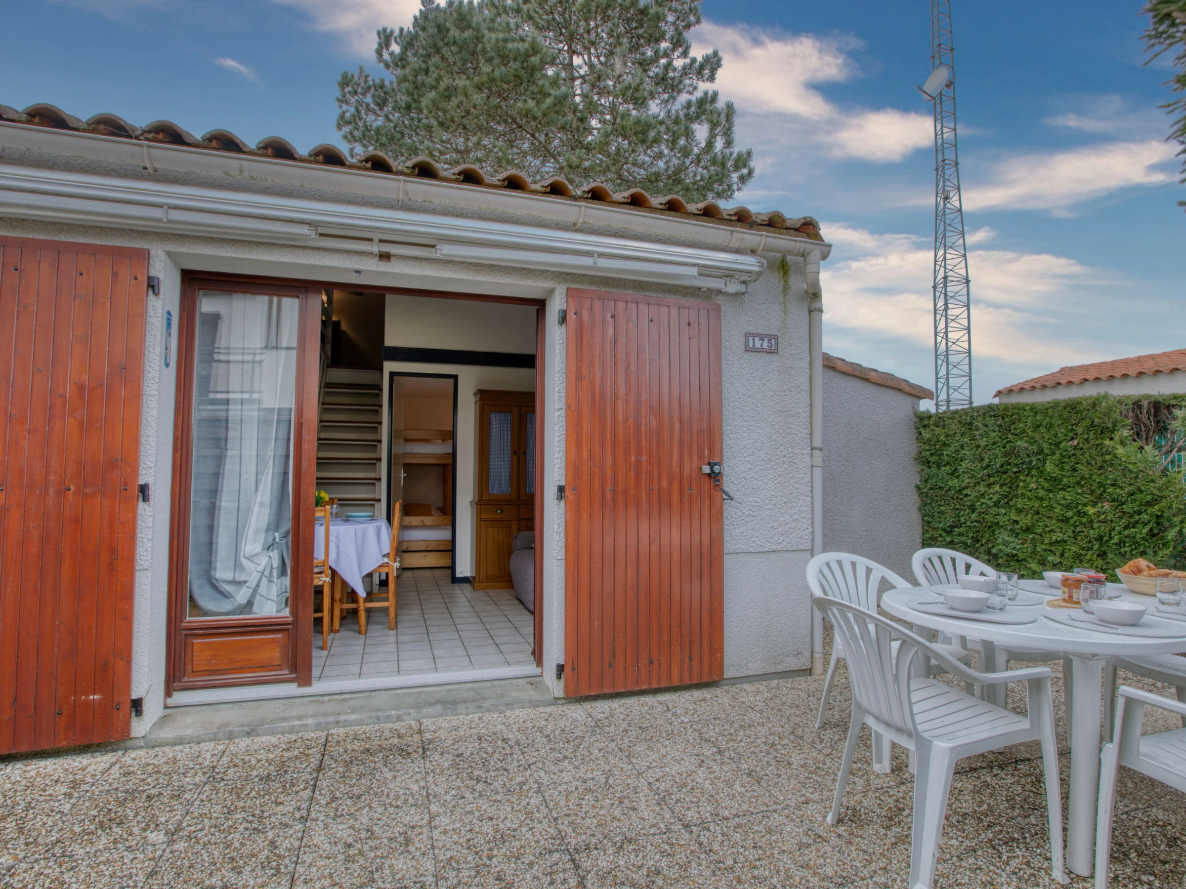 3-Zimmer-Reihenhaus 37 m2 auf 2 Stockwerken. Wohnzimmer mit TV (Flachbildschirm). Ausgang zur Terrasse. 1 Zimmer mit 1 x 2 Etagenbetten (80 cm, Länge 190 cm). Kochnische (3 Kochplatten, Geschirrspüler, Toaster, Wasserkocher, Mikrowelle, Tiefkühler, elektrische Kaffeemaschine). Dusche, sep. WC. E-Heizung. Obergeschoss: Galerie mit 1 Diwanbett (140 cm, Länge 190 cm). 1 abgeschrägtes Zimmer mit 1 franz. Bett (1 x 140 cm, Länge 190 cm). Grosse Terrasse 25 m2, Westlage. Terrassenmöbel, Elektrogrill. Zur Verfügung: Waschmaschine, Haartrockner. Internet (WLAN, gratis). Parkplatz Nr. 175. Bitte beachten: Maximal 1 kleines Haustier/Hund erlaubt. Rauchmelder. Inserat einer Privatperson nach Artikel 155, IV, CGI.