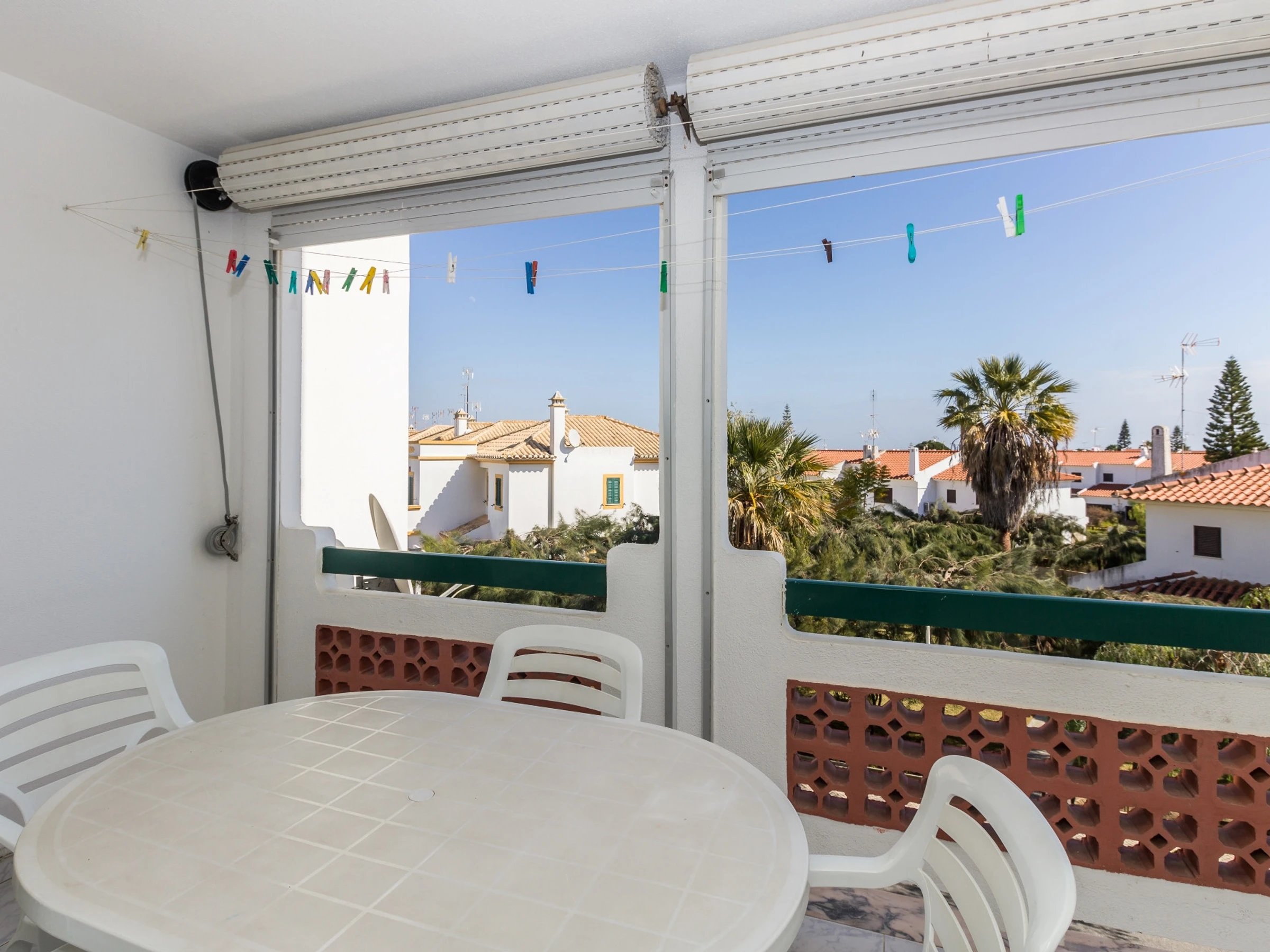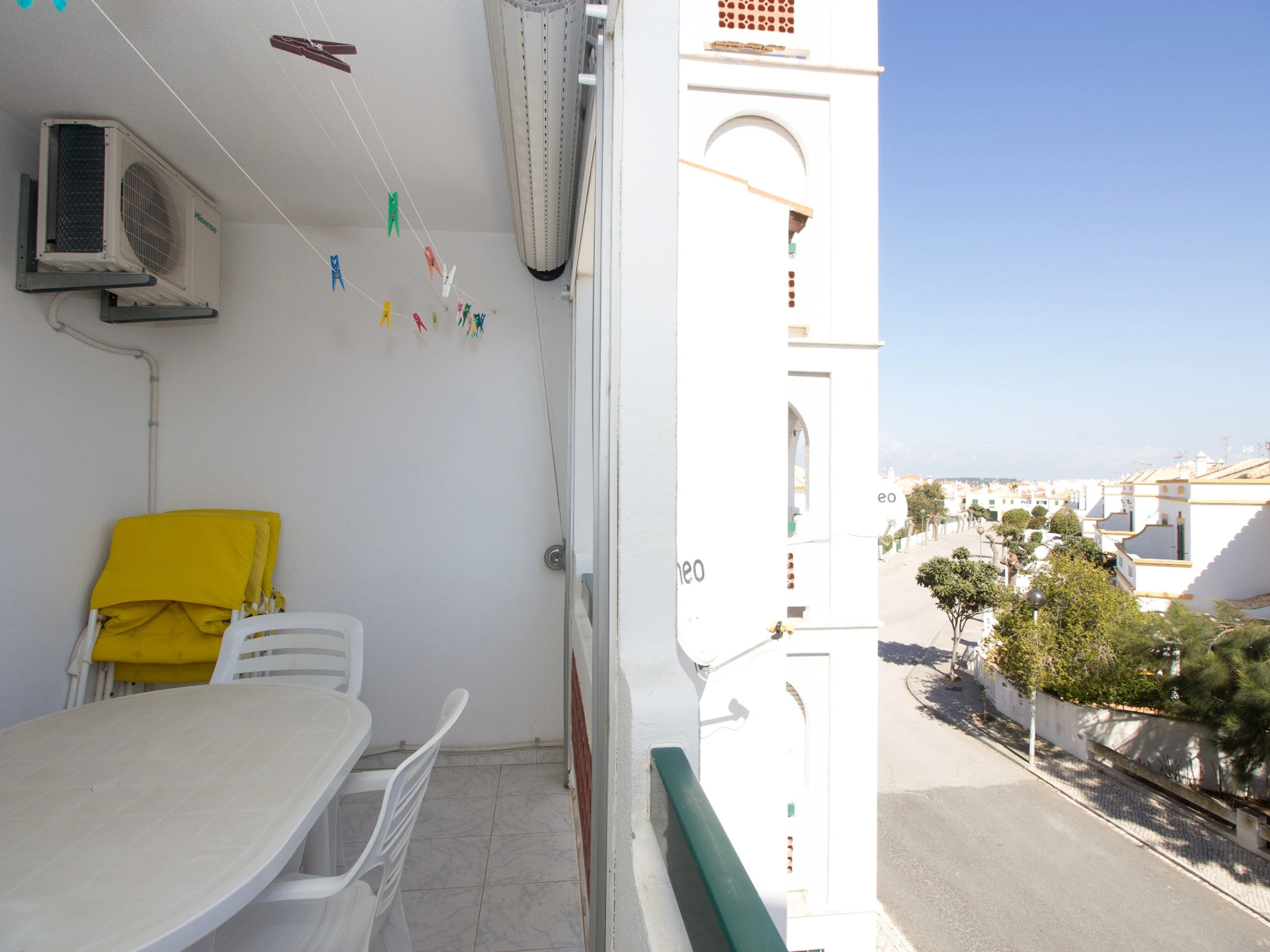 Balkon mit Tisch und Stühlen.