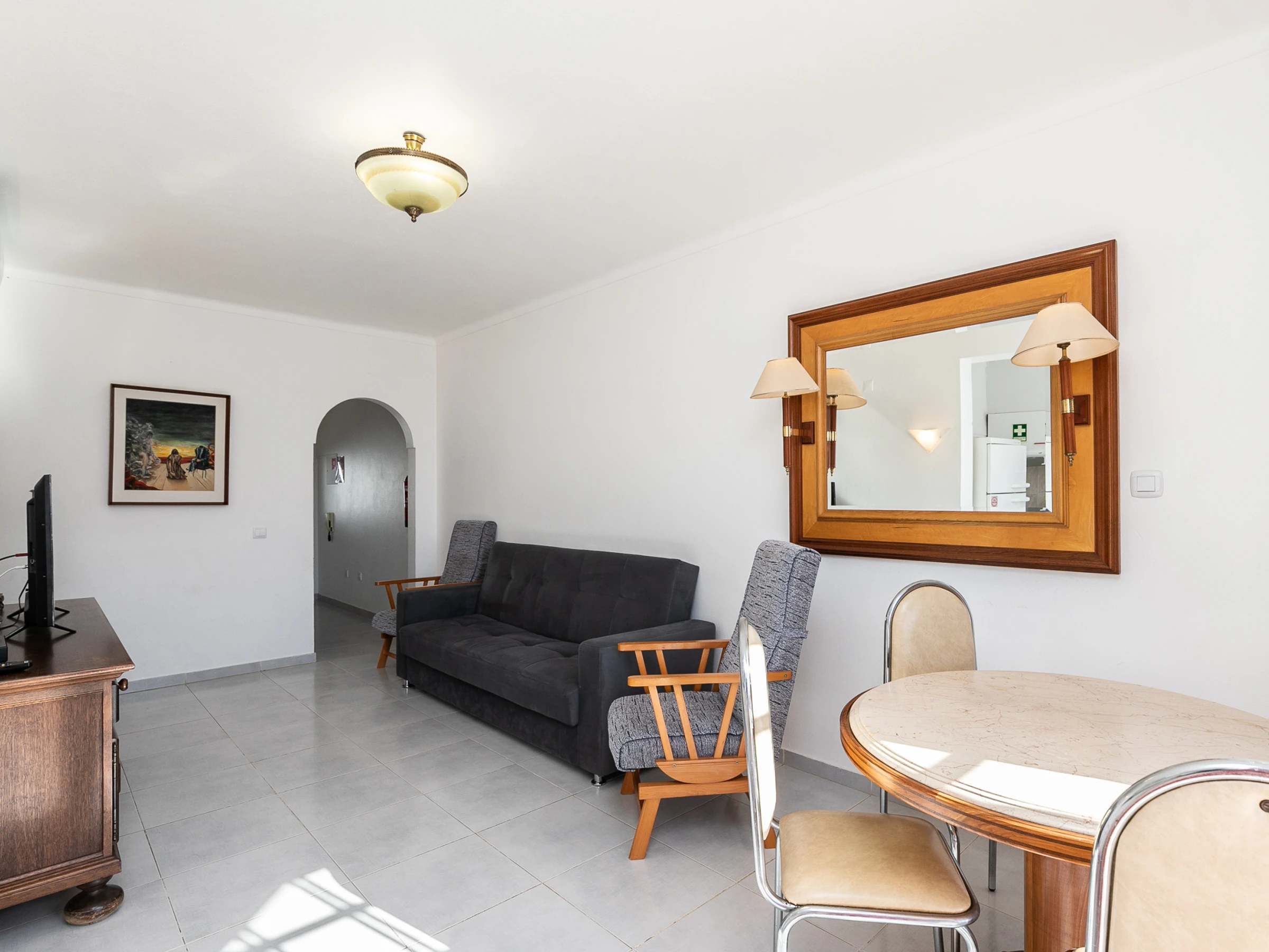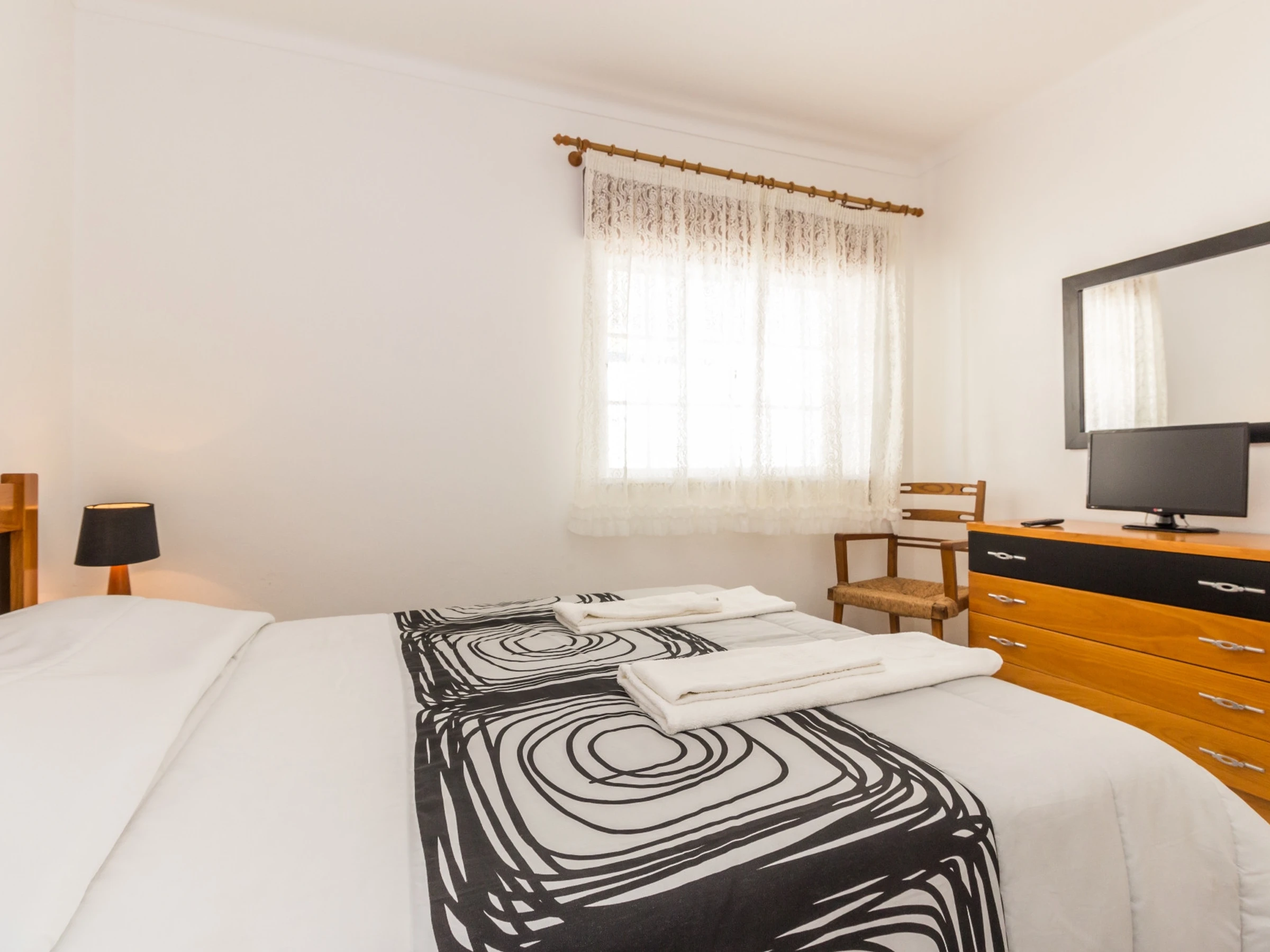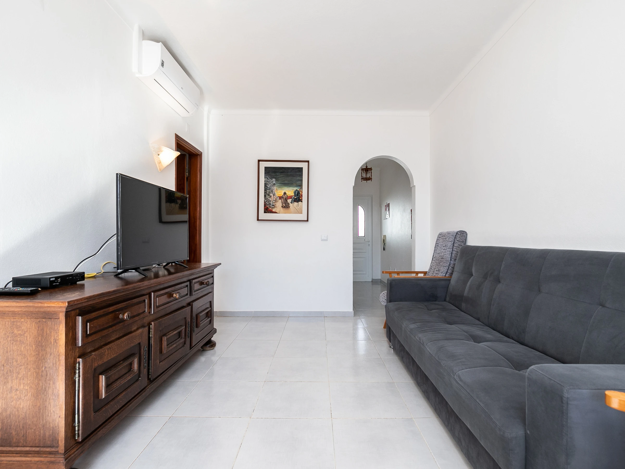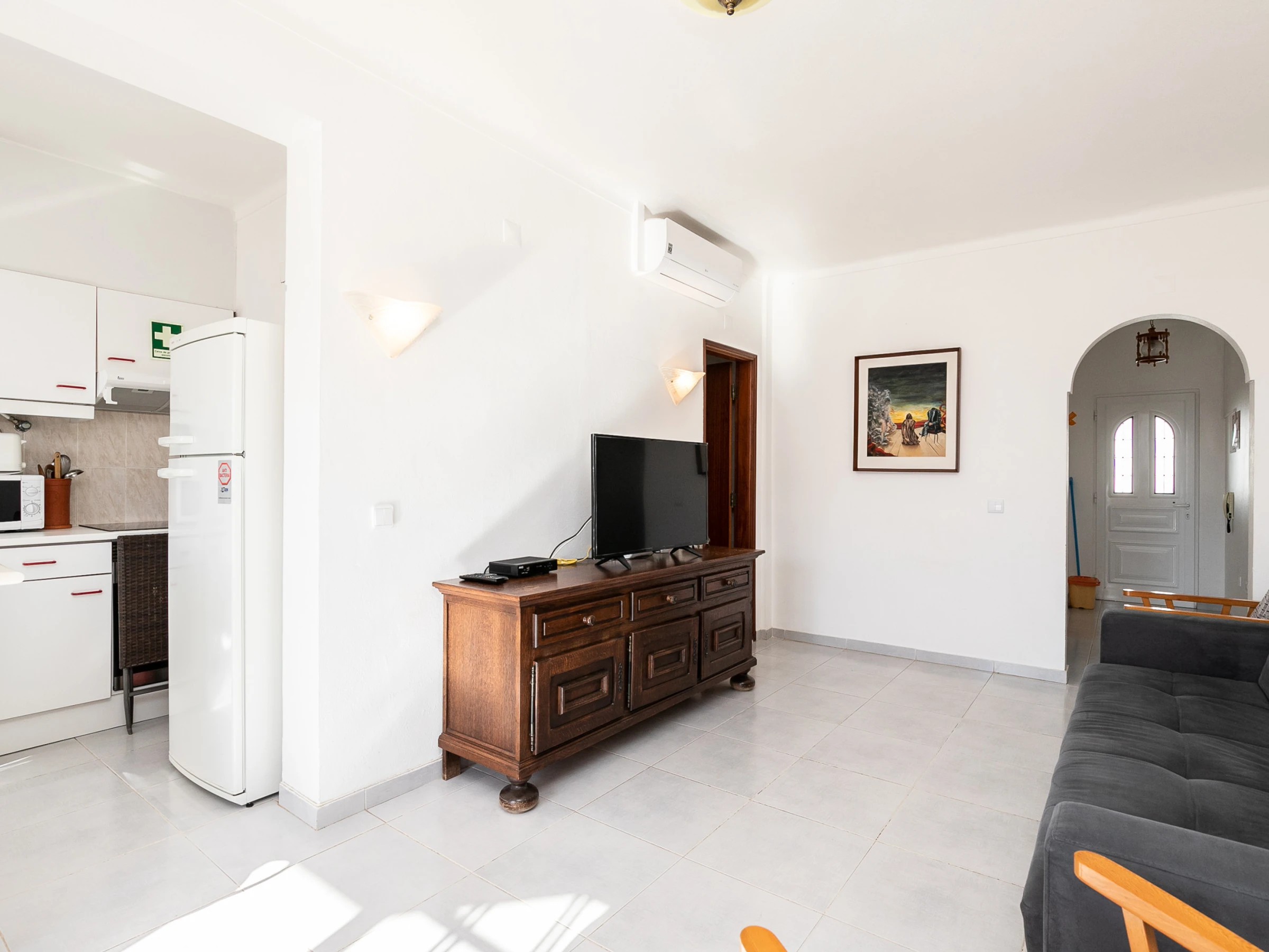 Die Wohnung verfügt über ein geräumiges Schlafzimmer mit einem komfortablen Doppelbett und einem zusätzlichen Schlafsofa, das problemlos bis zu 4 Personen unterbringen kann. Der Gemeinschaftsbereich ist gemütlich und hell, mit Klimaanlage im Wohnzimmer, um maximalen Komfort an heißen Tagen zu gewährleisten.