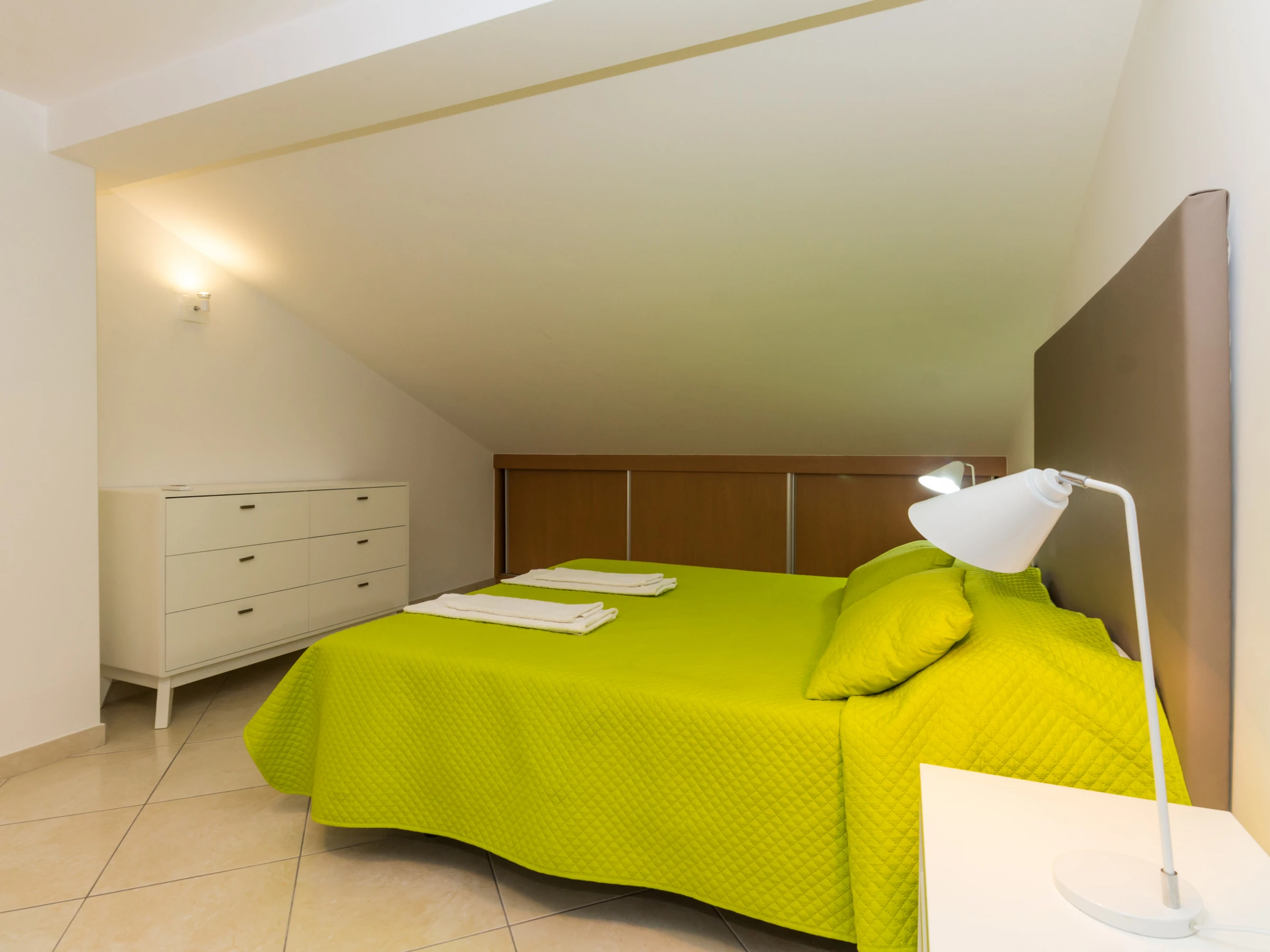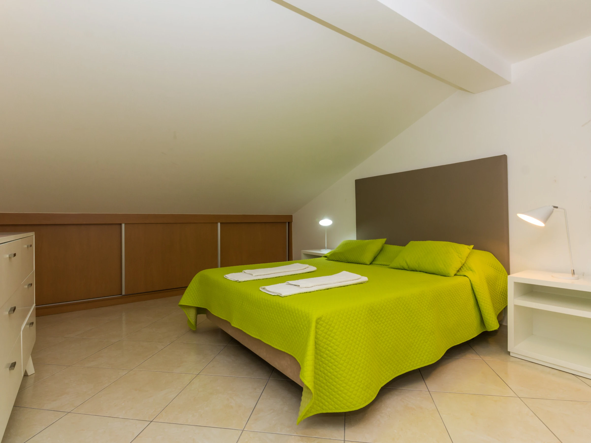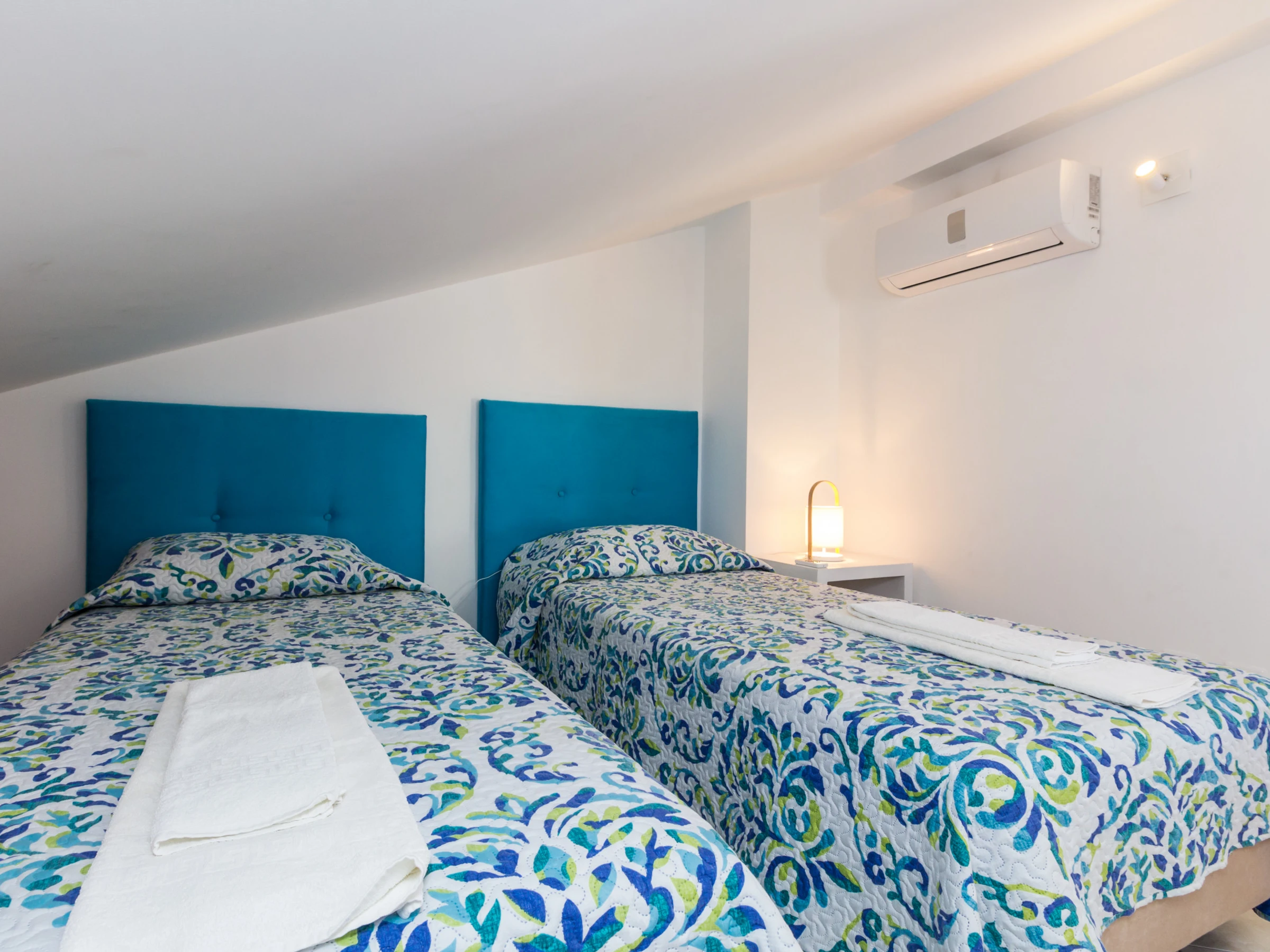 Die Wohnung mit 94 m² verteilt sich auf zwei Etagen. Im ersten Geschoss befindet sich ein Eingangsbereich, ein Schlafzimmer mit Doppelbett, ein Wohn- und Esszimmer in offenem Konzept mit voll ausgestatteter Küche und ein Badezimmer mit Badewanne. Die Küche hat Zugang zu einem nach Osten und Süden ausgerichteten Hof, der mit einem Barbecue, Tisch und Stühlen ausgestattet ist und ideal ist, um Mahlzeiten im Freien mit Familie oder Freunden zu genießen.
