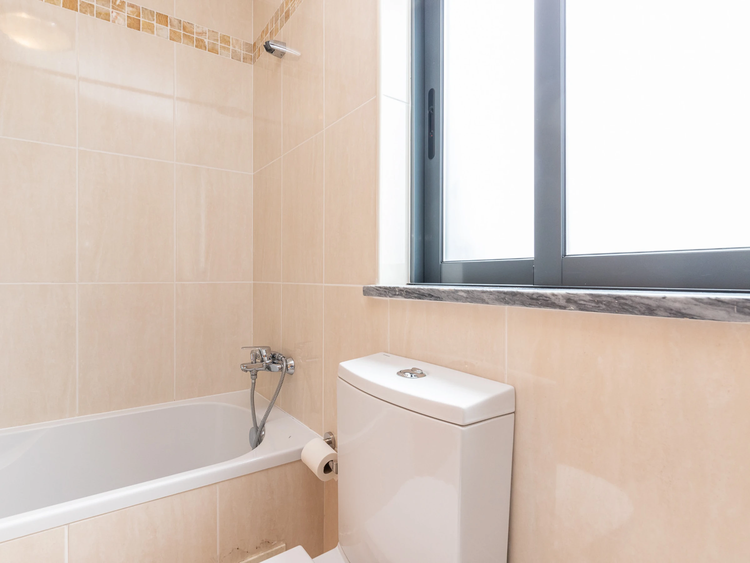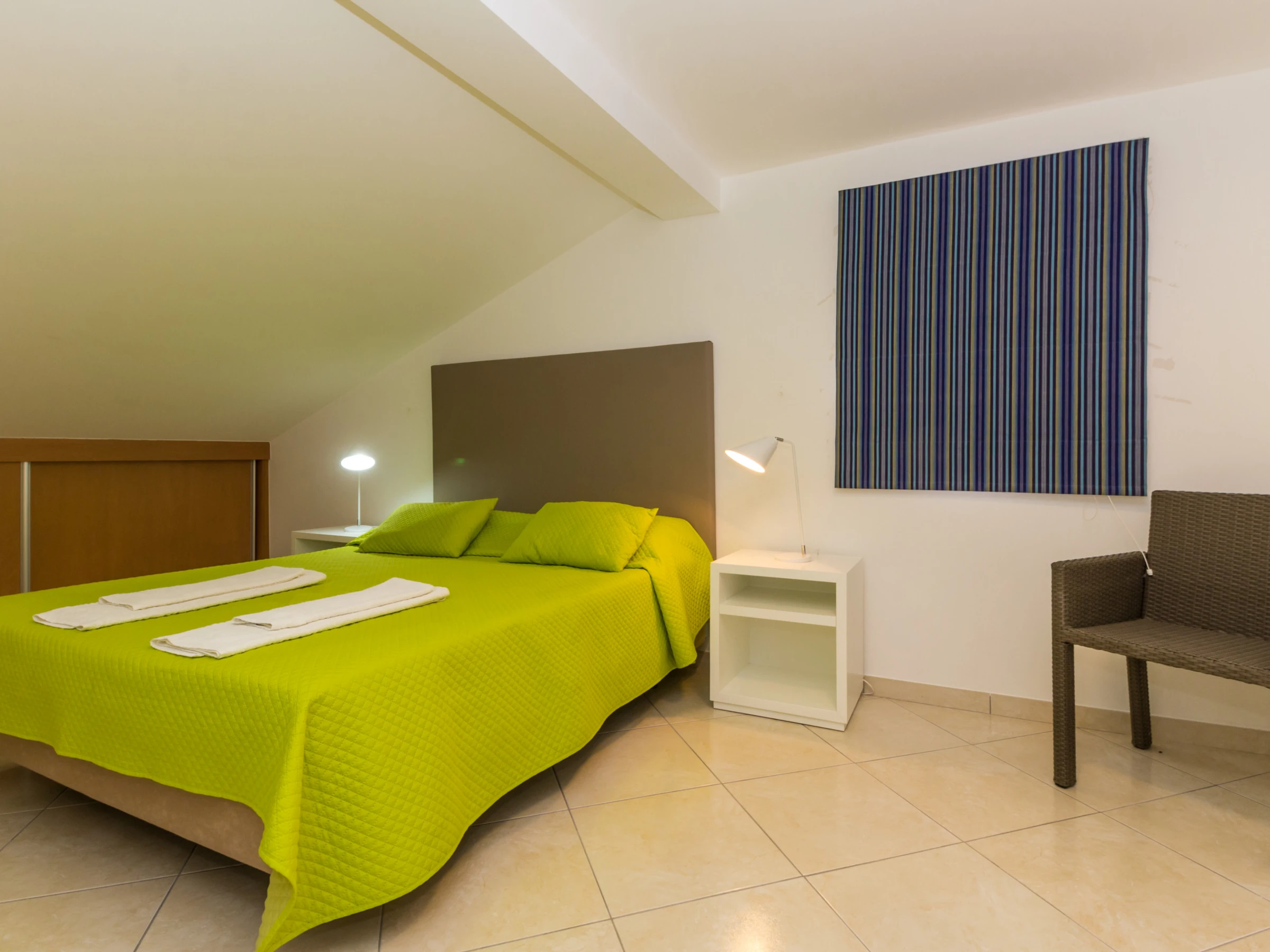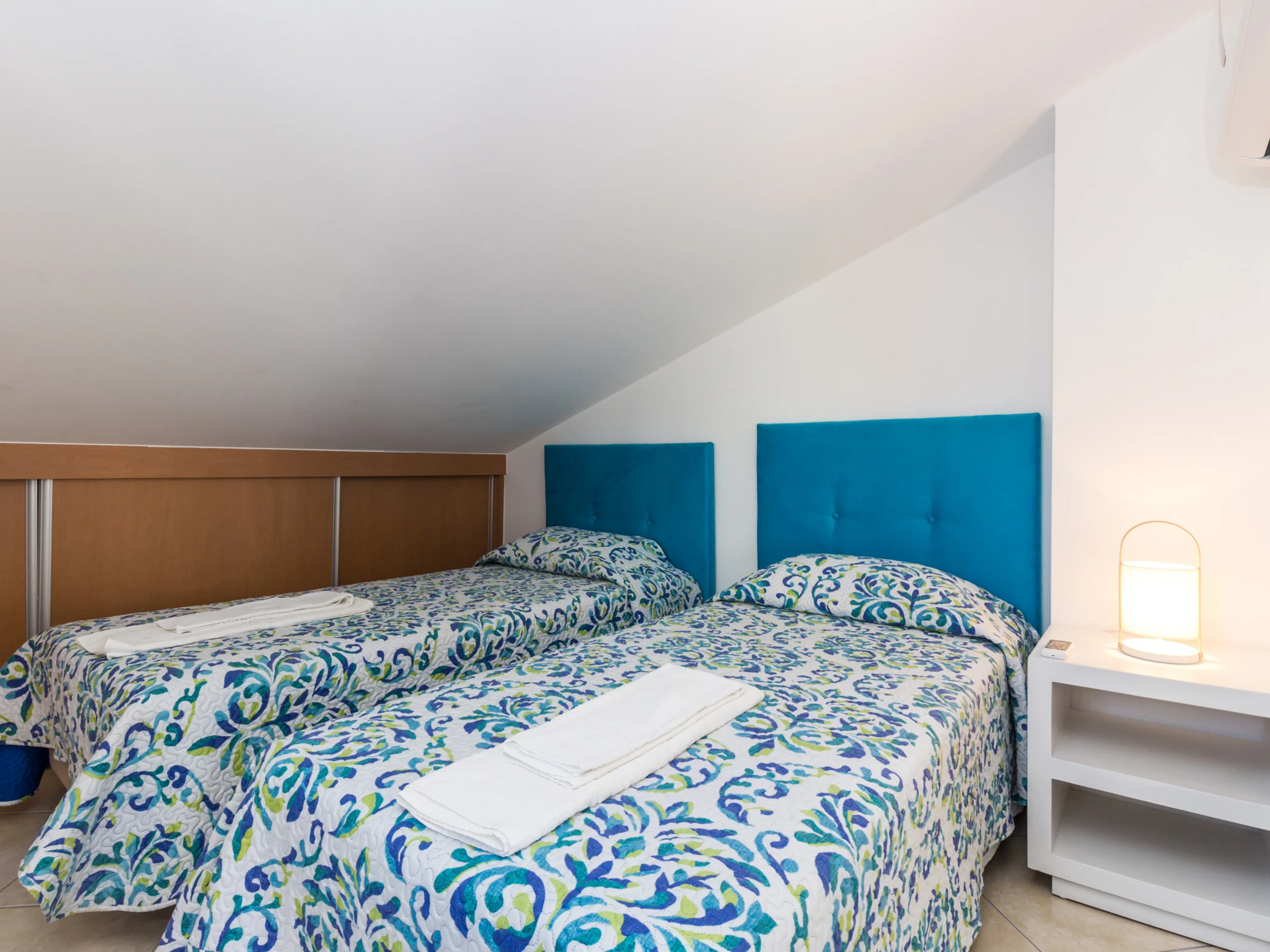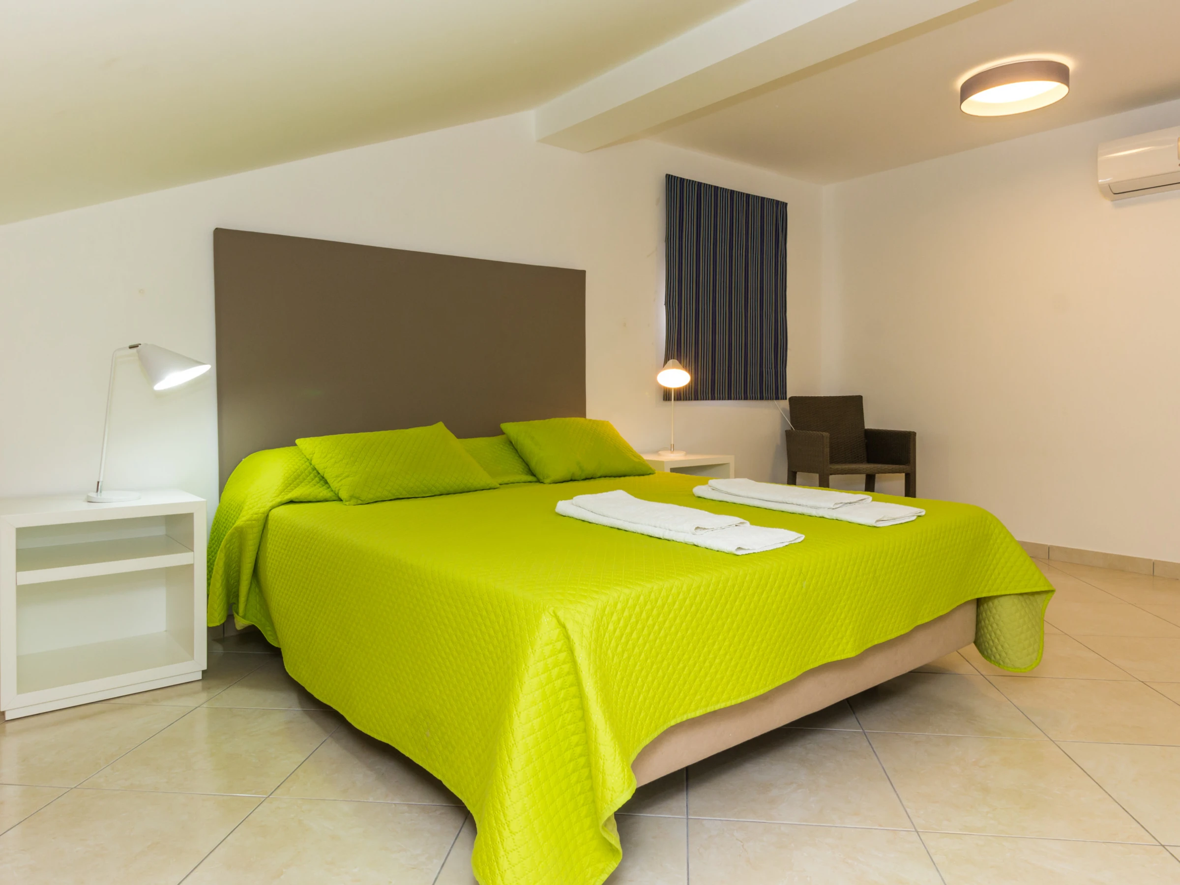 Die Wohnung mit 94 m² verteilt sich auf zwei Etagen. Im ersten Geschoss befindet sich ein Eingangsbereich, ein Schlafzimmer mit Doppelbett, ein Wohn- und Esszimmer in offenem Konzept mit voll ausgestatteter Küche und ein Badezimmer mit Badewanne. Die Küche hat Zugang zu einem nach Osten und Süden ausgerichteten Hof, der mit einem Barbecue, Tisch und Stühlen ausgestattet ist und ideal ist, um Mahlzeiten im Freien mit Familie oder Freunden zu genießen.