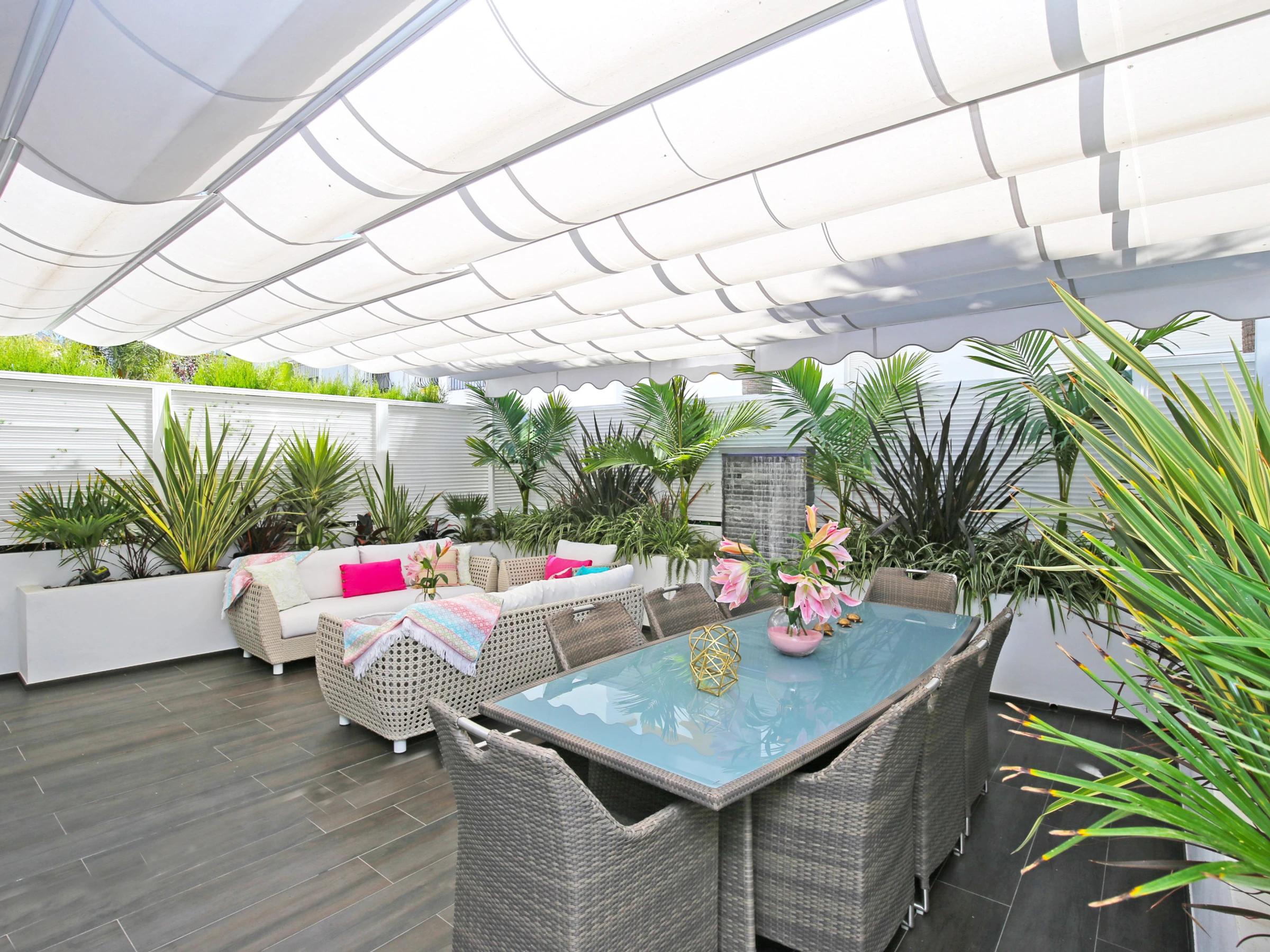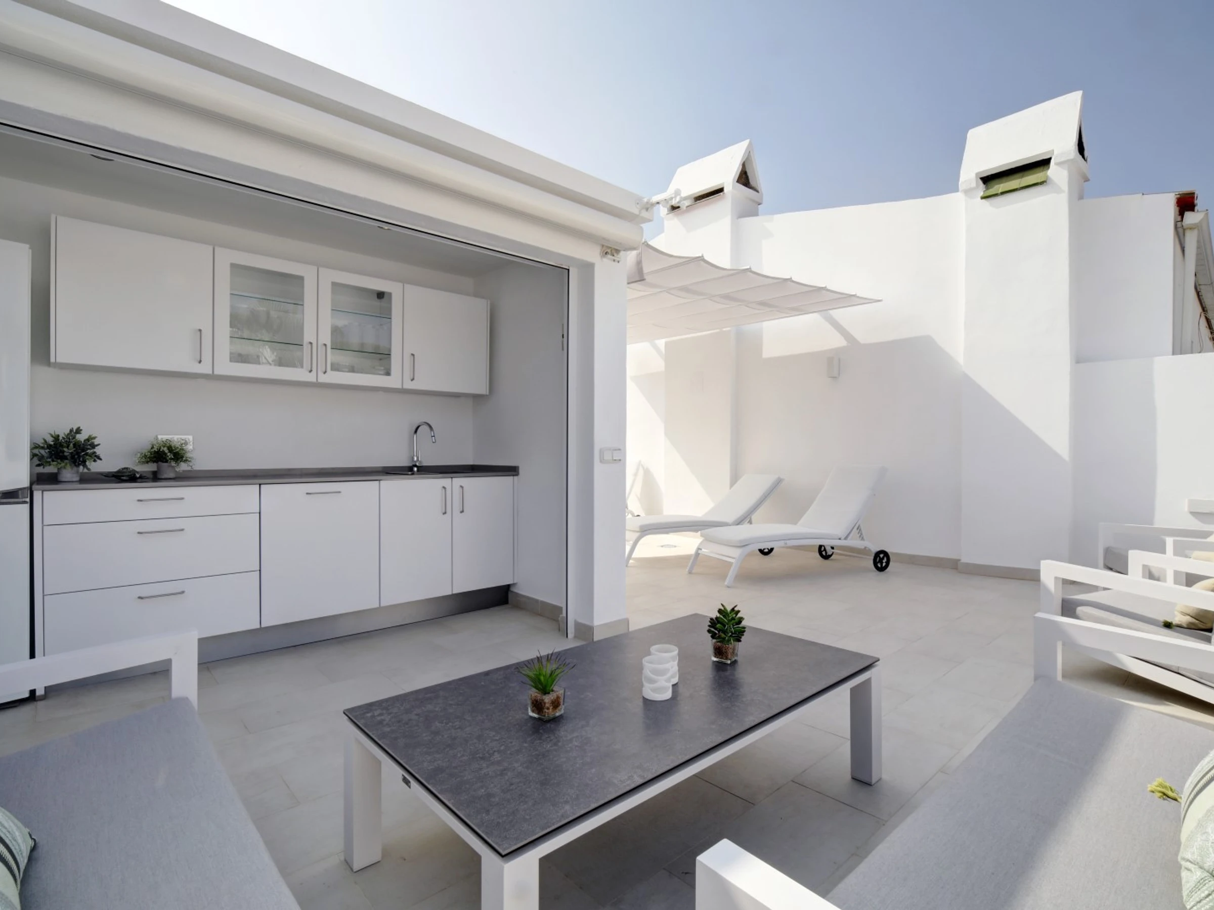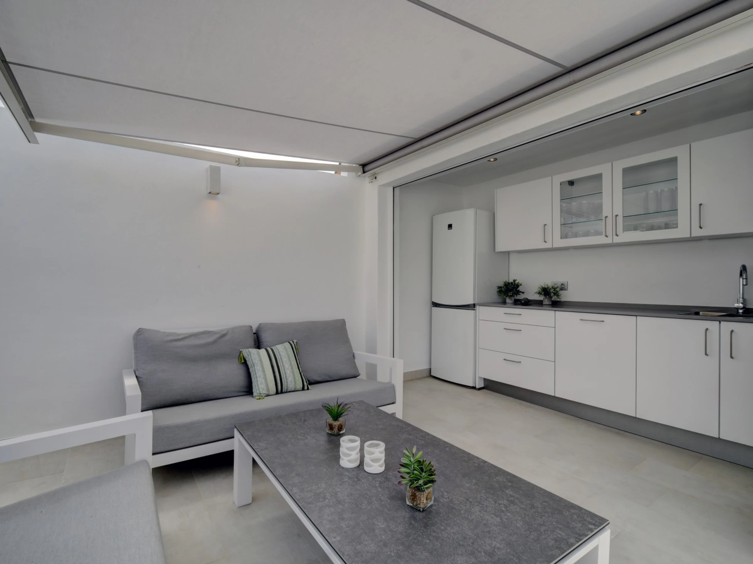 Die obere Ebene ist ein Highlight von Casa Luna — eine prächtige 70 m² große Dachterrasse, die einen Panoramablick auf Berge, Gärten und Meer bietet. Dieser beeindruckende Außenbereich umfasst eine gemütliche Lounge-Ecke, eine Nassbar, eine Sommerküche und einen hohen Cocktailtisch, was ihn ideal für Unterhaltung oder zum Genießen von Abend-Sundowners macht. Die Terrasse erhält den ganzen Tag Sonne, mit Sonnenliegen zum Sonnenbaden und elektrisch einziehbaren Sonnenschutz für diejenigen, die es lieber in Komfort genießen möchten. Gäste können sich auch in der neuen hochmodernen Jacuzzi entspannen und dabei die atemberaubenden Sonnenuntergänge über den Bergen bewundern (Jacuzzi-Nutzung ist gegen eine zusätzliche Gebühr von 25 € pro Tag, zahlbar bei der Anreise, verfügbar).