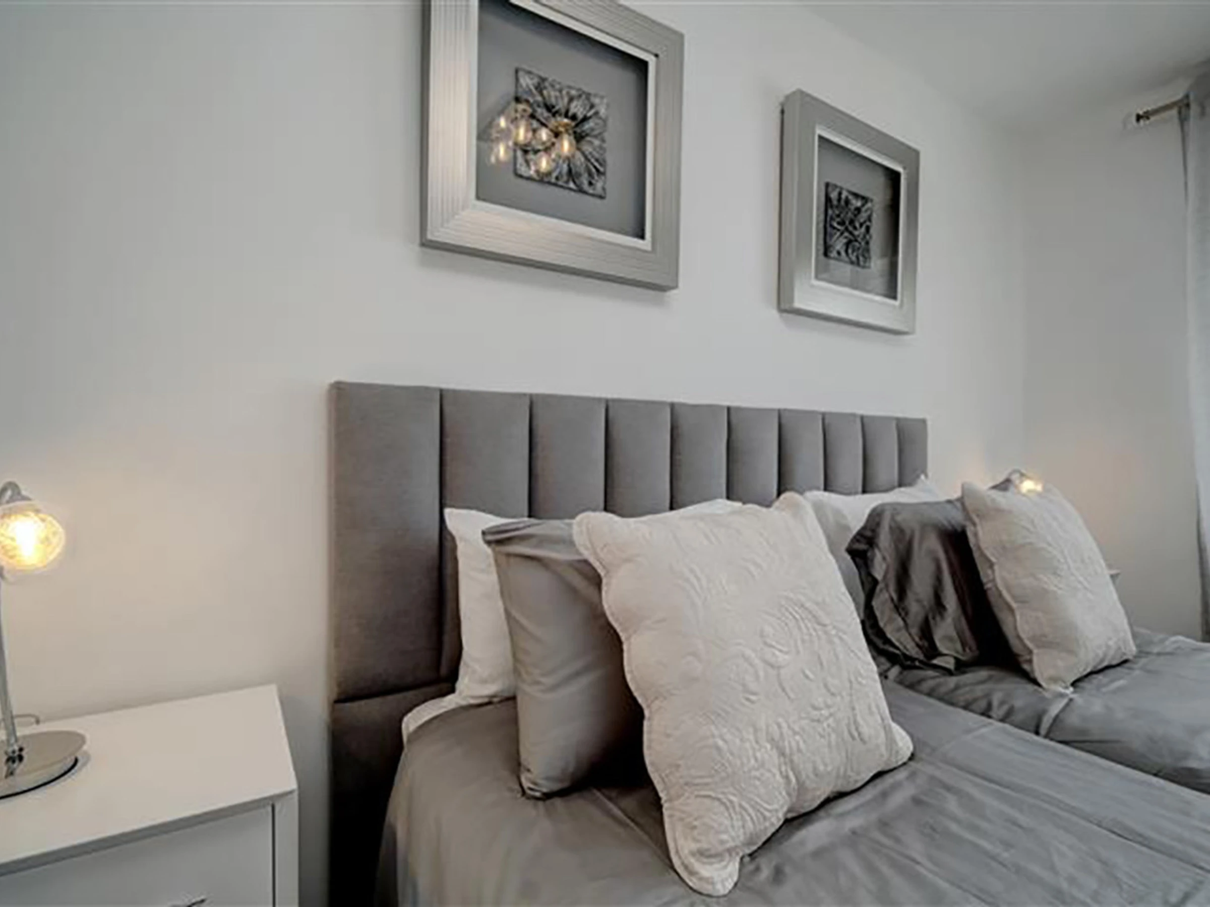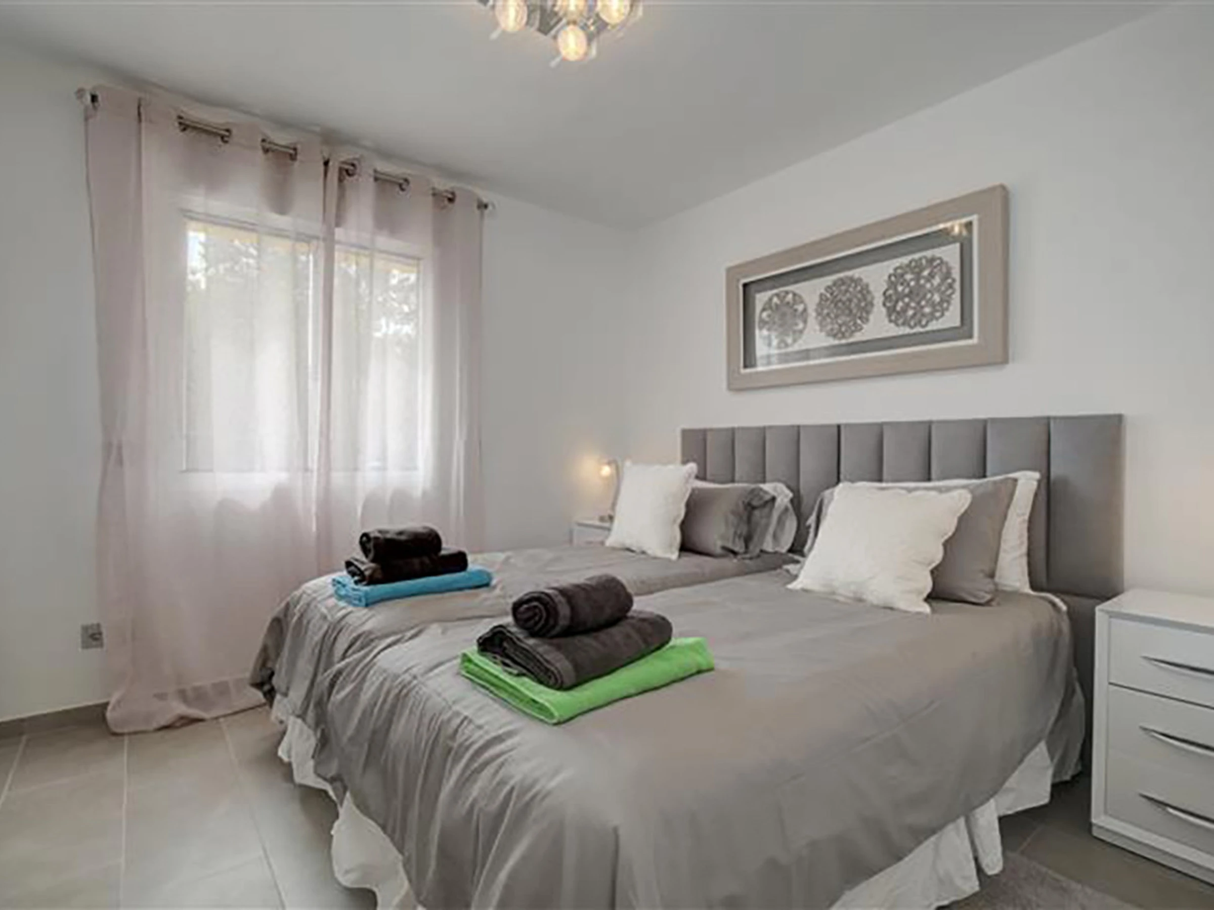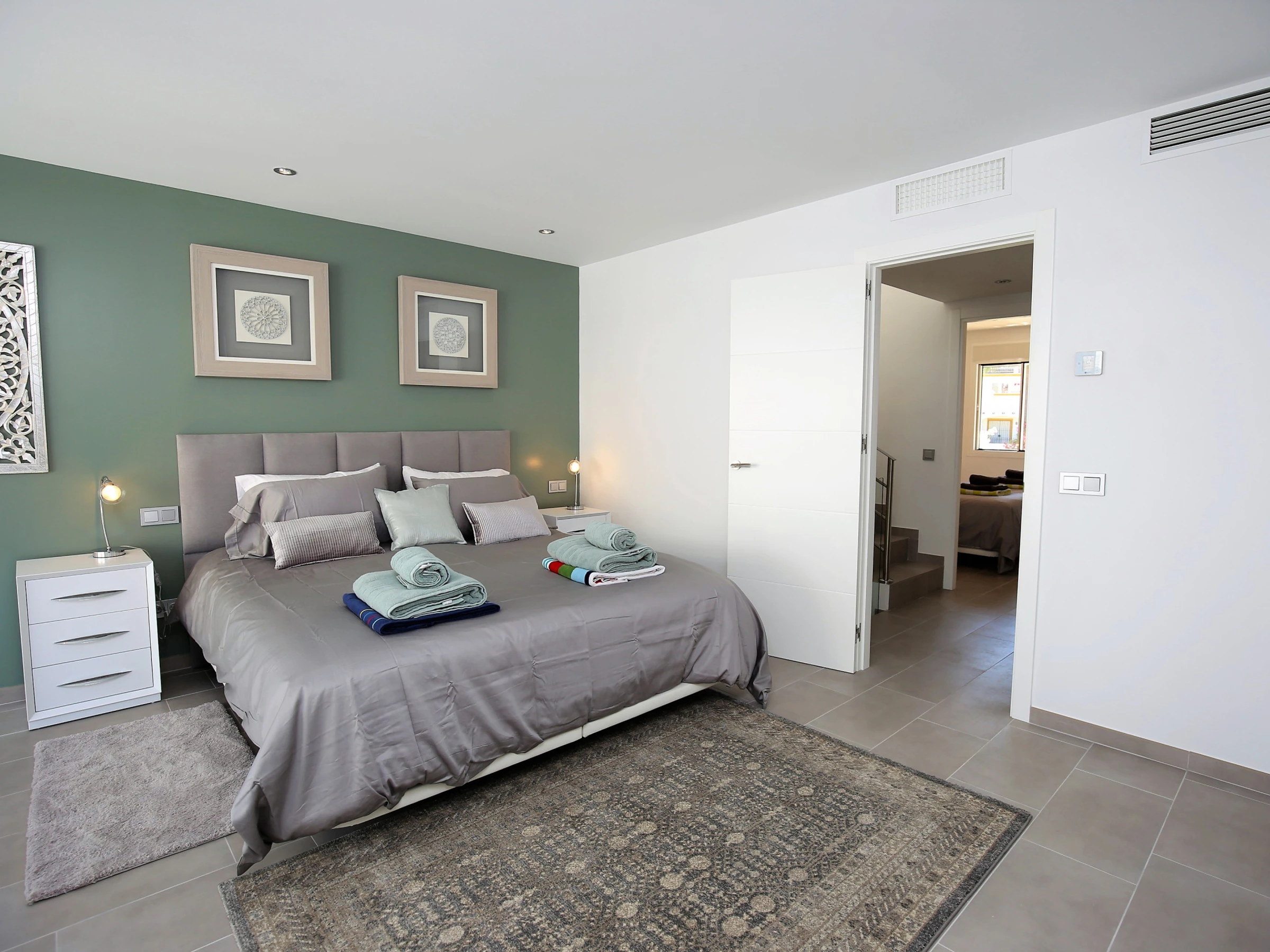 Die erste Etage verfügt über eine luxuriöse Mastersuite mit begehbarem Kleiderschrank und einem exquisit ausgestatteten En-Suite-Duschraum, der mit Travertinmarmor ausgestattet ist. Zwei weitere geräumige Schlafzimmer, jeweils mit Zwillingsbetten, die zu Doppelbetten umgebaut werden können, teilen sich ein wunderschön gestaltetes Familien-Duschbad. Alle Badezimmer profitieren von Fußbodenheizung, und die gesamte Immobilie ist mit einem neuen Split-Klimaanlage- und Heizungssystem für ganzjährigen Komfort ausgestattet.
