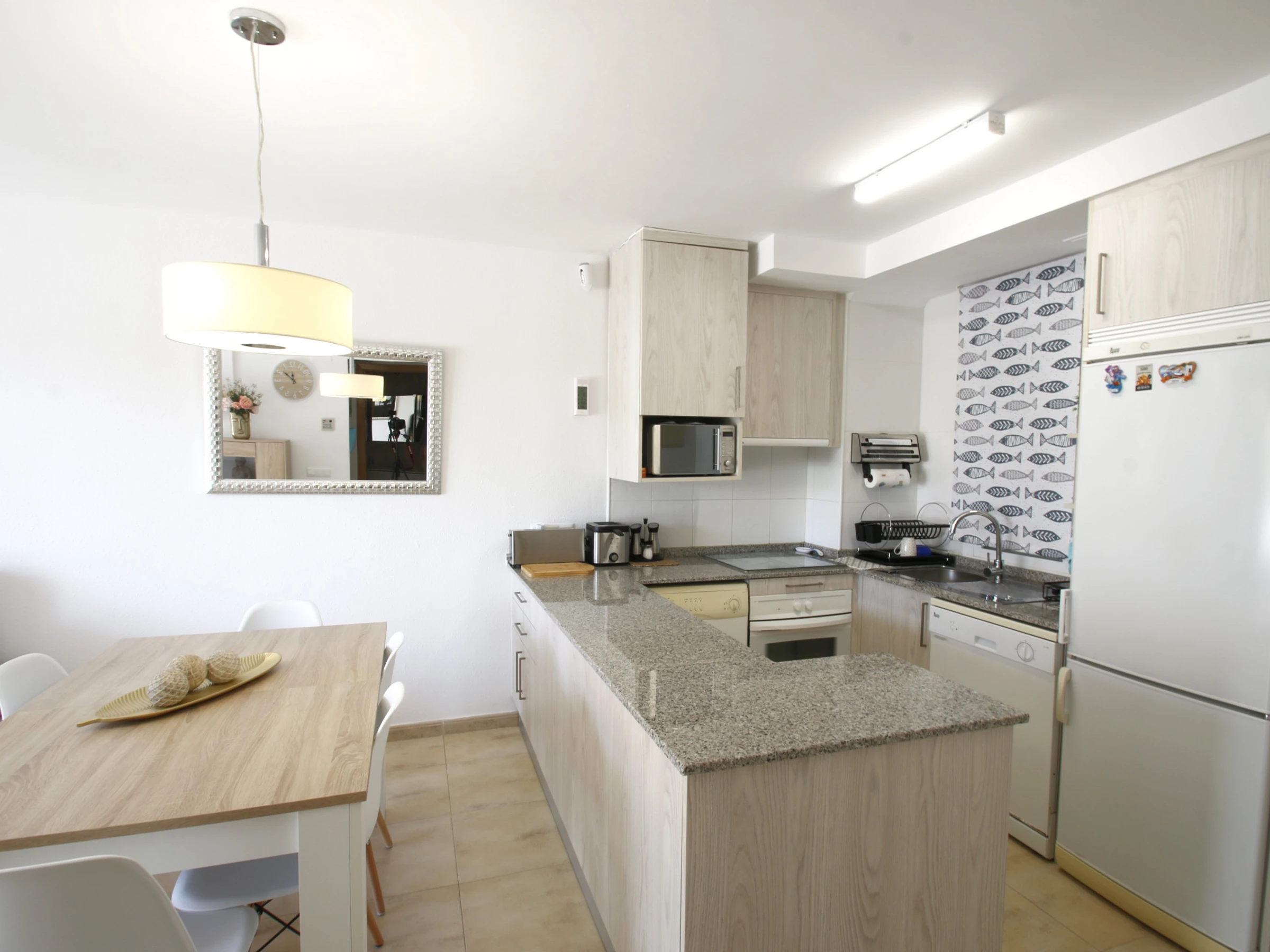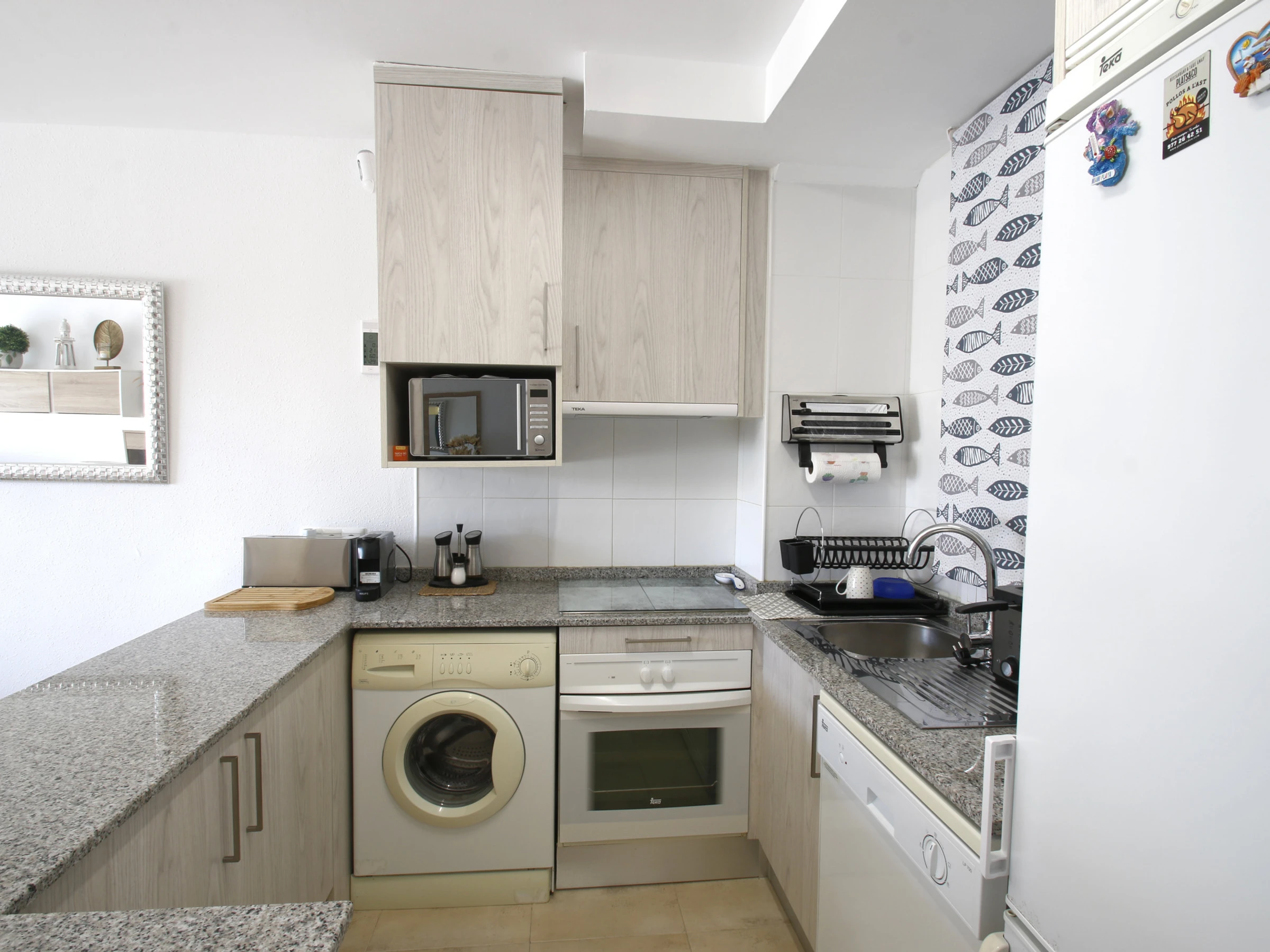 Die offene Küche mit Cerankochfeld ist komplett ausgestattet mit Kühlschrank, Mikrowelle, Backofen, Gefrierschrank, Waschmaschine, Geschirrspüler, Geschirr, Besteck, Kochutensilien, Kaffeemaschine und Toaster und bietet alles, was Sie brauchen, um sich wie zu Hause zu fühlen.