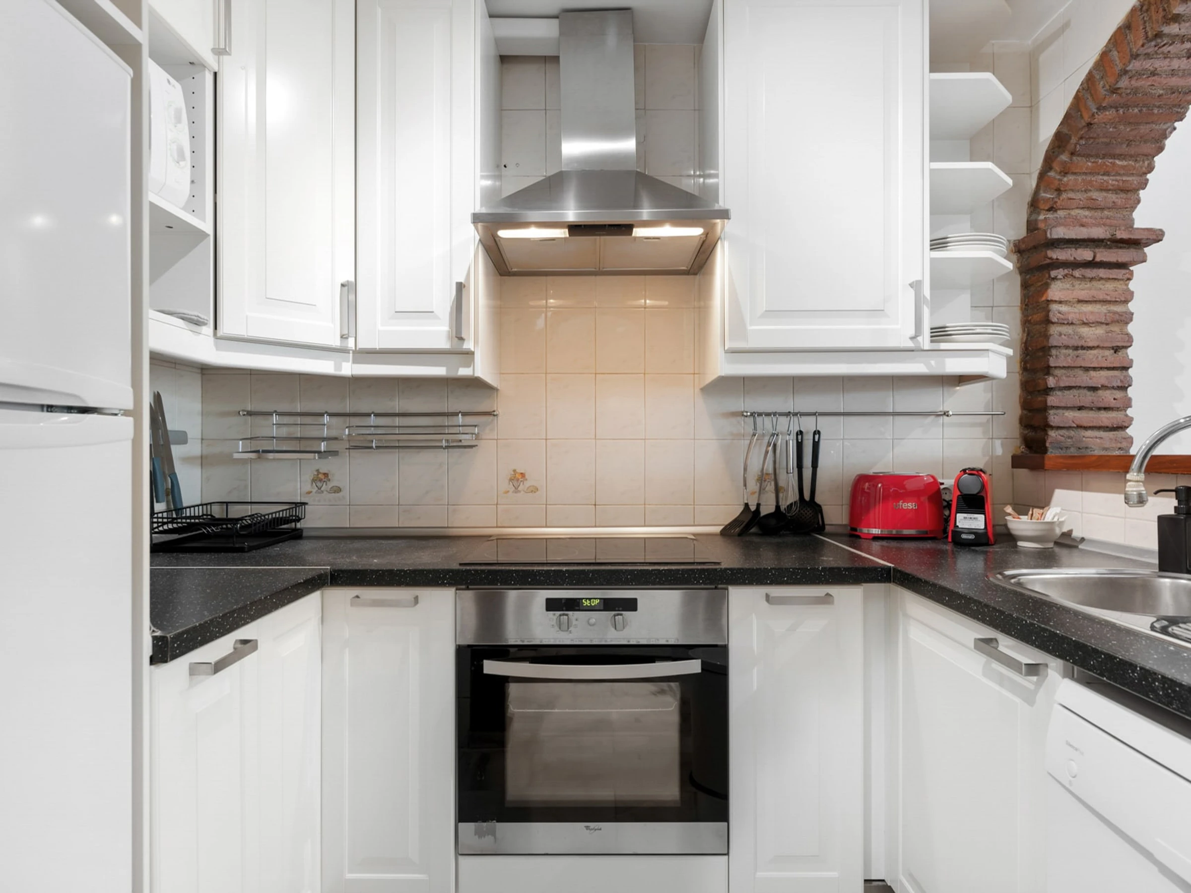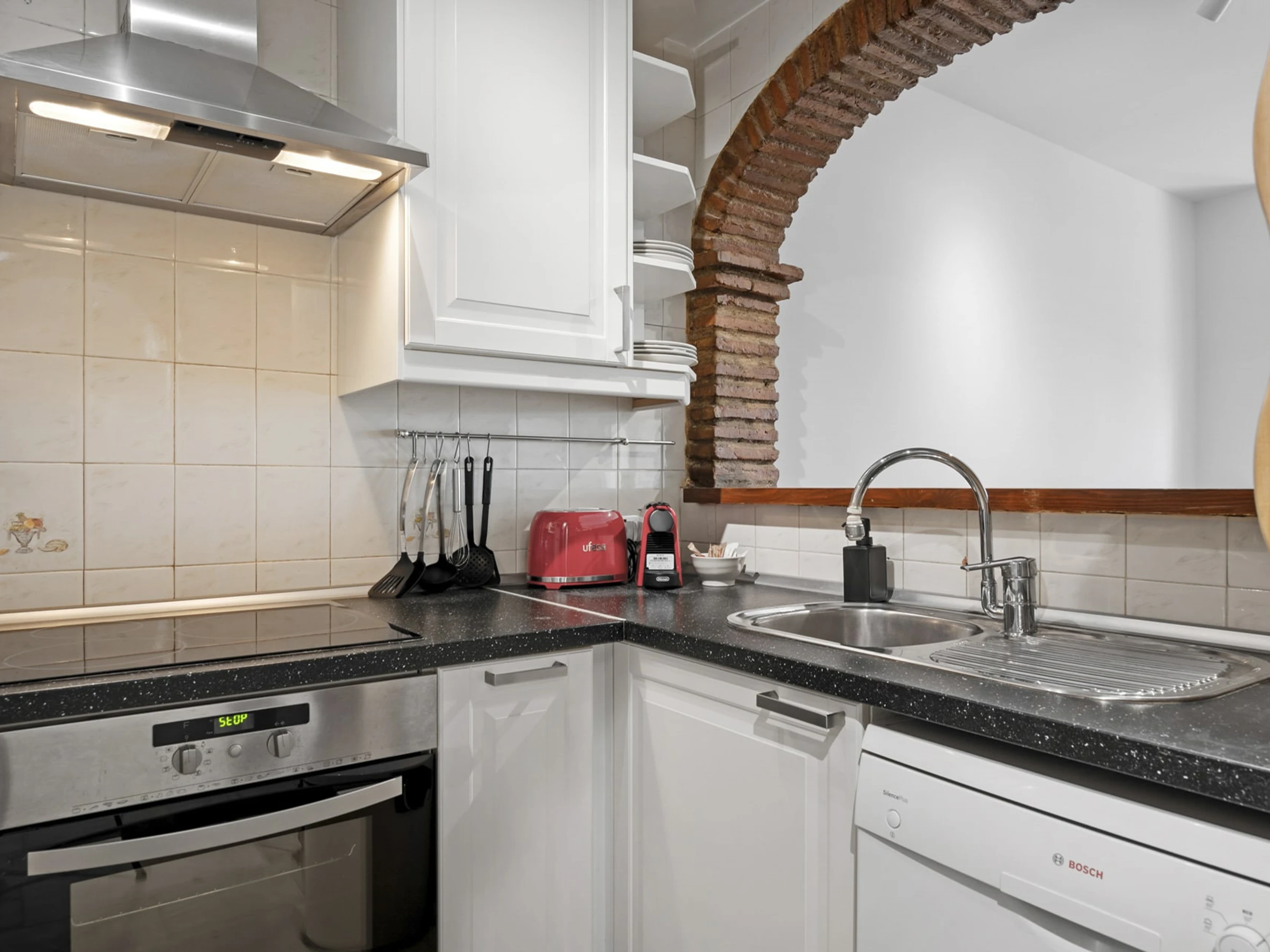 Dieses offene küche, elektrisches kochfeld, ist ausgestattet in kühlschrank, mikrowelle, backofen, gefrierschrank, spülmaschine, geschirr/besteck, kochutensilien, kaffeemaschine, toaster, wasserkocher, küchengeschirr, teller und schüsseln.