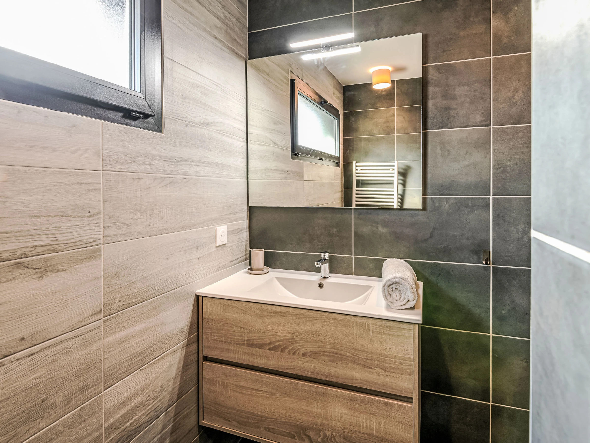 3-Zimmer-Haus 67 m2. Modern eingerichtet: Wohn-/Esszimmer mit 1 Diwanbett (130 cm, Länge 190 cm), TV und Internationale TV-Sender (Flachbildschirm), Klimaanlage und elektrischem Rollladen. Ausgang zur Terrasse. 1 Zimmer mit 1 franz. Bett (160 cm, Länge 200 cm). 1 Zimmer mit 1 franz. Bett (160 cm, Länge 200 cm). Offene Küche (Backofen, Geschirrspüler, 3 Induktionskochplatten, Mikrowelle, elektrische Kaffeemaschine, Kapseln für die Kaffeemaschine (filtre) extra). Dusche, sep. WC. E-Heizung. Holzdielenboden. Terrassenmöbel, Gartengrill. Zur Verfügung: Waschmaschine, Bügeleisen. Internet (Wireless LAN, gratis). Parkplatz (1 Auto). Bitte beachten: Nichtraucher-Haus. Rauchmelder.