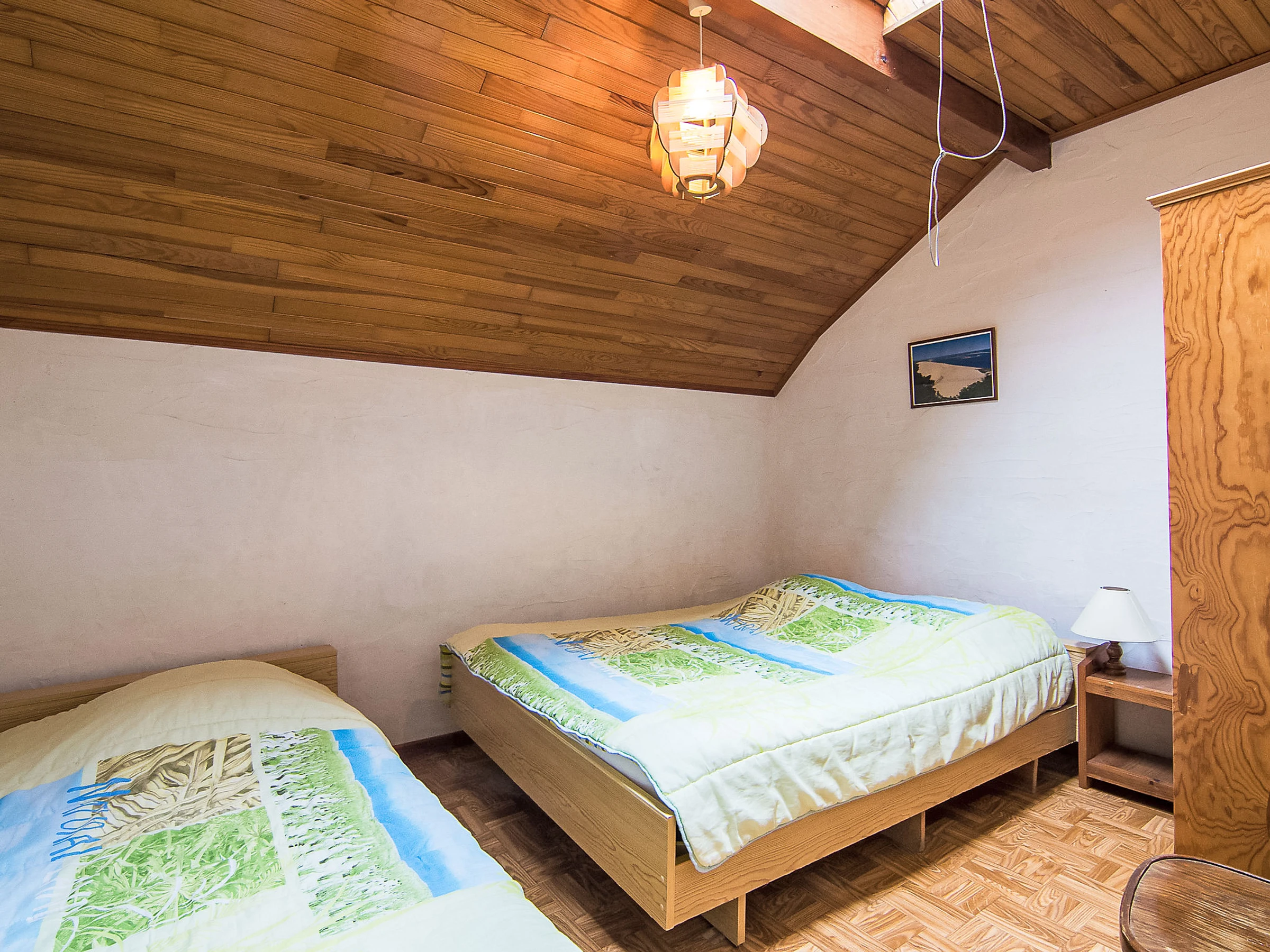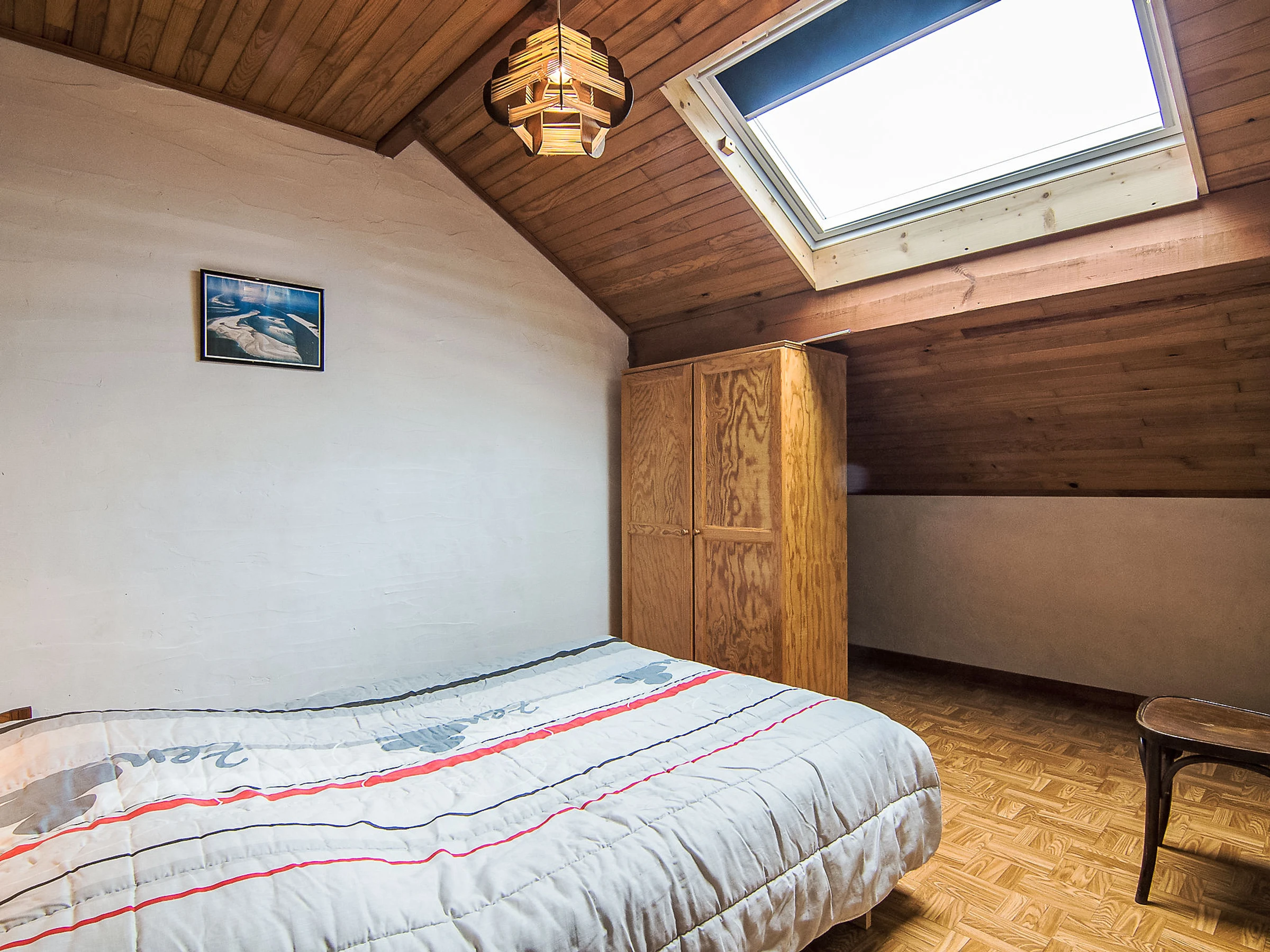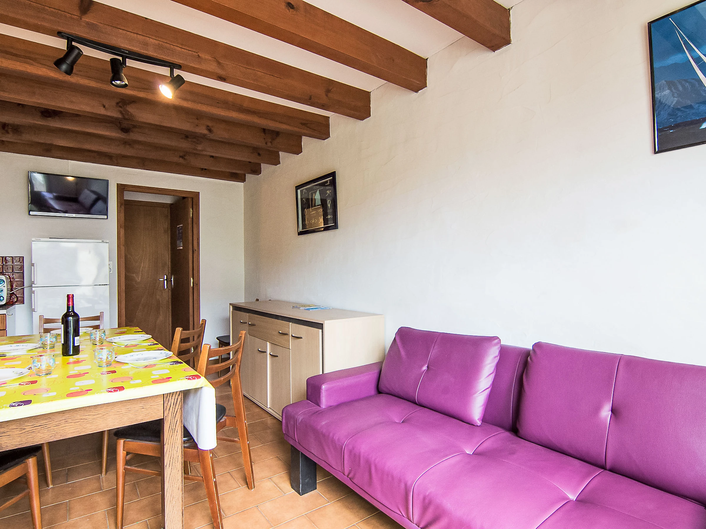 3-Zimmer-Reihenhaus 50 m2 auf 2 Stockwerken. Einfach eingerichtet: Wohn-/Esszimmer mit TV und Internationale TV-Sender (Flachbildschirm). Ausgang zur Terrasse. Offene Küche (1 Kochplatte, Mini-Backofen, 4 Flammen, Toaster, Wasserkocher, Mikrowelle, elektrische Kaffeemaschine, Kapseln für die Kaffeemaschine (filtre) extra). Dusche, sep. WC. Heizung nicht in allen Räumen. Obergeschoss: 1 abgeschrägtes Zimmer mit 1 franz. Bett (1 x 140 cm, Länge 190 cm). 1 abgeschrägtes Zimmer mit 1 Bett (90 cm, Länge 190 cm), 1 franz. Bett (1 x 140 cm, Länge 190 cm). Terrasse. Terrassenmöbel, Liegestühle (1). Zur Verfügung: Internet (WLAN, gratis). Bitte beachten: Maximal 1 Haustier/Hund erlaubt. Rauchmelder.