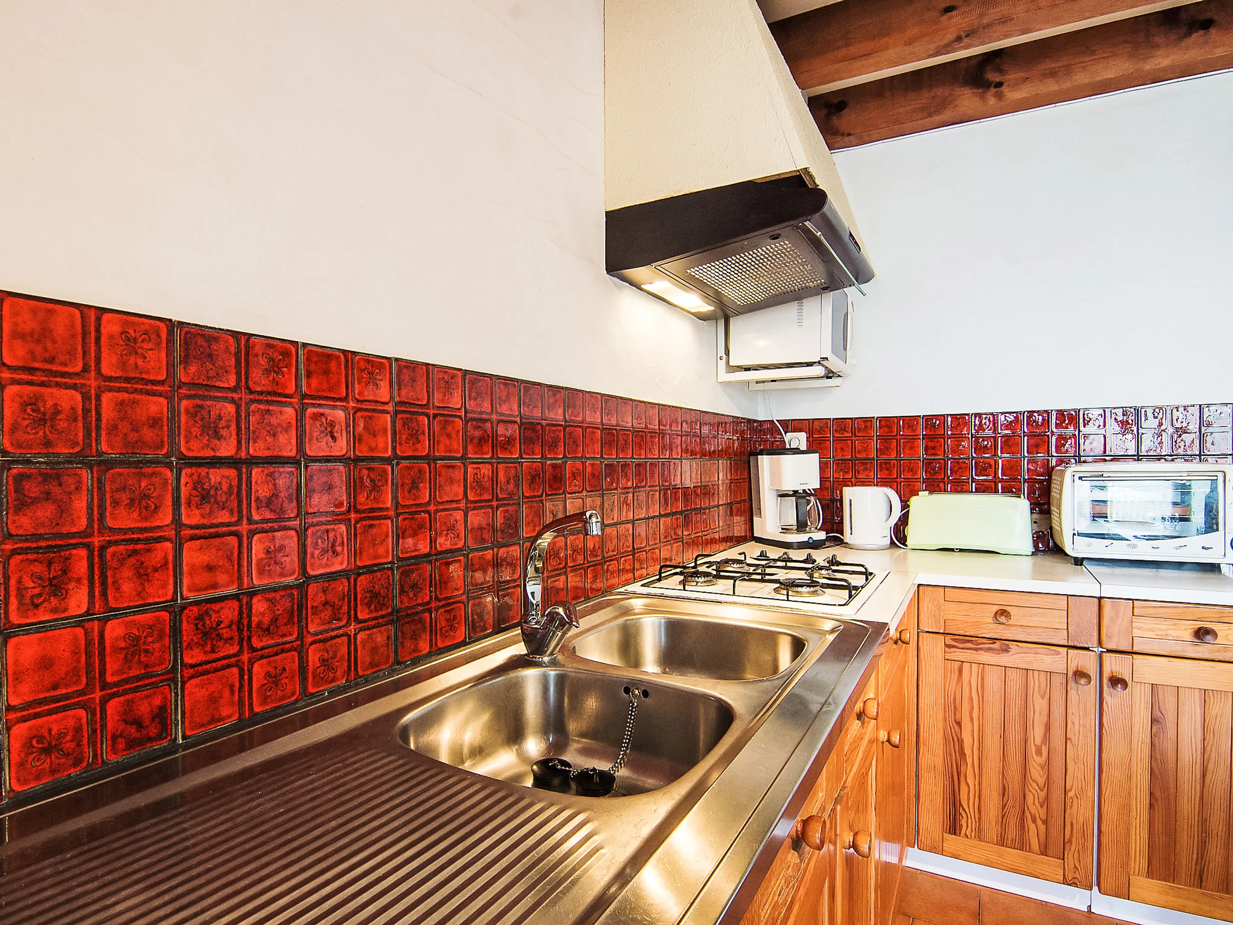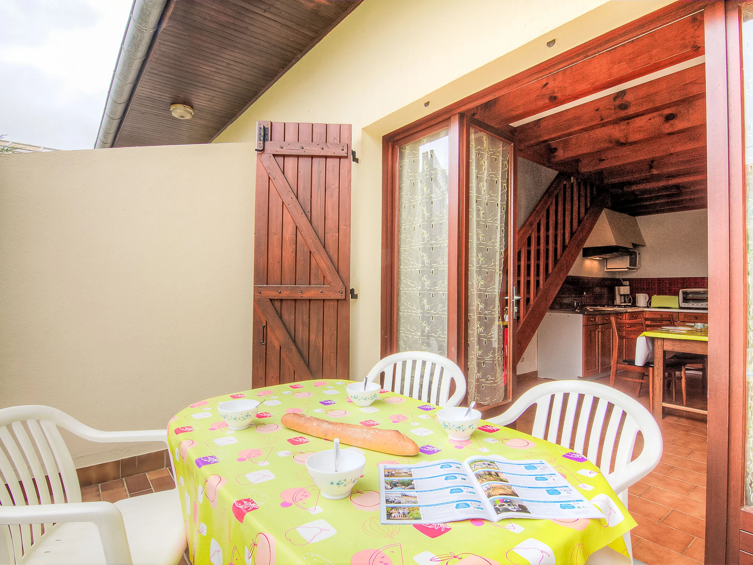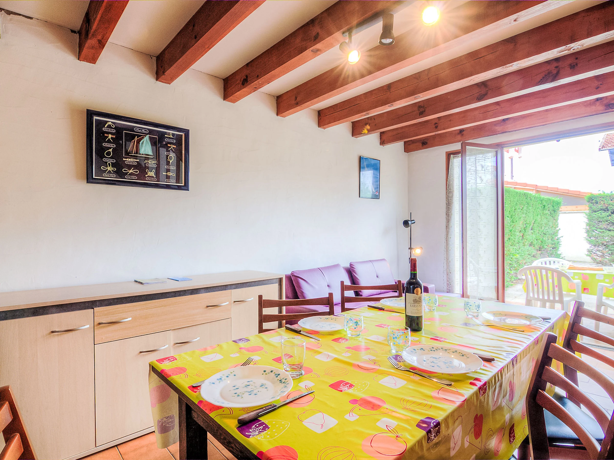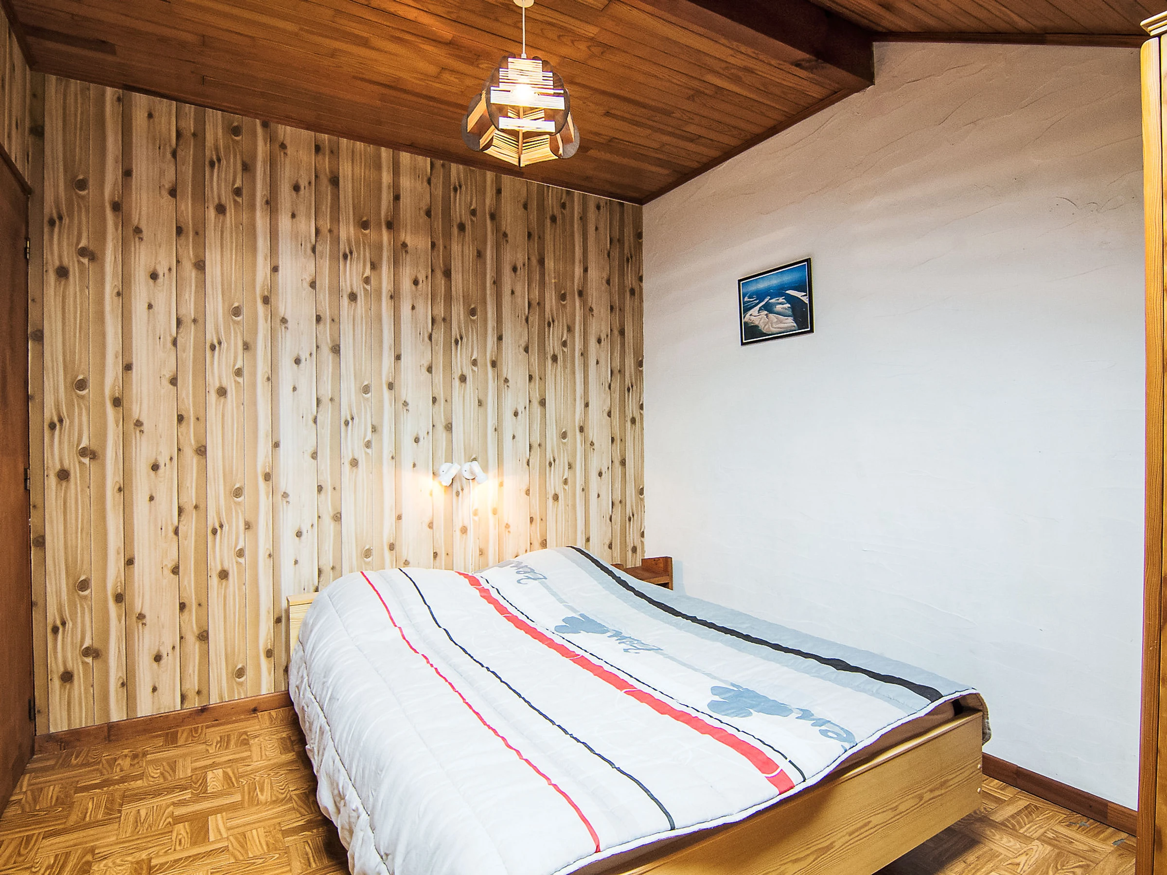 3-Zimmer-Reihenhaus 50 m2 auf 2 Stockwerken. Einfach eingerichtet: Wohn-/Esszimmer mit TV und Internationale TV-Sender (Flachbildschirm). Ausgang zur Terrasse. Offene Küche (1 Kochplatte, Mini-Backofen, 4 Flammen, Toaster, Wasserkocher, Mikrowelle, elektrische Kaffeemaschine, Kapseln für die Kaffeemaschine (filtre) extra). Dusche, sep. WC. Heizung nicht in allen Räumen. Obergeschoss: 1 abgeschrägtes Zimmer mit 1 franz. Bett (1 x 140 cm, Länge 190 cm). 1 abgeschrägtes Zimmer mit 1 Bett (90 cm, Länge 190 cm), 1 franz. Bett (1 x 140 cm, Länge 190 cm). Terrasse. Terrassenmöbel, Liegestühle (1). Zur Verfügung: Internet (WLAN, gratis). Bitte beachten: Maximal 1 Haustier/Hund erlaubt. Rauchmelder.