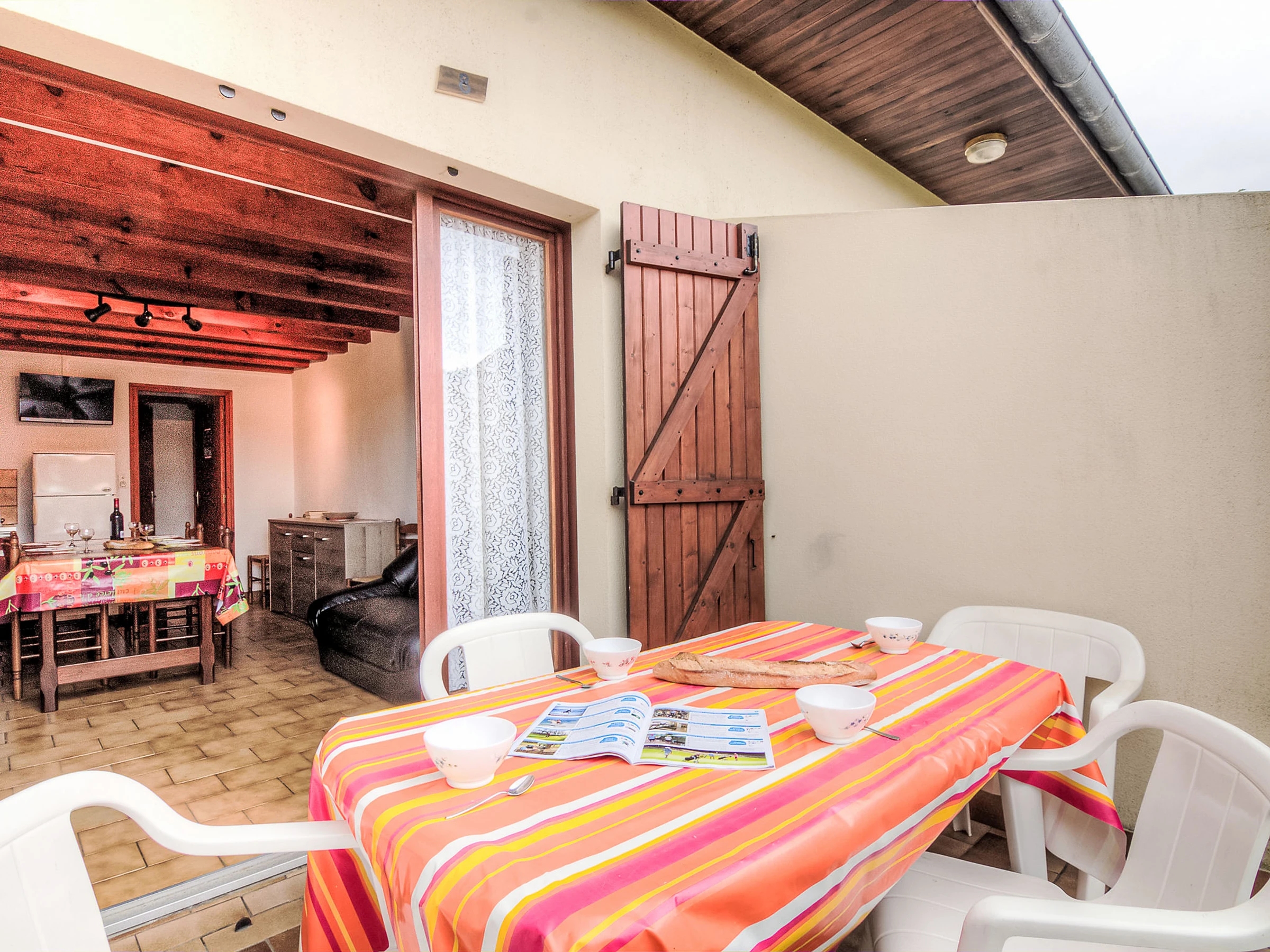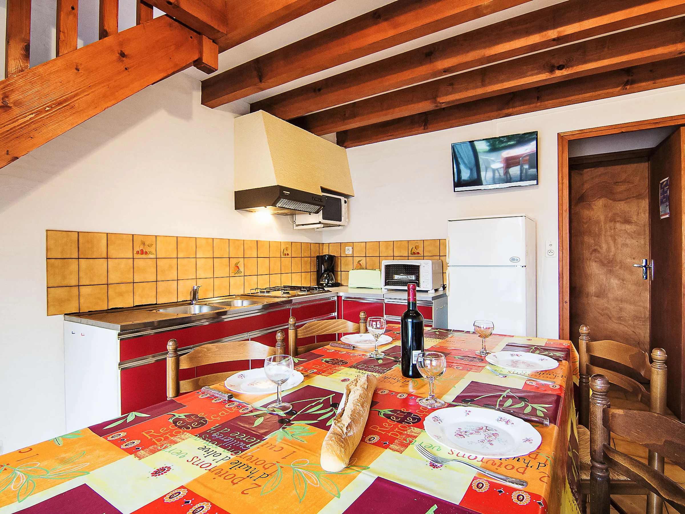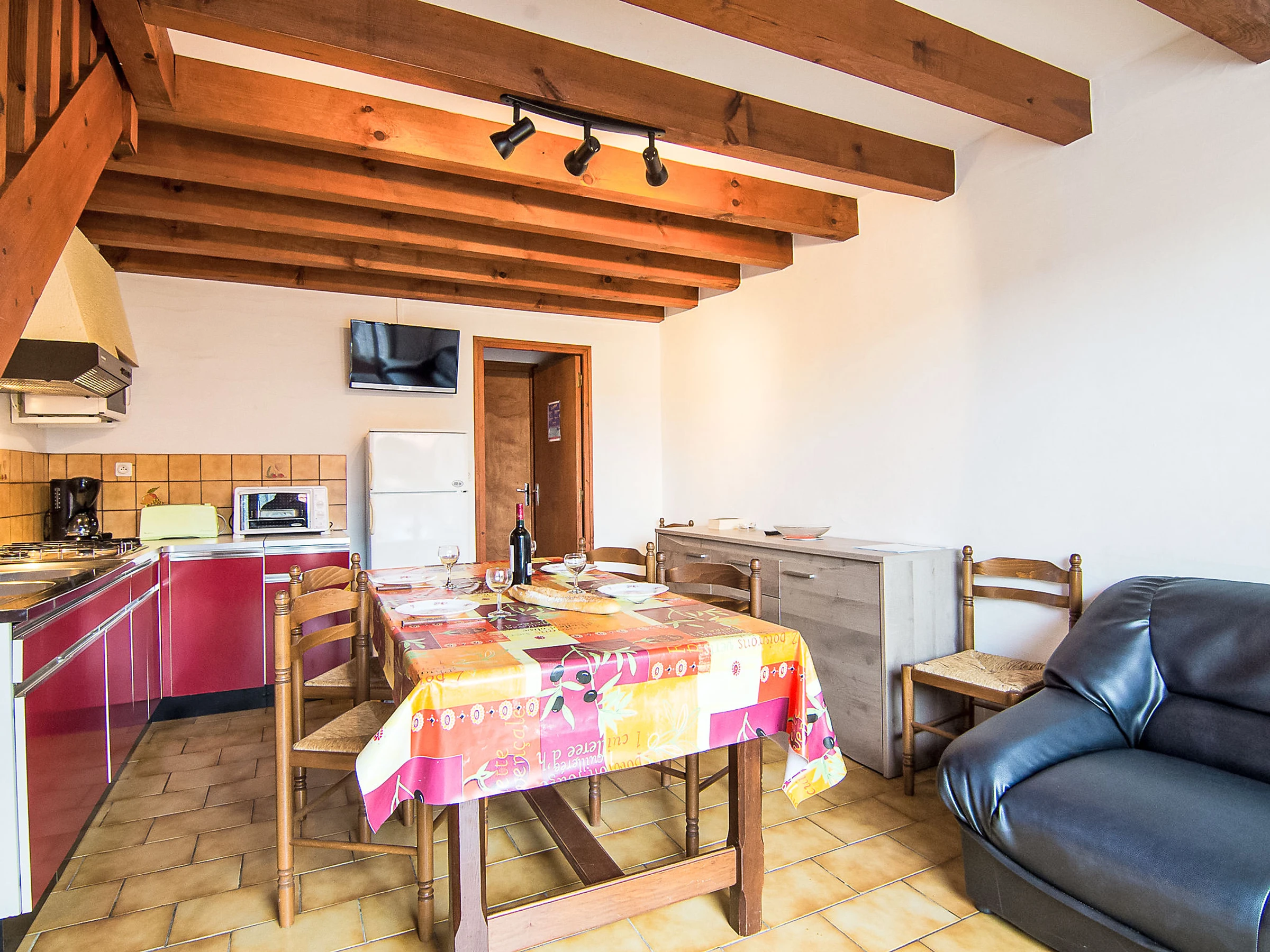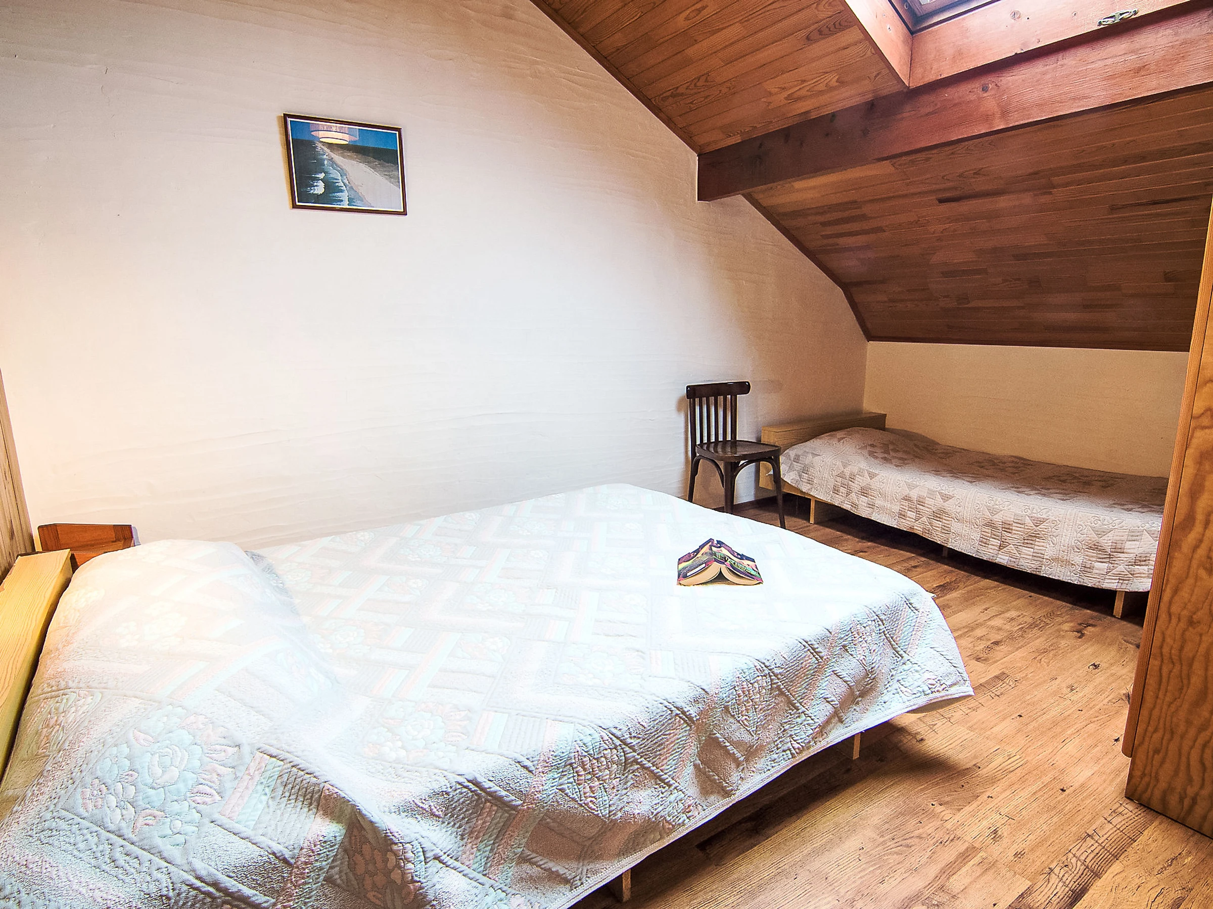 3-Zimmer-Reihenhaus 50 m2 auf 2 Stockwerken. Einfach eingerichtet: Wohn-/Esszimmer mit TV und Internationale TV-Sender (Flachbildschirm). Ausgang zur Terrasse. Kochnische (1 Kochplatte, Mini-Backofen, Backofen, 4 Flammen, Toaster, Wasserkocher, Mikrowelle, elektrische Kaffeemaschine, Kapseln für die Kaffeemaschine (filtre) extra). Dusche, sep. WC. Heizung nicht in allen Räumen. Obergeschoss: 1 abgeschrägtes Zimmer mit 2 Betten (90 cm, Länge 190 cm). 1 abgeschrägtes Zimmer mit 1 Bett (90 cm, Länge 190 cm), 1 franz. Bett (1 x 140 cm, Länge 190 cm). Terrasse. Terrassenmöbel, Liegestühle (1). Zur Verfügung: Internet (WLAN, gratis). Bitte beachten: Maximal 1 Haustier/Hund erlaubt. Rauchmelder.