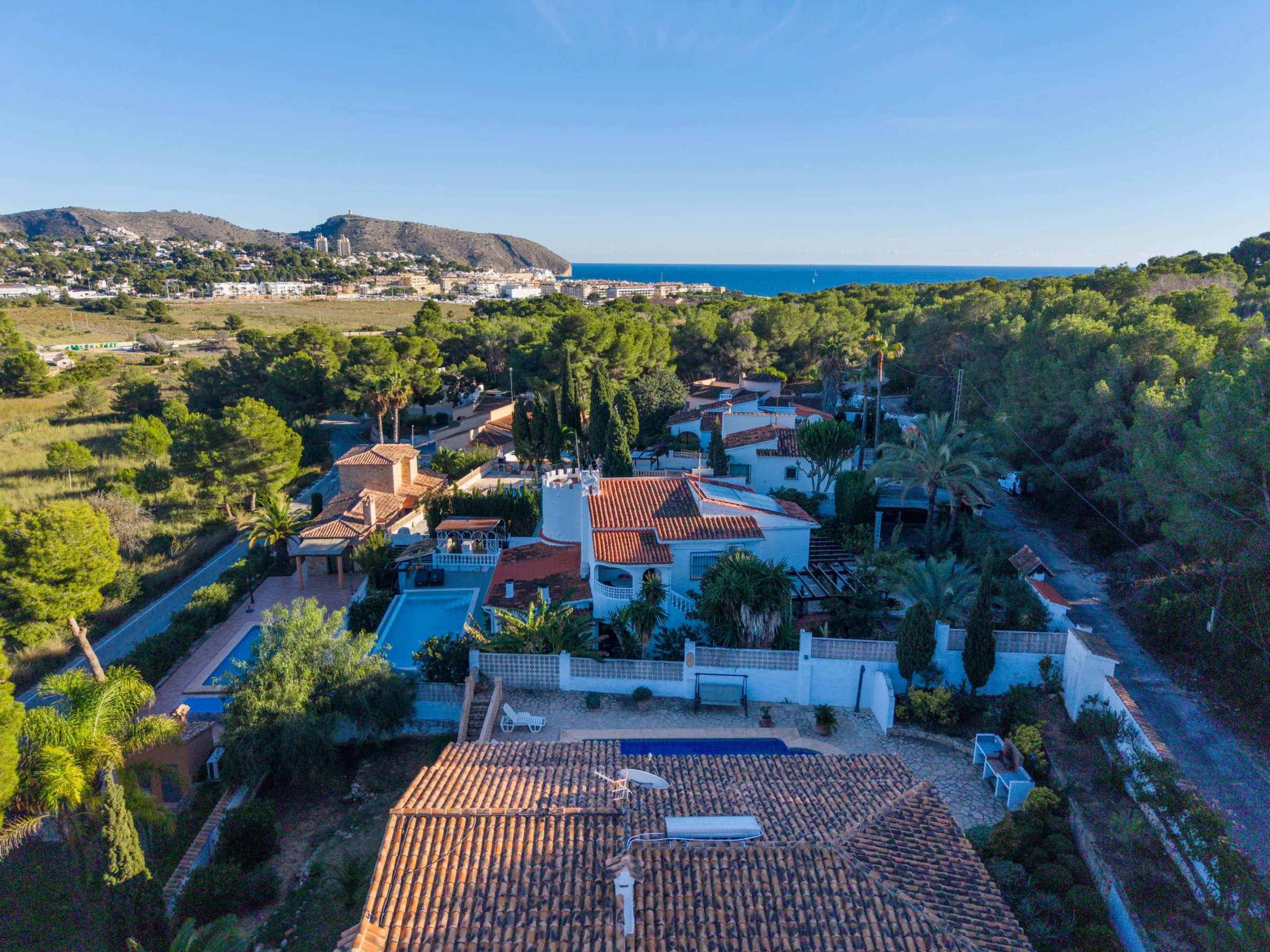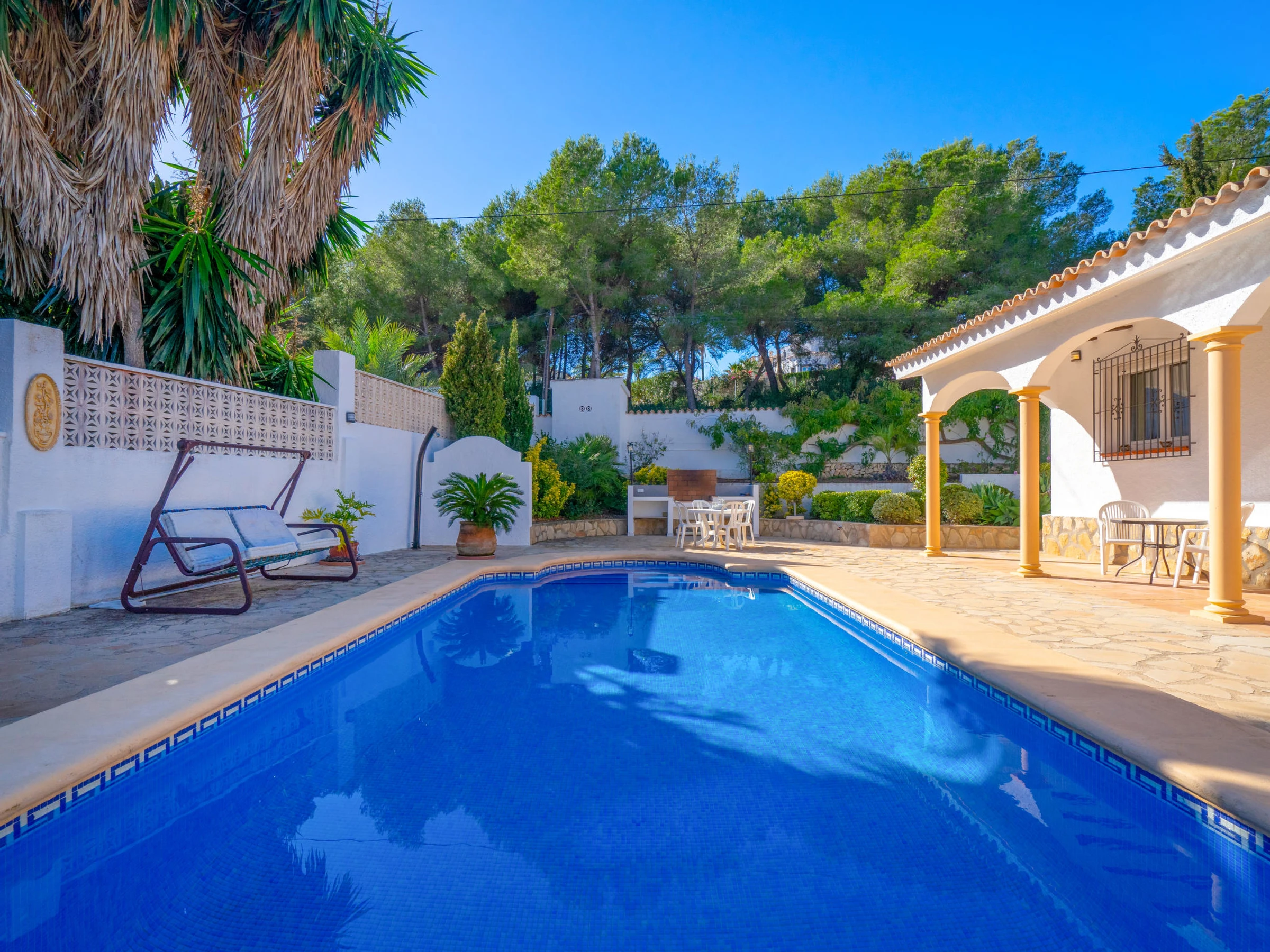Gemütliches Haus "Encinas". 1 km vom Zentrum von Moraira, ruhige, sonnige Lage, 1 km vom Meer, 1 km vom Strand, in einer Sackgasse. Zur Alleinbenutzung: Grundstück 800 m2 (eingezäunt), grosser, schöner, gepflegter Garten, Schwimmbad eckig (4 x 8 m, saisonale Verfügbarkeit: [hidden] - [hidden] mit Innentreppe. Aussendusche. Im Hause: Zentralheizung, Klimaanlage, Waschmaschine, Wäschetrockner. Parkplatz (für 2 Autos) auf dem Grundstück, Einzelgarage. Einkaufsgeschäft 1 km, Supermarkt 1 km, Restaurant 500 m, Bushaltestelle "Moraira" 1.4 km, Bahnstation "Teulada" 6.9 km, Fähre "Denia" 24.9 km, Sandstrand 1 km. Bitte beachten: Fahrzeug empfohlen. Geeignet für Familien. Der Besitzer akzeptiert keine Jugendgruppen.