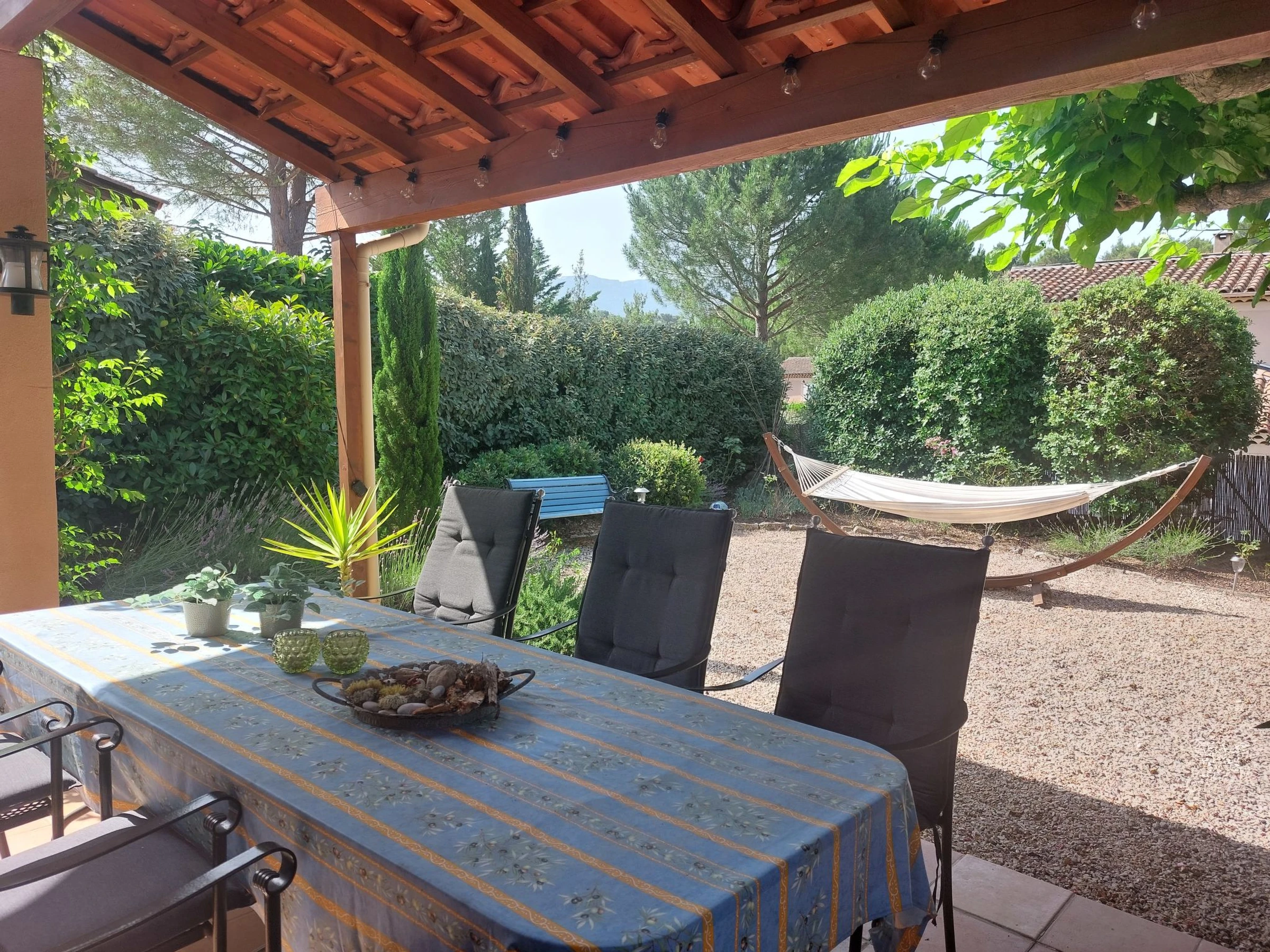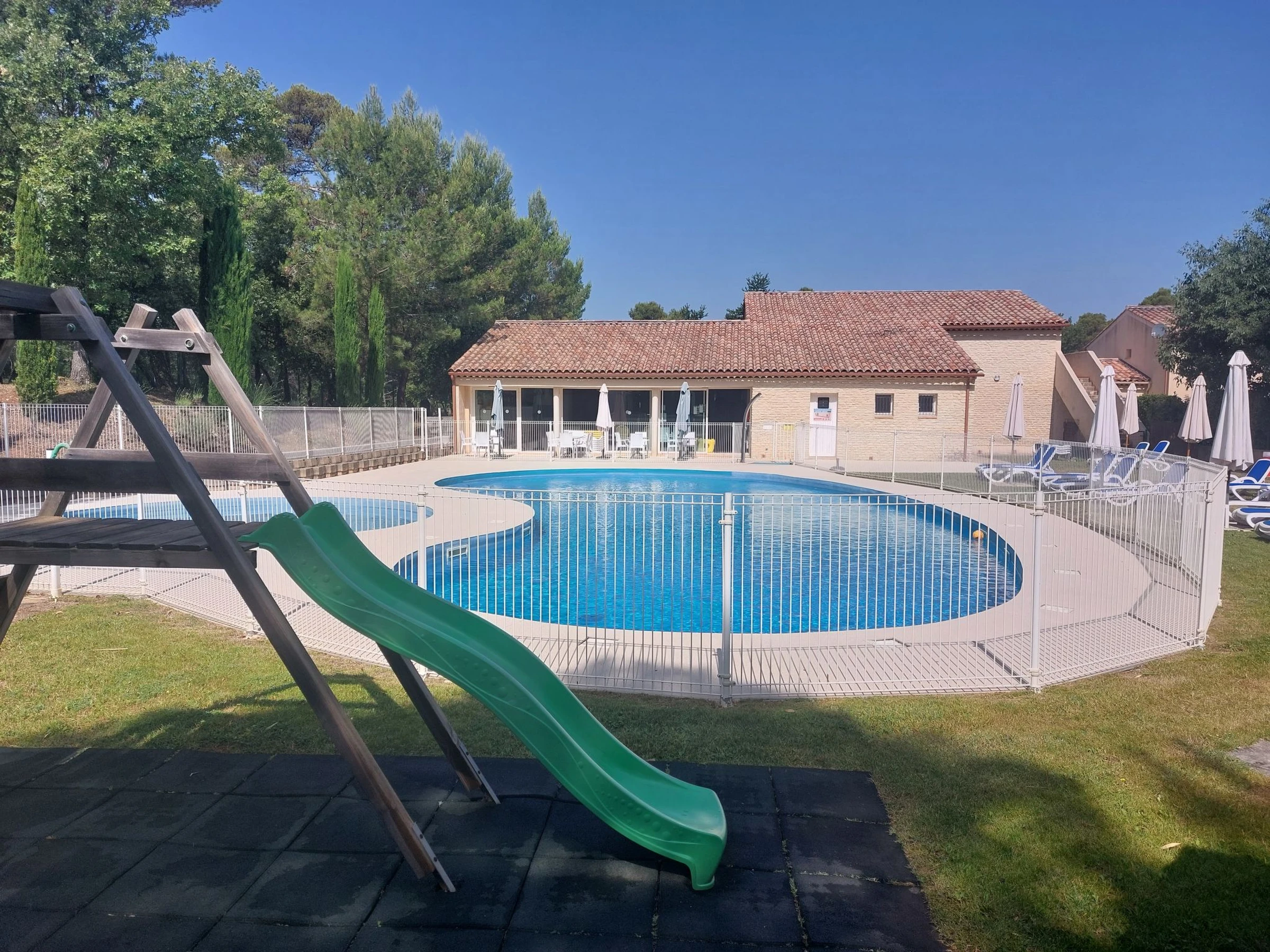 Residenz "Le Jardin du Golf". 59 Häuser in der Residenz. 2 km vom Zentrum von Nans les Pins, 11 km vom Zentrum von Saint Maximin La sainte Baume, 26 km vom Zentrum von Aubagne, 46 km vom Meer, 56 km vom See. Zur Mitbenutzung: Schwimmbad eingezäunt (saisonale Verfügbarkeit: [hidden] - [hidden] Tennis (2 x Hartbelag), Tischtennis, Boccia. In der Anlage: Empfang, Bar, Spielzimmer. Brötchenservice. Lebensmittelgeschäft 2 km, Restaurant 2 km, Café 2 km, Bushaltestelle 500 m, Sandstrand "Prado Marseille" 46 km. Golfplatz (18 Loch) 1.3 km. Nahe gelegene Sehenswürdigkeiten: Circuit du Castellet 55 km, Calanques de Cassis 41 km, Aix en Provence 51 km. Wandergebiete: Parc régional de La Sainte Beaume.