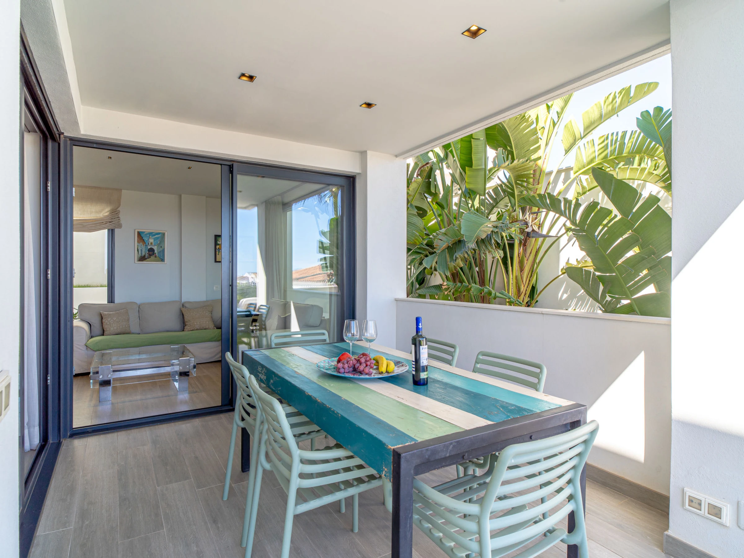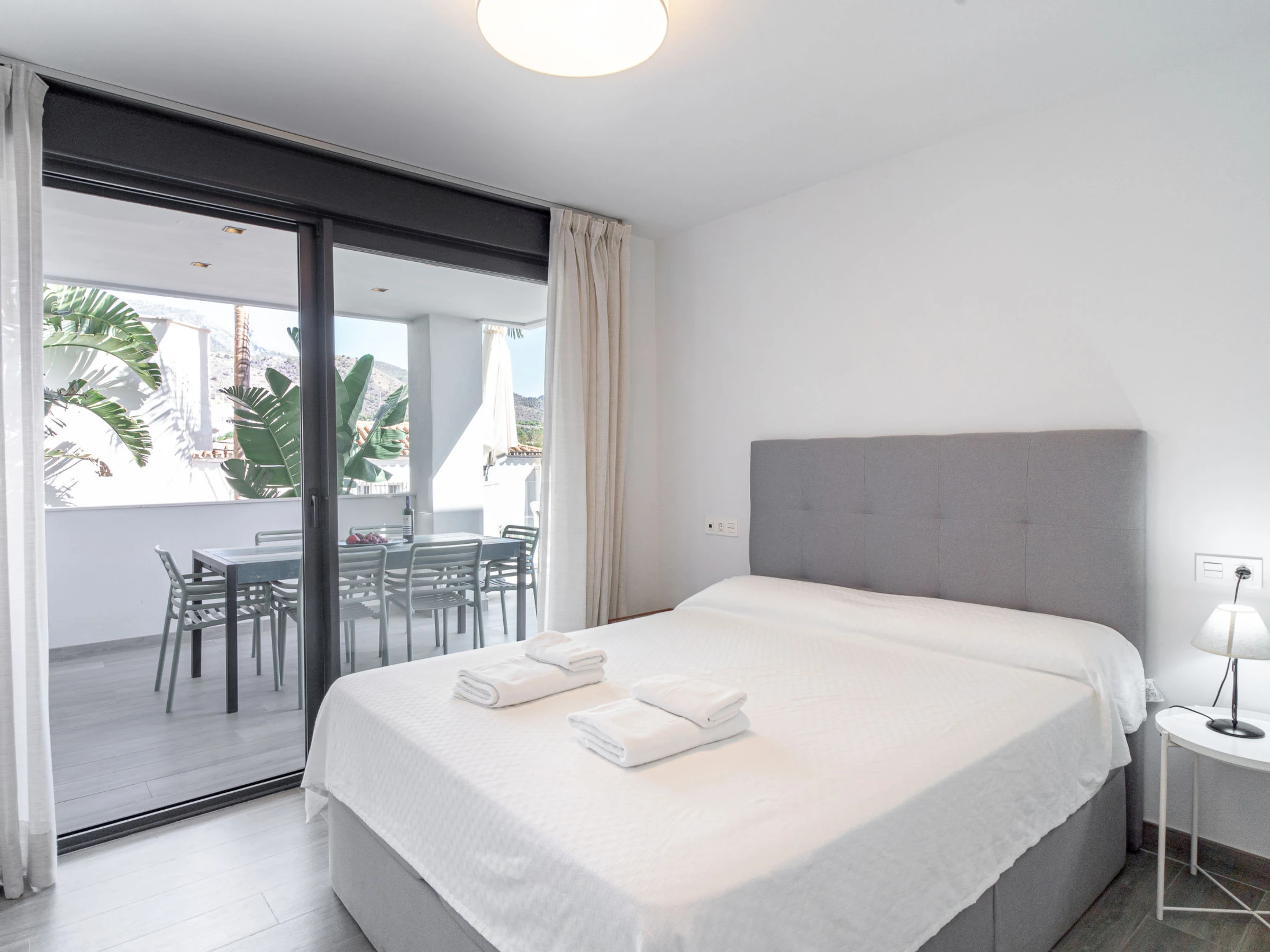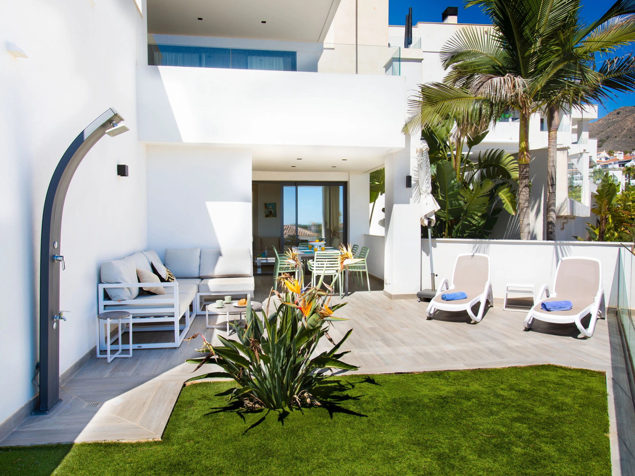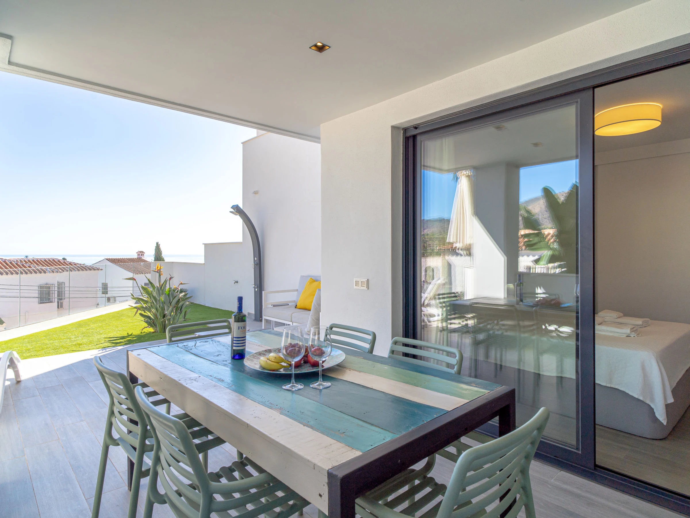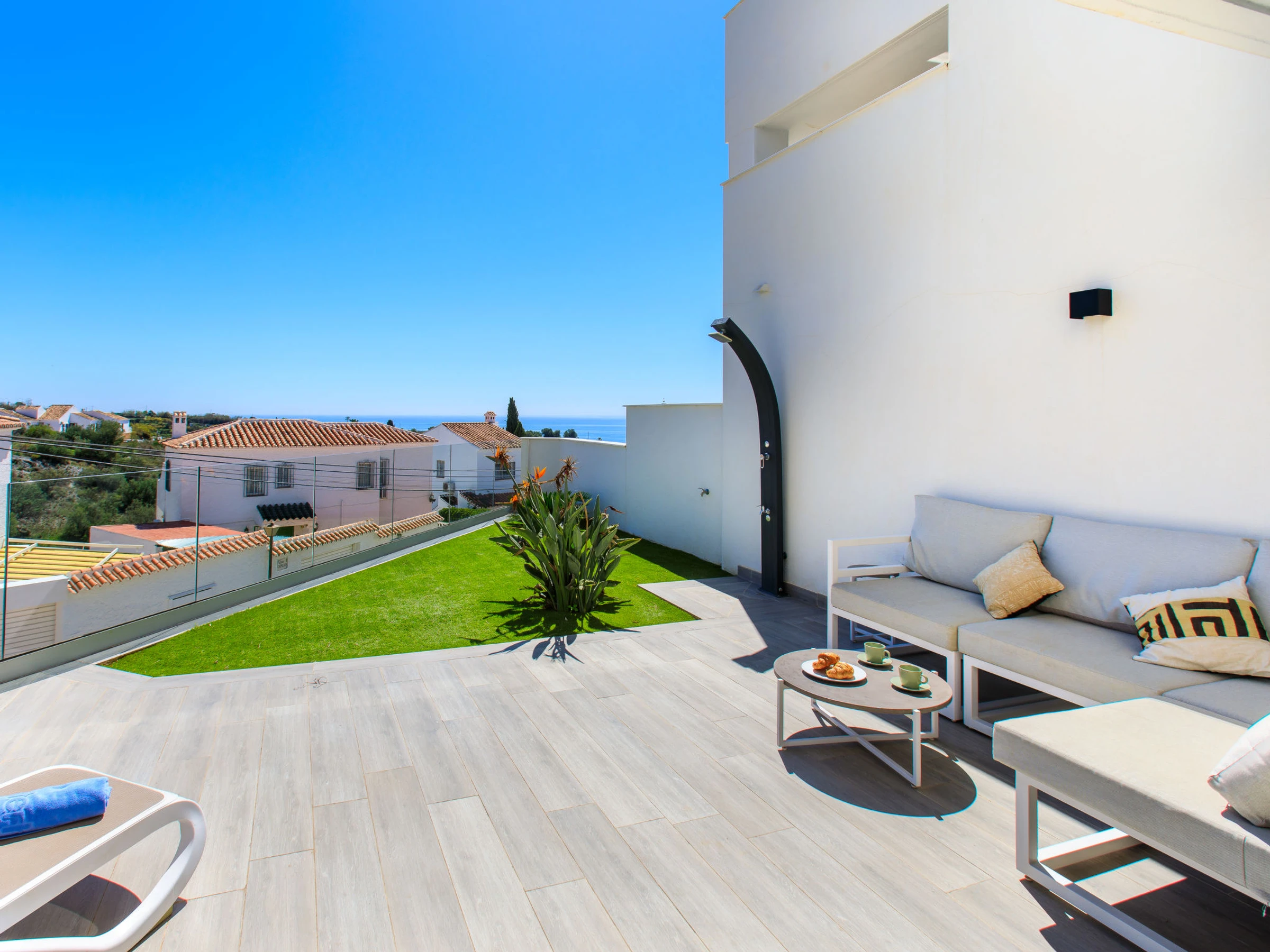"Royal Beach Nerja", 4-Zimmer-Doppelhaushälfte 120 m2, Südlage. Hell, komfortabel und modern eingerichtet: Wohn-/Esszimmer mit Esstisch, TV, Internationale TV-Sender, Klimaanlage und Warmluftheizung. Ausgang zum Gartensitzplatz. 1 Zimmer mit 2 Betten (90 cm, Länge 190 cm), Klimaanlage und Warmluftheizung. 1 Zimmer mit 2 Betten (90 cm, Länge 190 cm), Klimaanlage und Warmluftheizung. 1 Zimmer mit 1 franz. Bett (150 cm, Länge 190 cm), Dusche/WC (privat) Klimaanlage, Warmluftheizung und elektrischem Rollladen. Ausgang zum Gartensitzplatz. Offene Küche (Backofen, Geschirrspüler, 3 Induktionskochplatten, Toaster, Wasserkocher, Mikrowelle, Tiefkühler, elektrische Kaffeemaschine) mit Bar. Dusche/WC. E-Heizung. Parkettboden. Grosse Terrasse. Terrassenmöbel, Gartengrill, Liegestühle. Seitliche Sicht auf das Meer und die Berge. Zur Verfügung: Waschmaschine, Bügeleisen, Kinderhochstuhl, Babybett bis 3 Jahre, Haartrockner. Internet (WLAN, gratis). Geeignet für Familien. [hidden] // Reg. Nr.: ESFCTU0000290130010852540000000000000000VFT/MA/510758