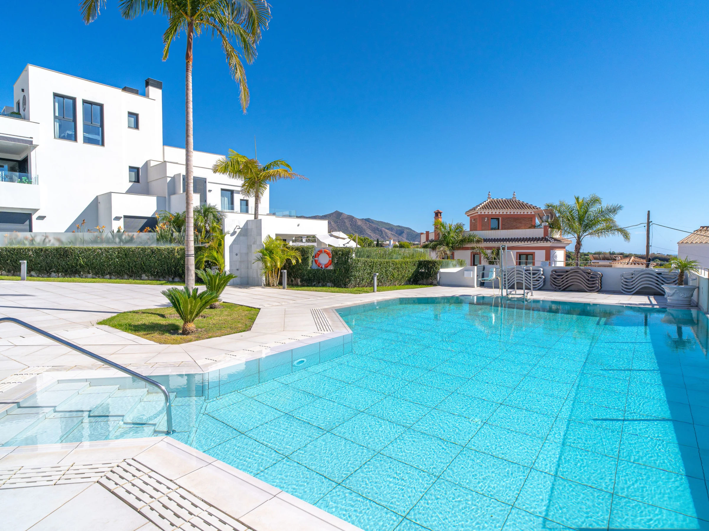 Nerja: Modernes, schönes, komfortables Haus "Royal Beach Nerja", einseitig angebaut. Im Ort, 1.5 km vom Zentrum von Nerja, im Villenviertel, 500 m vom Meer, 500 m vom Strand, Richtung Süden. Zur Mitbenutzung: Hof, Schwimmbad (5 x 10 m, 97 - 162 cm tief, saisonale Verfügbarkeit: [hidden] - [hidden] Aussendusche. Zur Alleinbenutzung: kleiner Garten, Parkplatz. Einkaufsgeschäft, Supermarkt, Einkaufszentrum 20 km, Restaurant 300 m, Bäckerei 300 m, Café, Fußgängerzone 1.5 km, Fahrradverleih 500 m, Biergarten 300 m, Bushaltestelle 150 m, Bahnstation "Málaga" 52 km, Fähre "Málaga" 52 km, Sandstrand "Burriana" 500 m, Tauchzentrum, Thermalbad 200 m. Sporthafen 17 km, Jacht-Hafen 17 km, Surfschule 17 km, Segelschule 17 km, Tennis 200 m, Sportzentrum. Nahe gelegene Sehenswürdigkeiten: Frigilian, Torre del Mar, La Herradura, Granada, Málaga, Ronda. Bekannte Skigebiete sind gut erreichbar: Sierra Nevada. Wandergebiete: Sierra Almijara, Sierra Tejeda. Der Besitzer akzeptiert keine Gruppen. Bitte beachten: Be- und Entladen am Ferienhaus möglich. Ferienwohnung Ref. ES5405.691.1 befindet sich auf dem gleichen Grundstück.