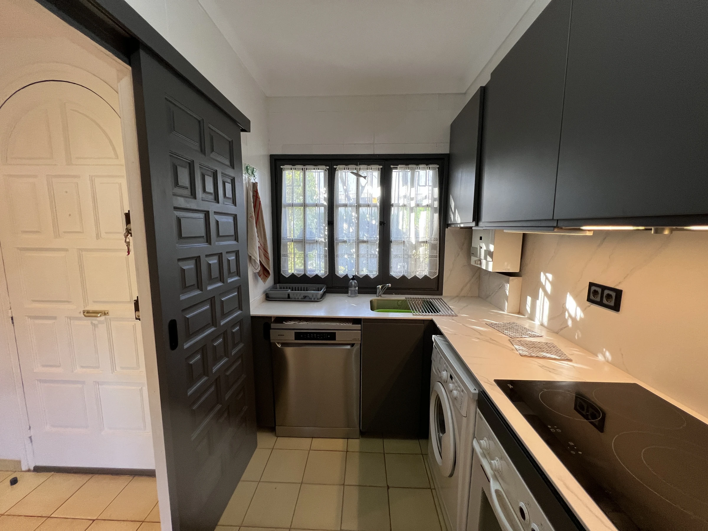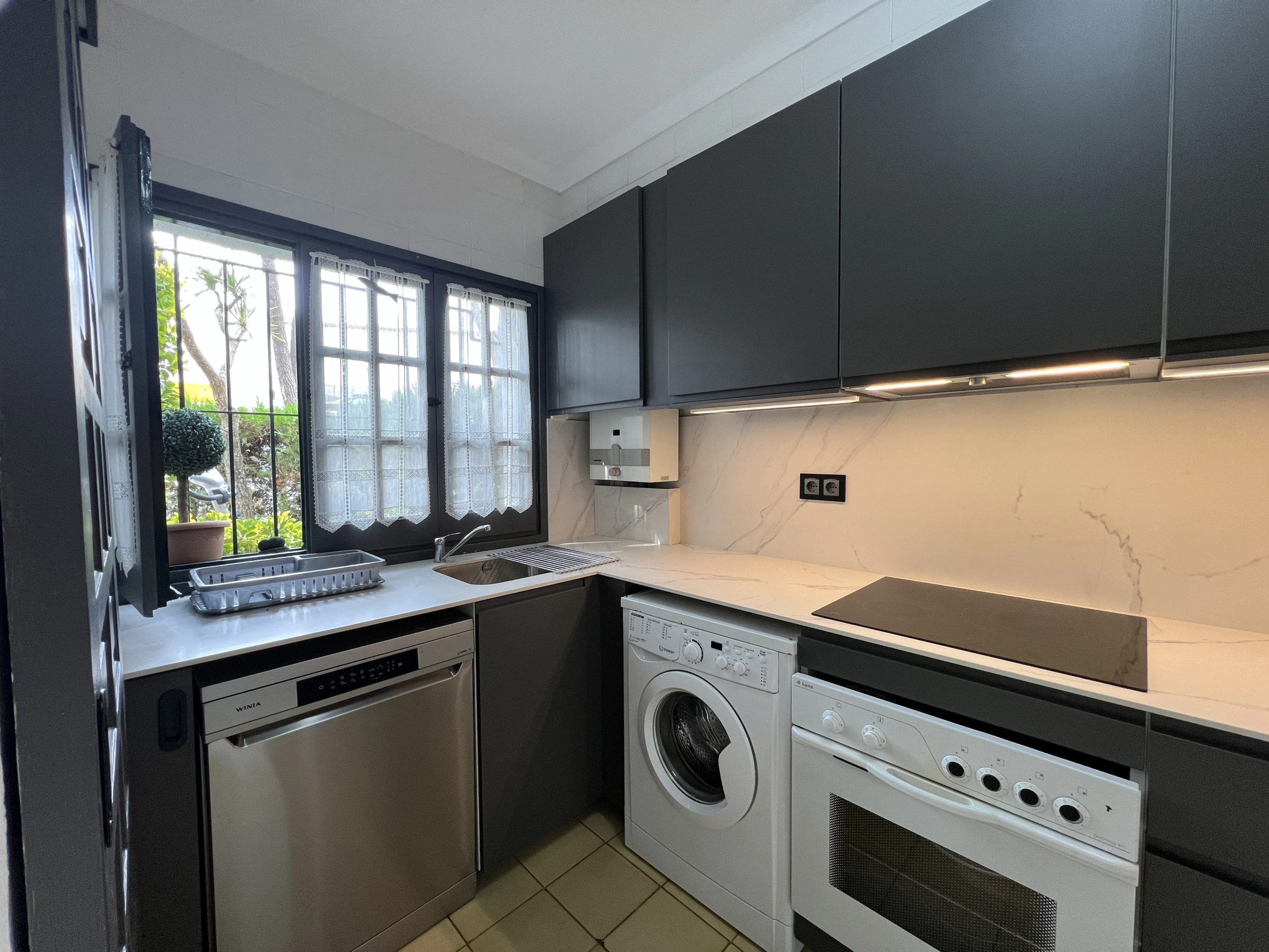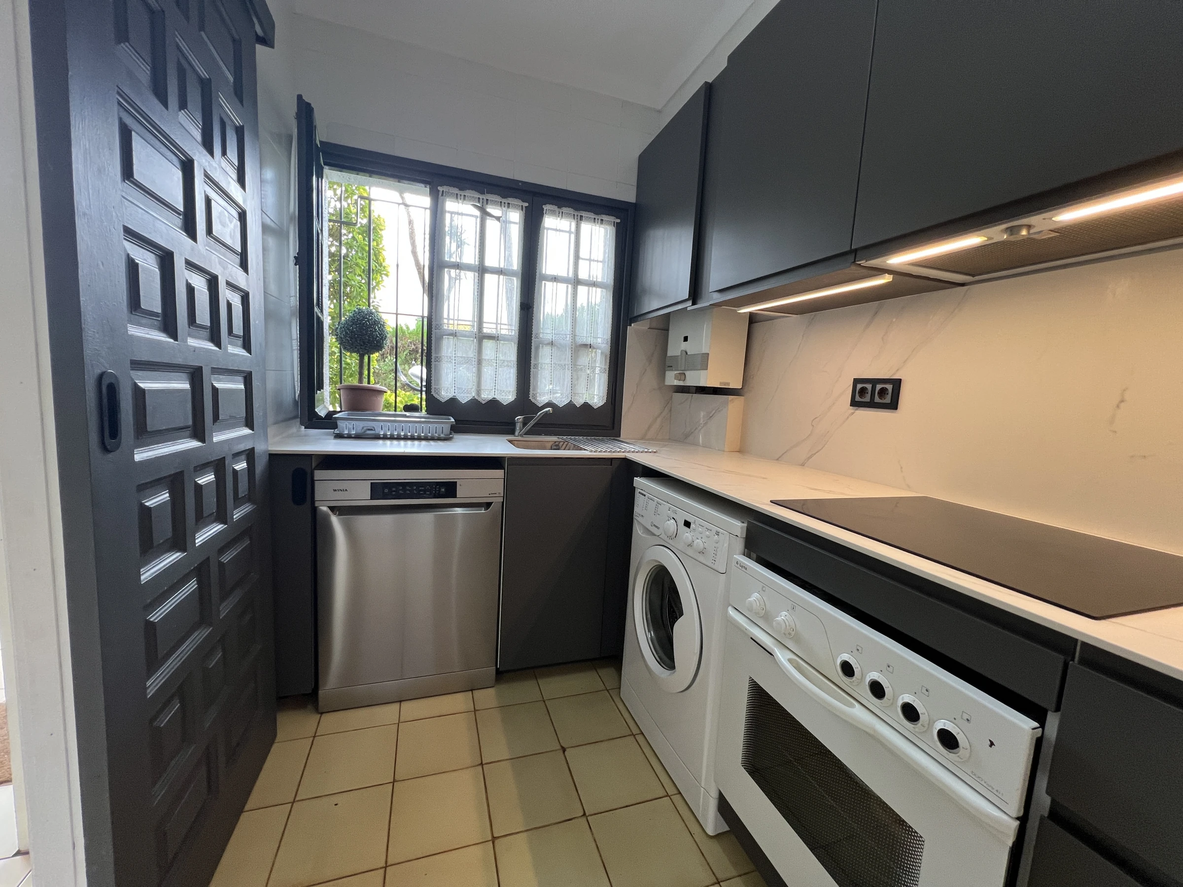 Die unabhängige Gas-Küche ist gut ausgestattet mit einem Kühlschrank, Mikrowelle, Backofen, Waschmaschine, Geschirrspüler, Geschirr, Kochutensilien, Kaffeemaschine und Toaster. Im Garten finden Sie auch einen Grill, wo Sie das gute Wetter in Ruhe und Privatsphäre genießen können.