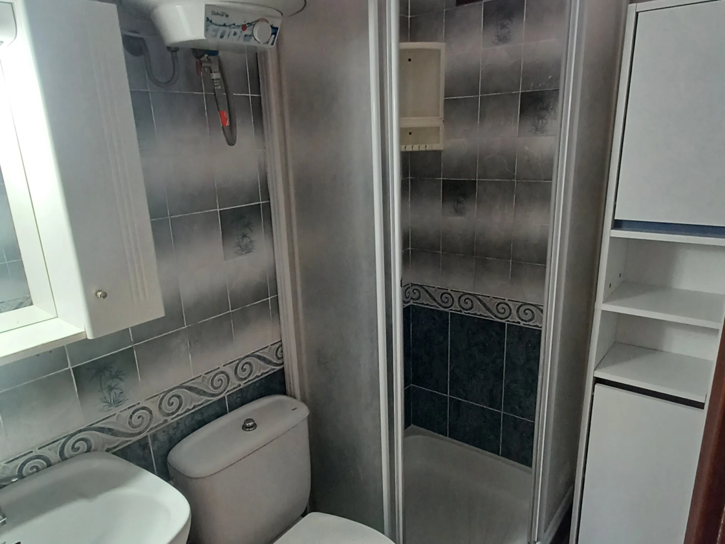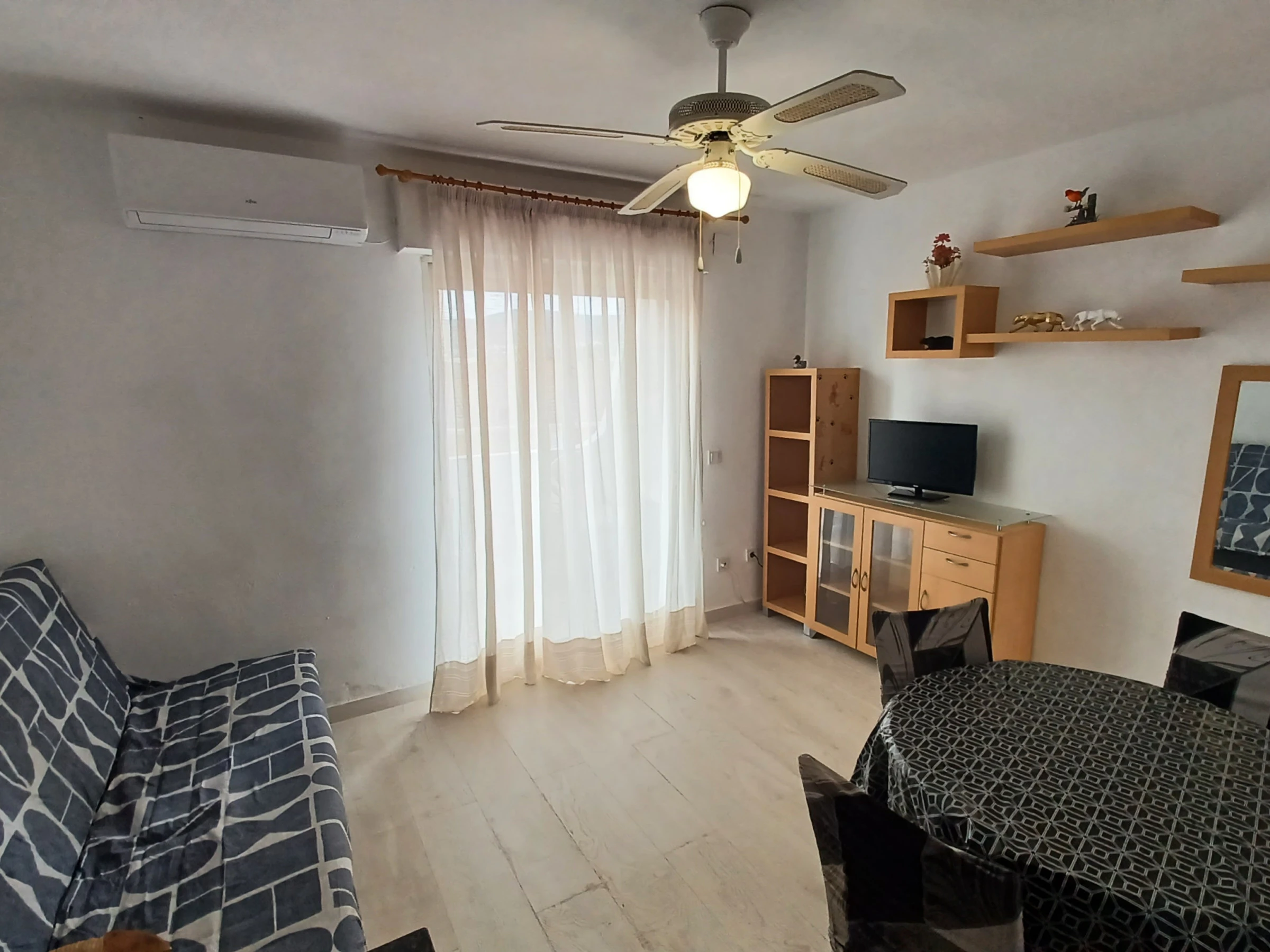 Die Wohnung verfügt über ein Zimmer, das mit einem Doppelbett und einem zusätzlichen Schlafsofa ausgestattet ist, ideal zur Maximierung des Raums. Es gibt ein vollständiges Badezimmer mit Dusche, Klimaanlage und Wärmepumpenheizung im Wohnzimmer, um Ihren Komfort in jeder Jahreszeit zu gewährleisten.