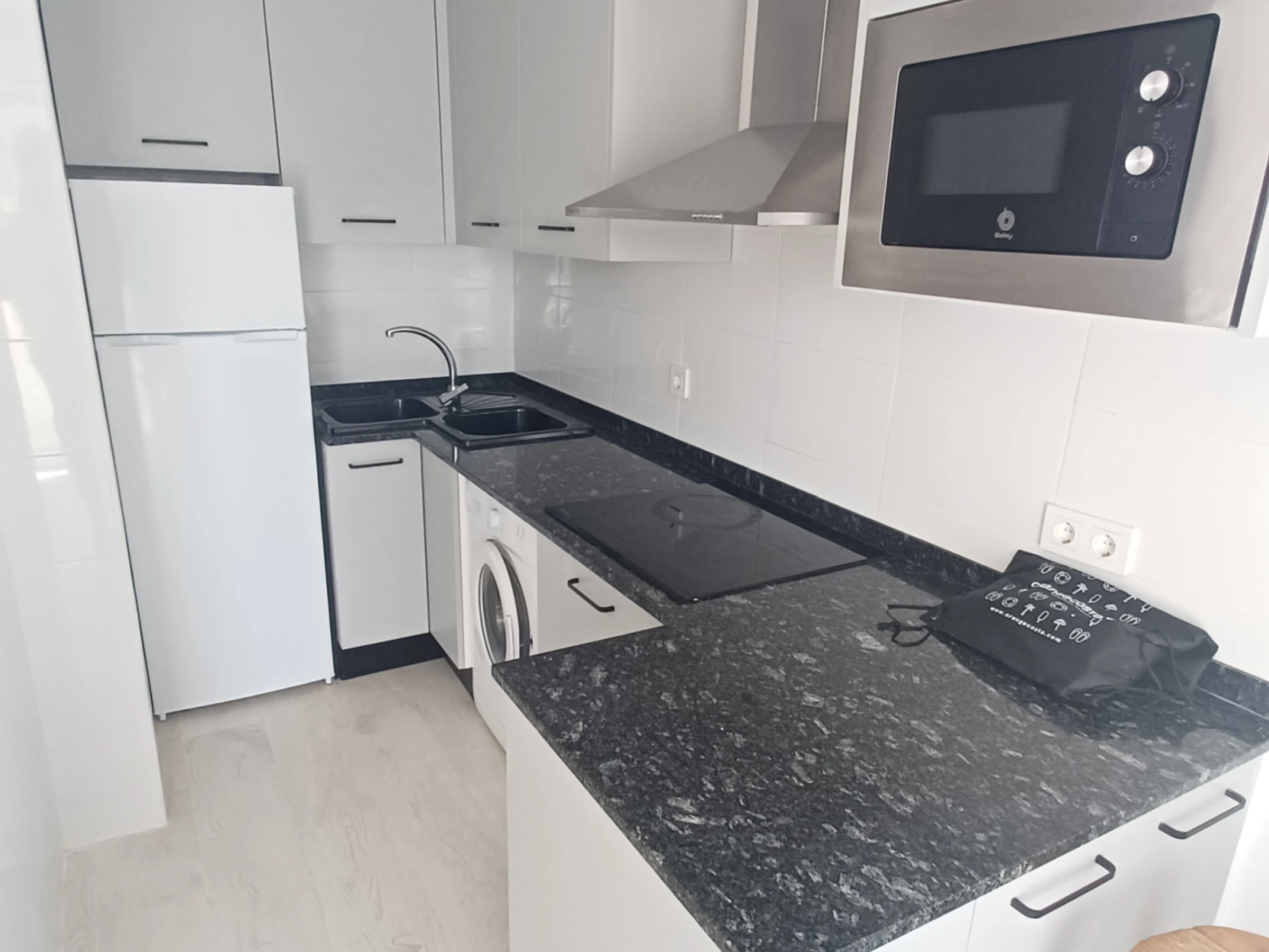 Die amerikanische Küche ist komplett ausgestattet mit Glaskeramikkochfeld, Kühlschrank, Gefrierschrank, Waschmaschine, Kaffeemaschine, Mikrowelle und allen notwendigen Utensilien, um köstliche Mahlzeiten zuzubereiten. Darüber hinaus verfügt sie über einen Fernseher für Unterhaltungsmomente.