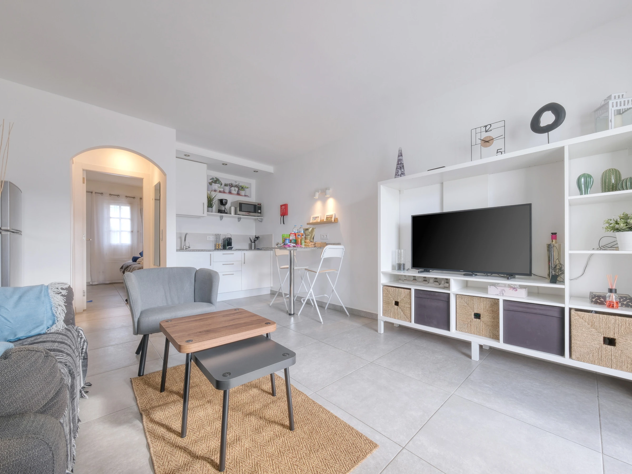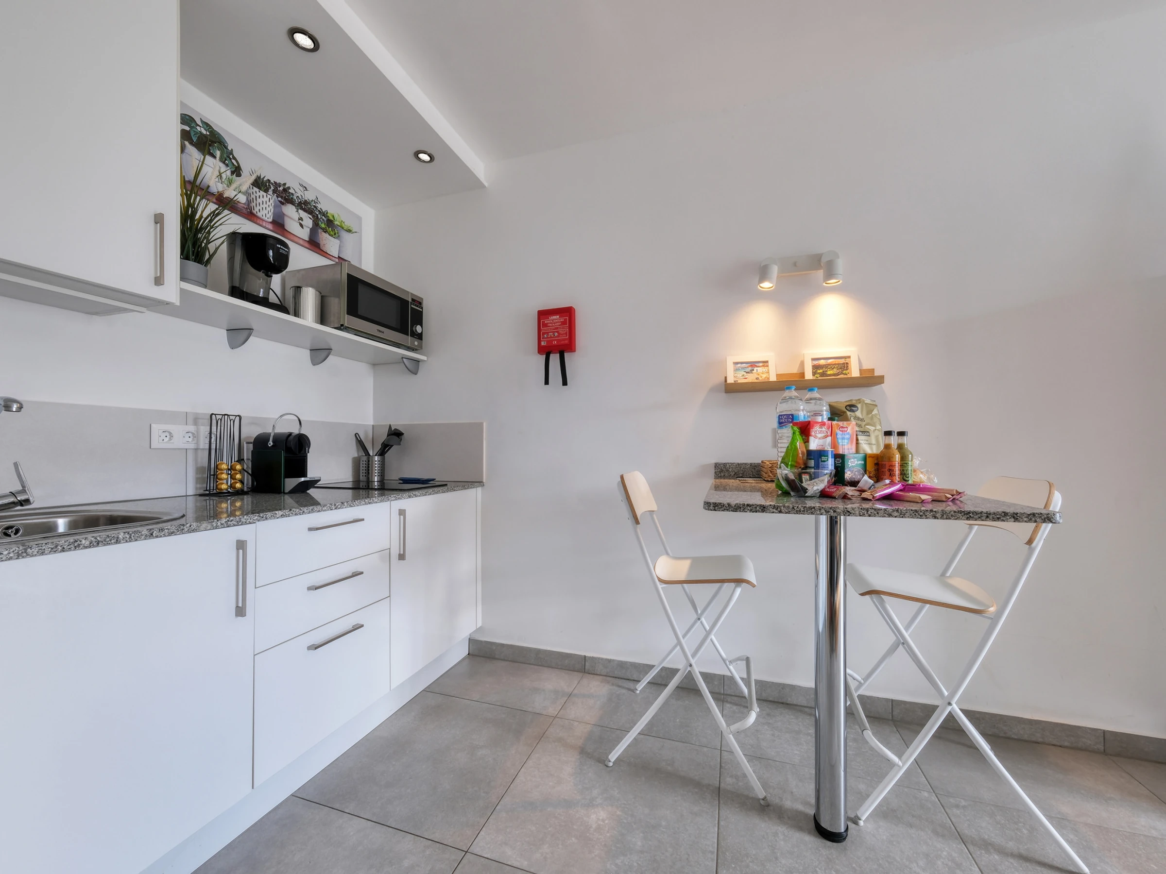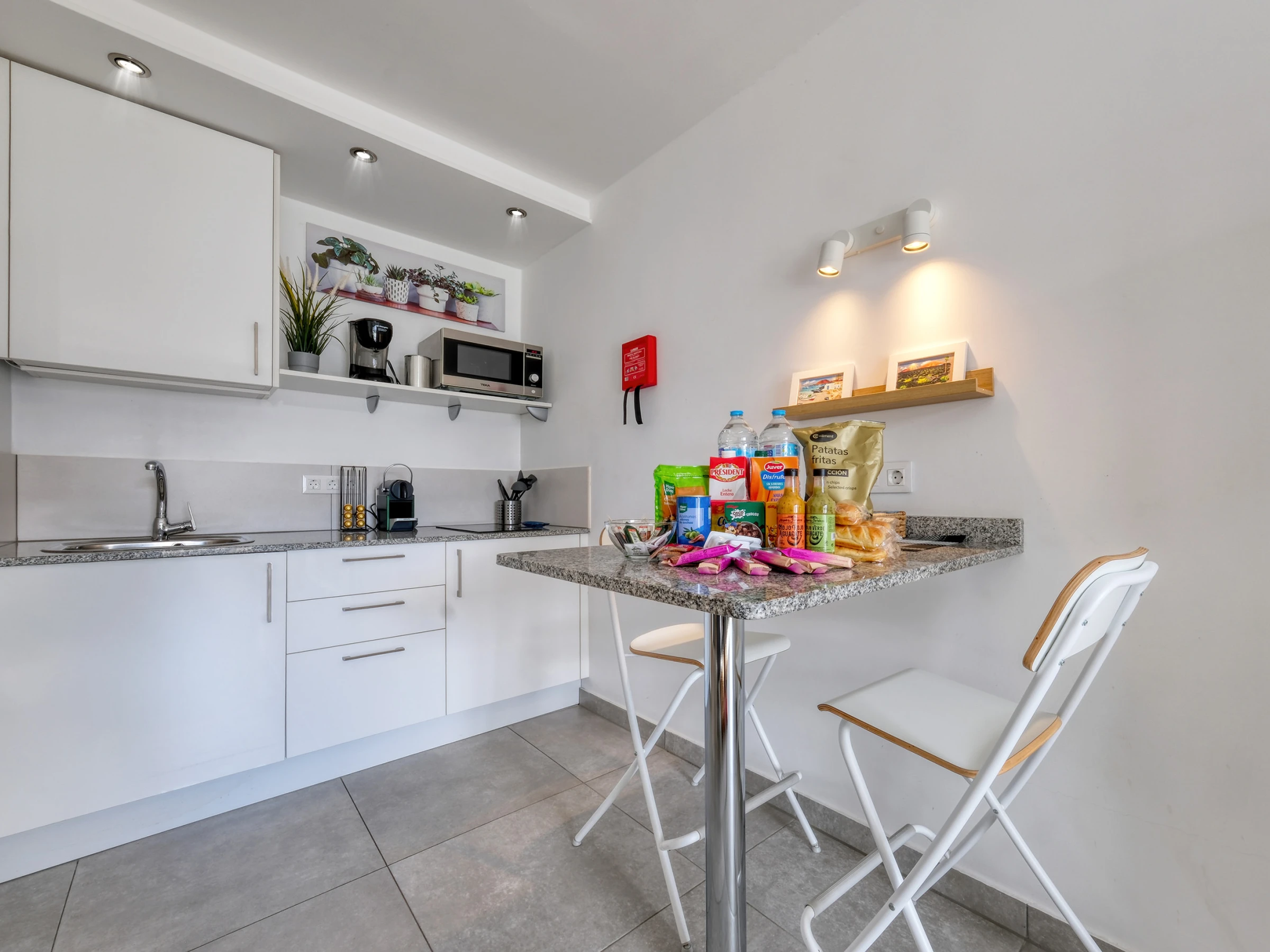 Es verfügt über ein lichtdurchflutetes Wohnzimmer mit integrierter Küche, die vollständig ausgestattet ist mit Kühlschrank, Mikrowelle und allem Notwendigen für einen komfortablen Aufenthalt.